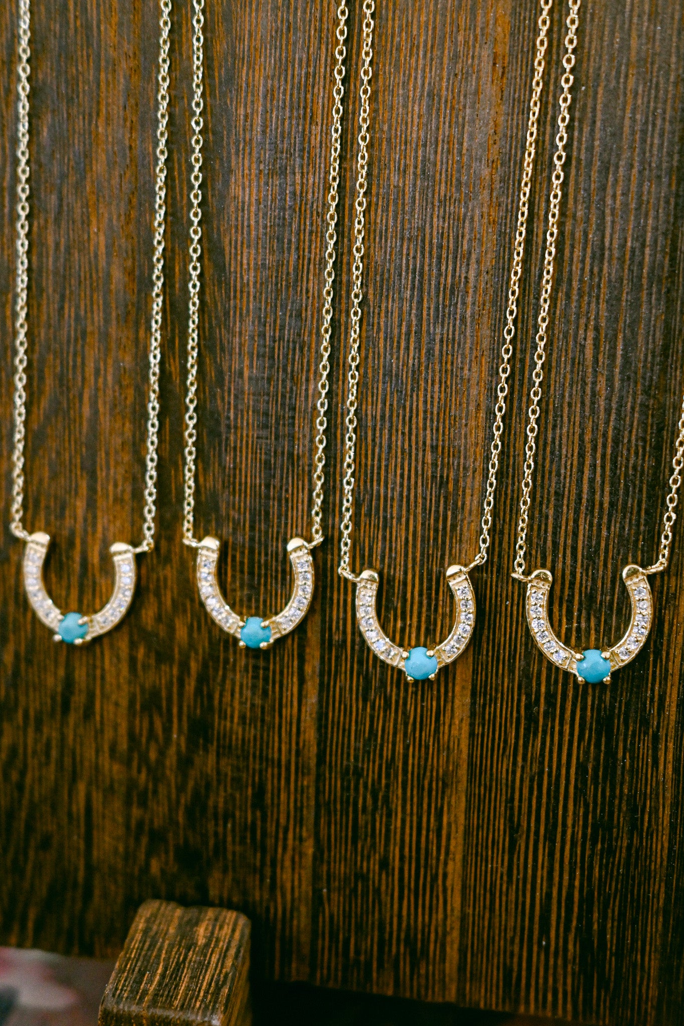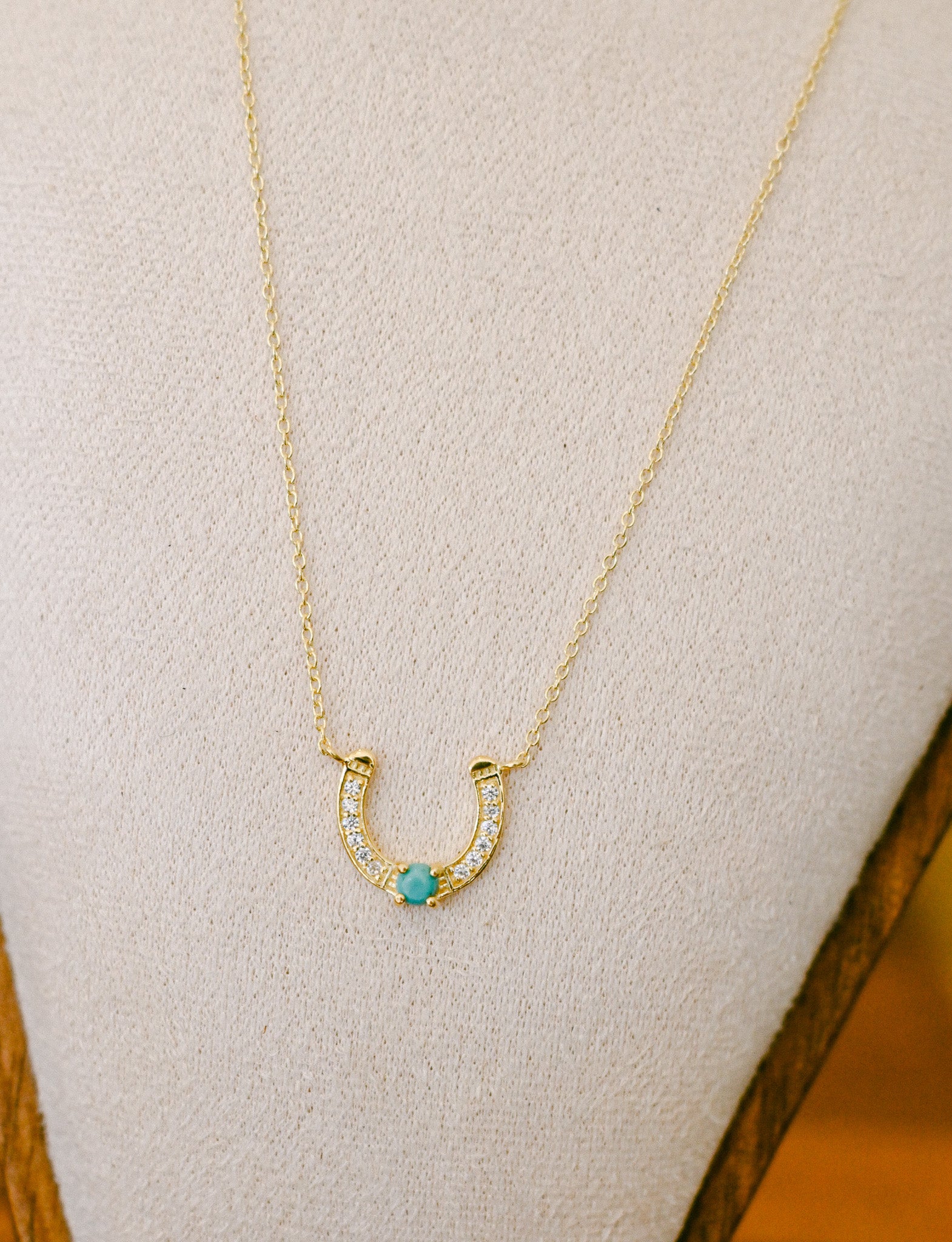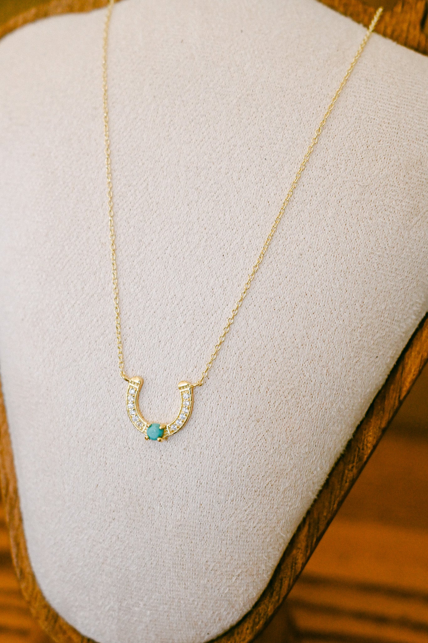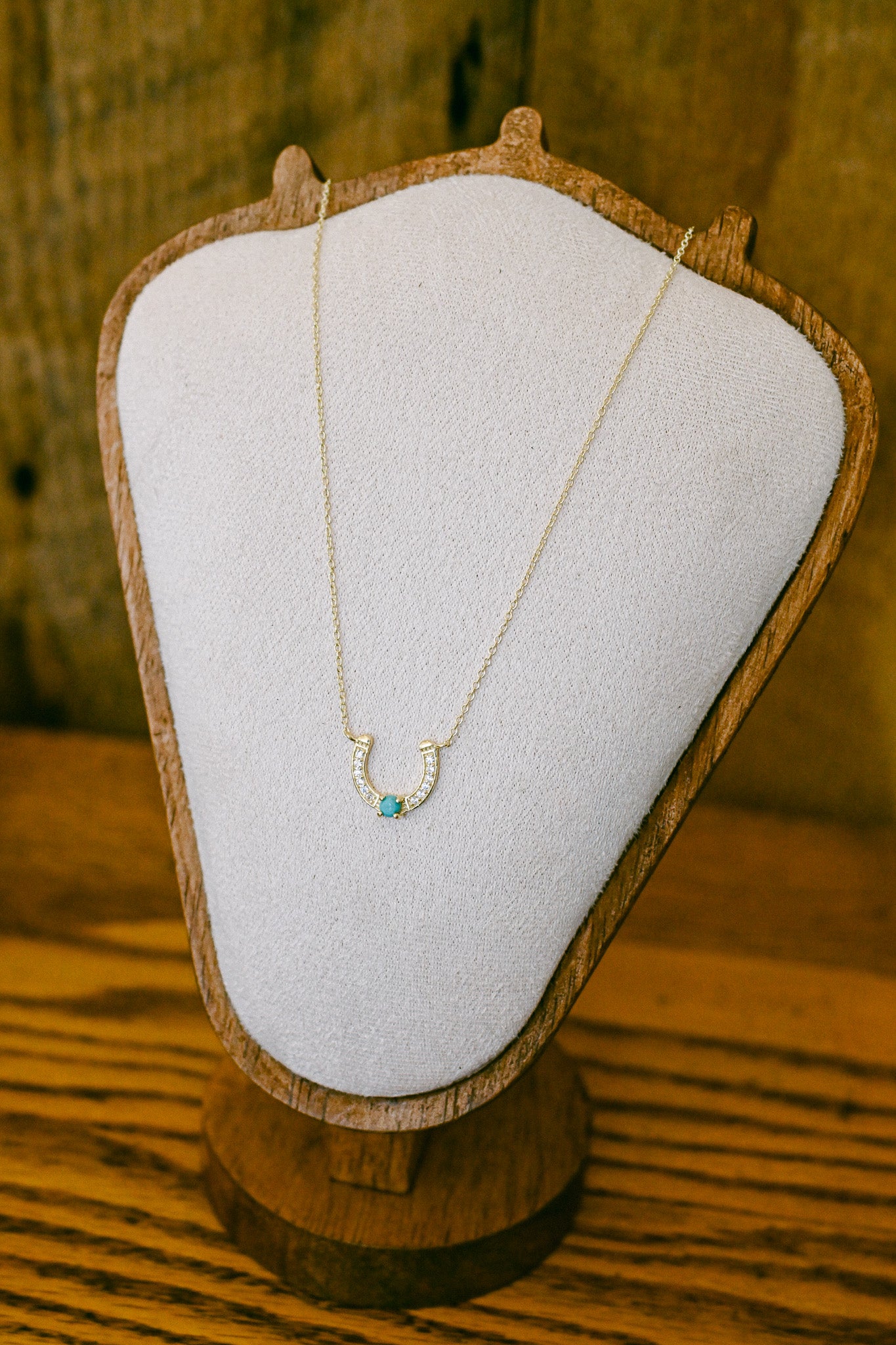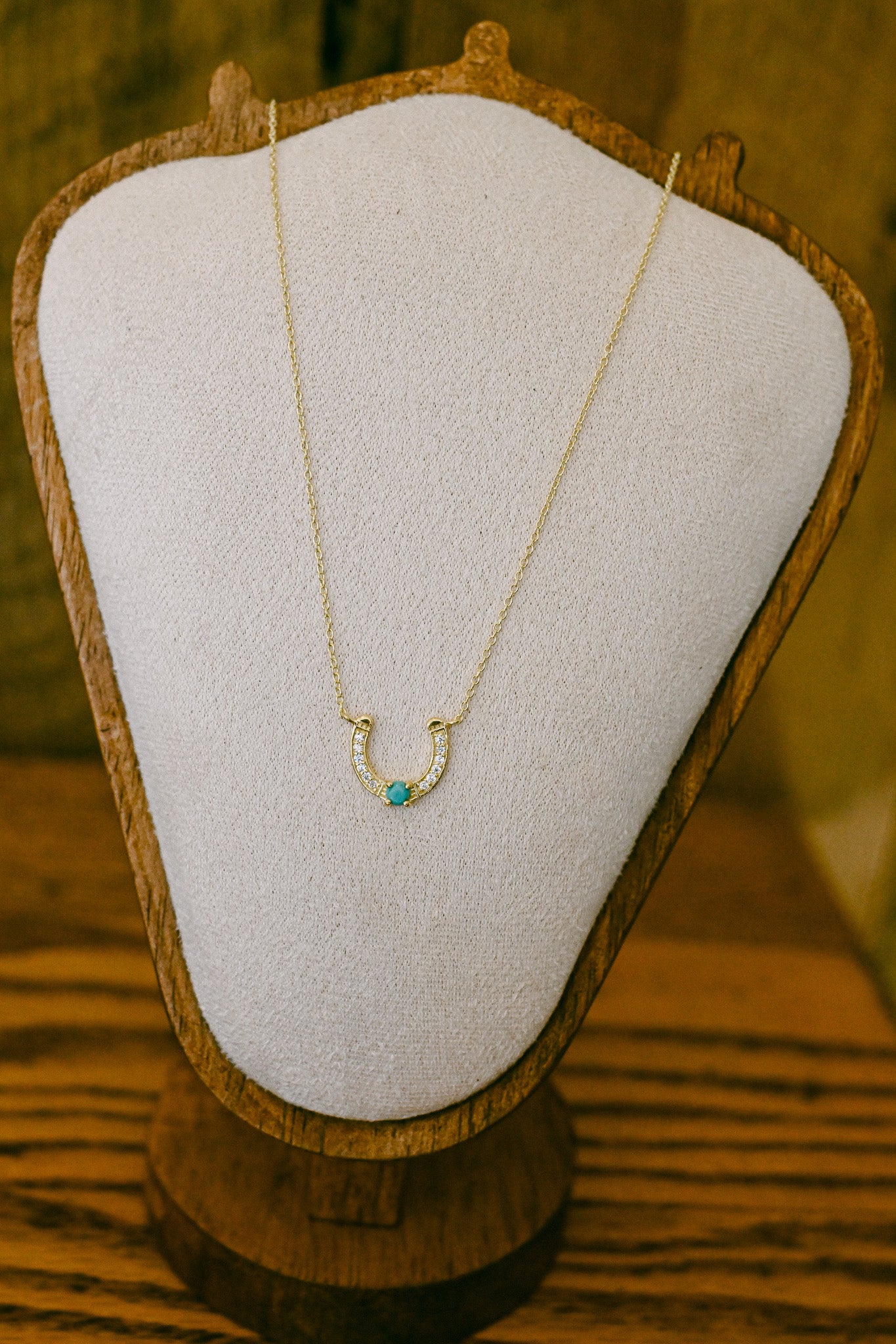 This beautiful and delicate necklace is a 14 karat gold plated 18" chain with a horseshoe pendant featuring crystals and Kingman turquoise. The chain has a 2" extender for extra length.