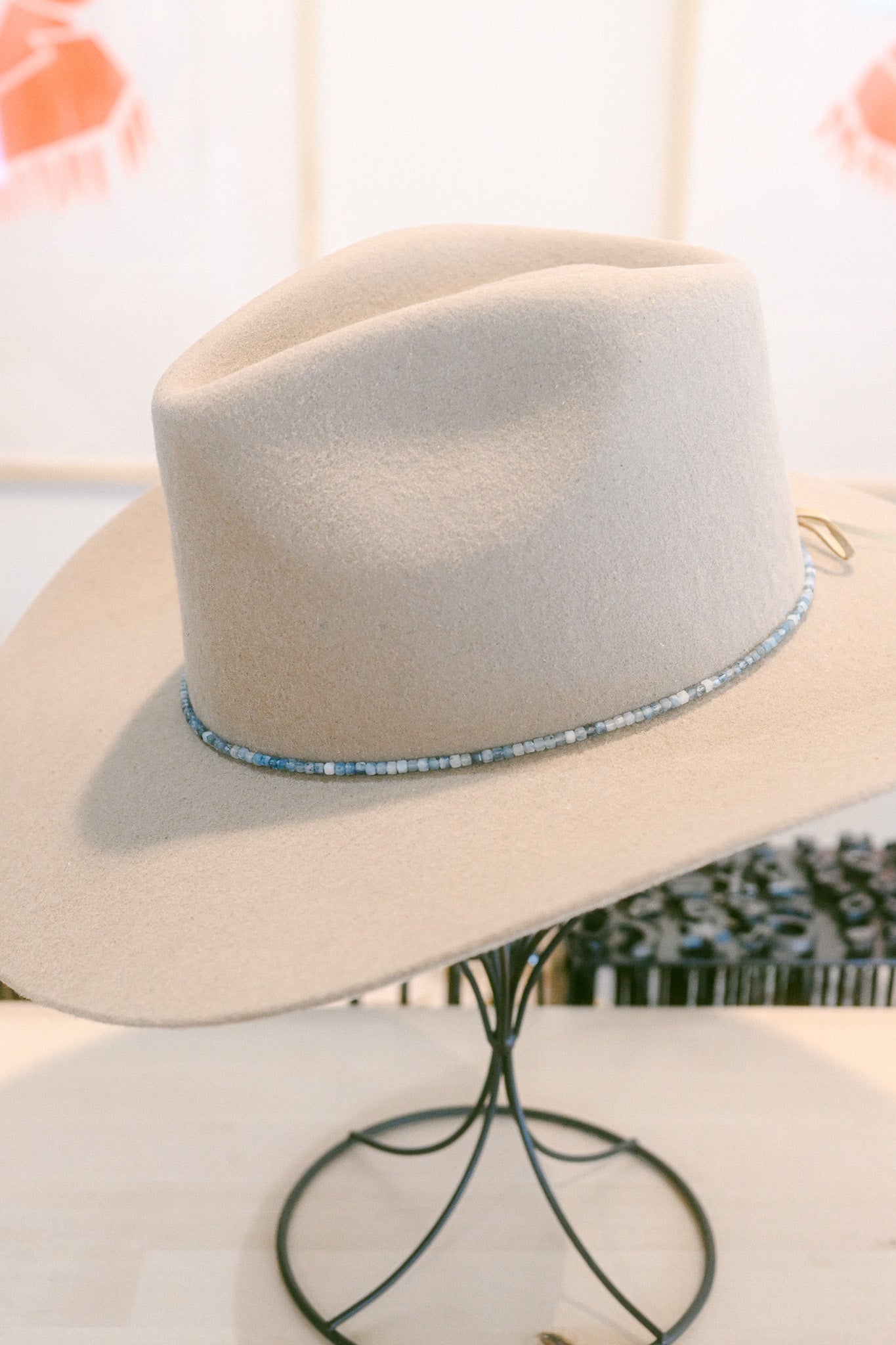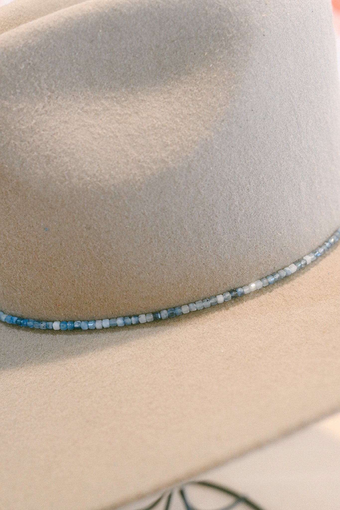 Grade A devil blue aquamarine gemstone hat band, with 21 inches of 3mm microfaceted cube stones, and 9 inches of deerskin ties on either side for an adjustable fit that works for any hat size. With gold and brass hardware and a brass logo tag. Handmade in house at The Mercantile Ouray.