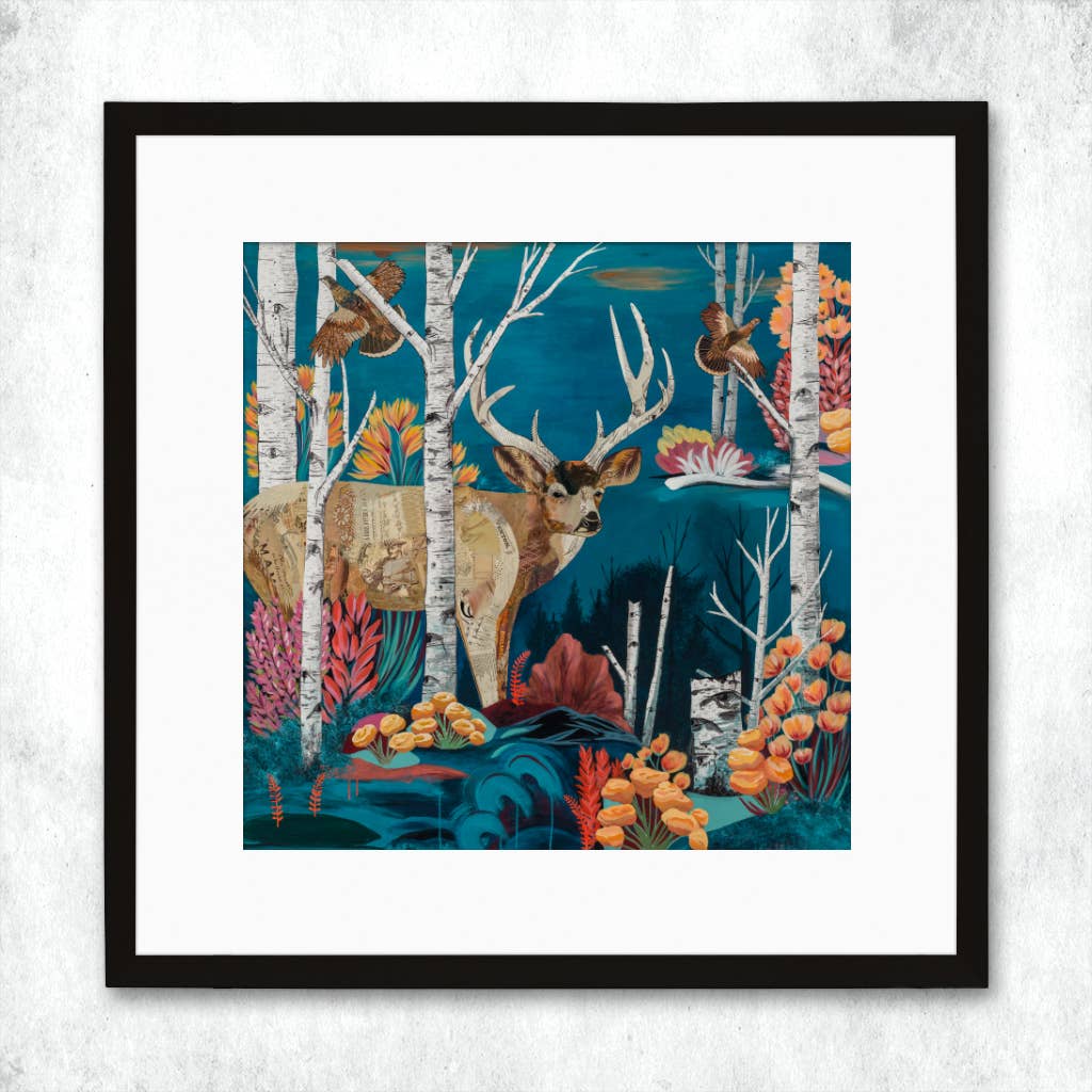 Limited edition giclée print by Denver artist Dolan Geiman featuring a mule deer in the aspen trees. Each print is a detailed reproduction of an original Geiman paper collage printed on matte art paper, signed and numbered. Each original paper collage was constructed from reclaimed, upcycled materials. Mule deer mountain home decor wall art.