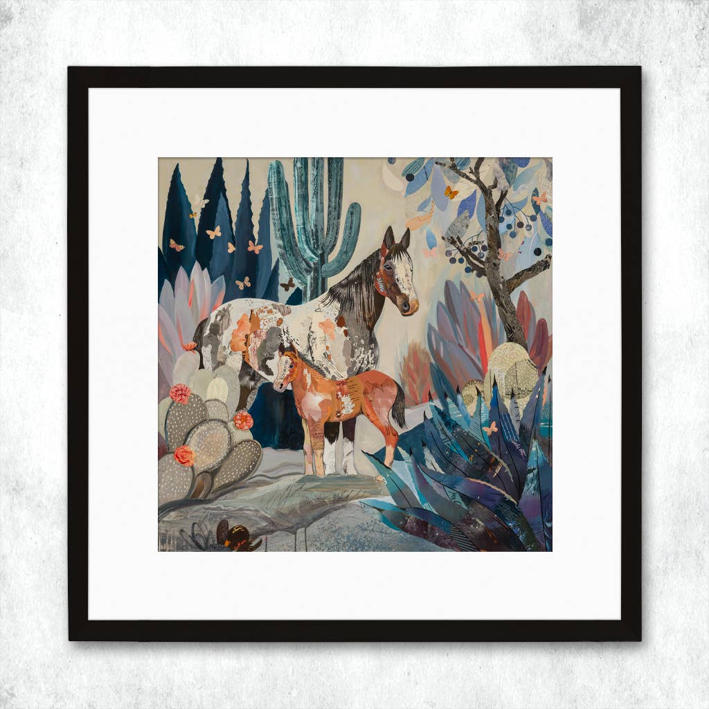 Limited edition giclée print by Denver artist Dolan Geiman featuring an appaloosa horse in a desert landscape. Each print is a detailed reproduction of a paper collage printed on matte art paper, signed and numbered. Each original paper collage was constructed from reclaimed, upcycled materials. Appaloosa horse Southwestern landscape home decor wall art. Desert and cactus.