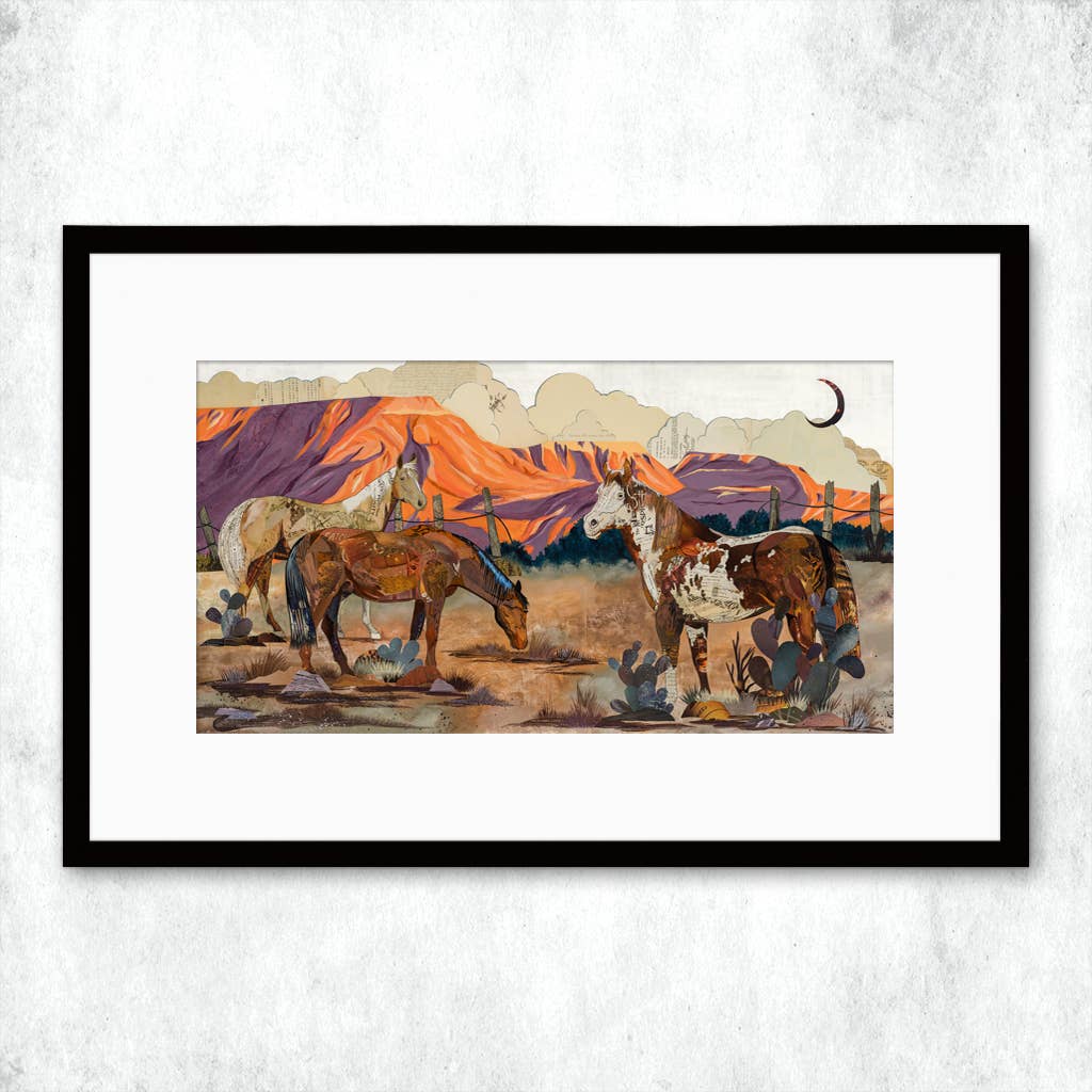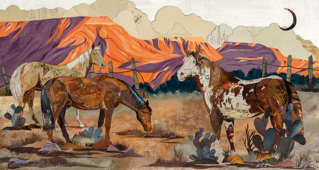Limited edition giclée print by Denver artist Dolan Geiman. Each print is a detailed reproduction of an original Geiman paper collage printed on matte art paper, signed and numbered. Each original paper collage was constructed from reclaimed, upcycled materials. Palamino, paint and quarter horses animal landscape wall art. Grand Mesa Valley.