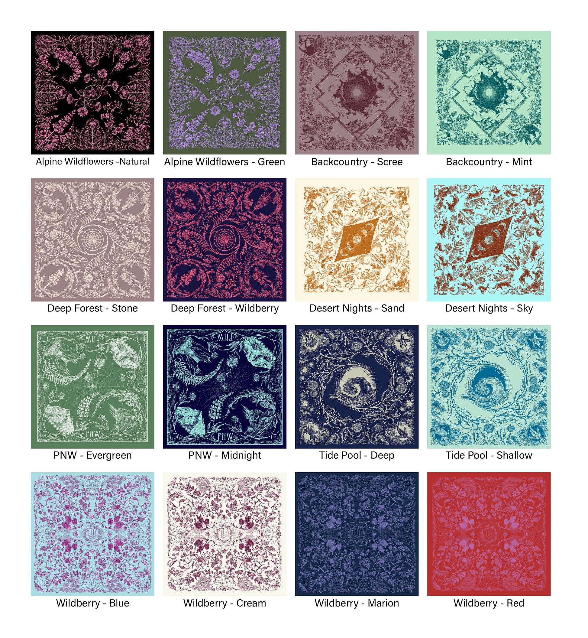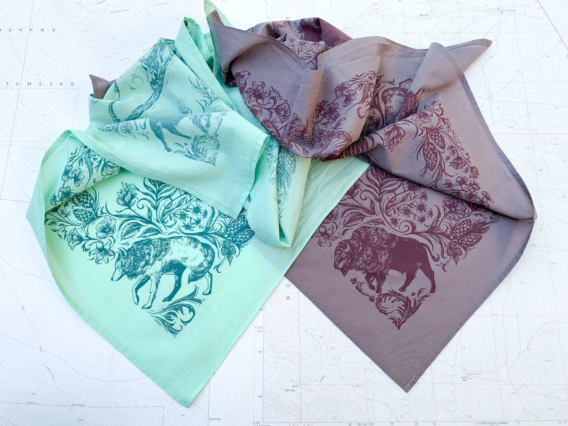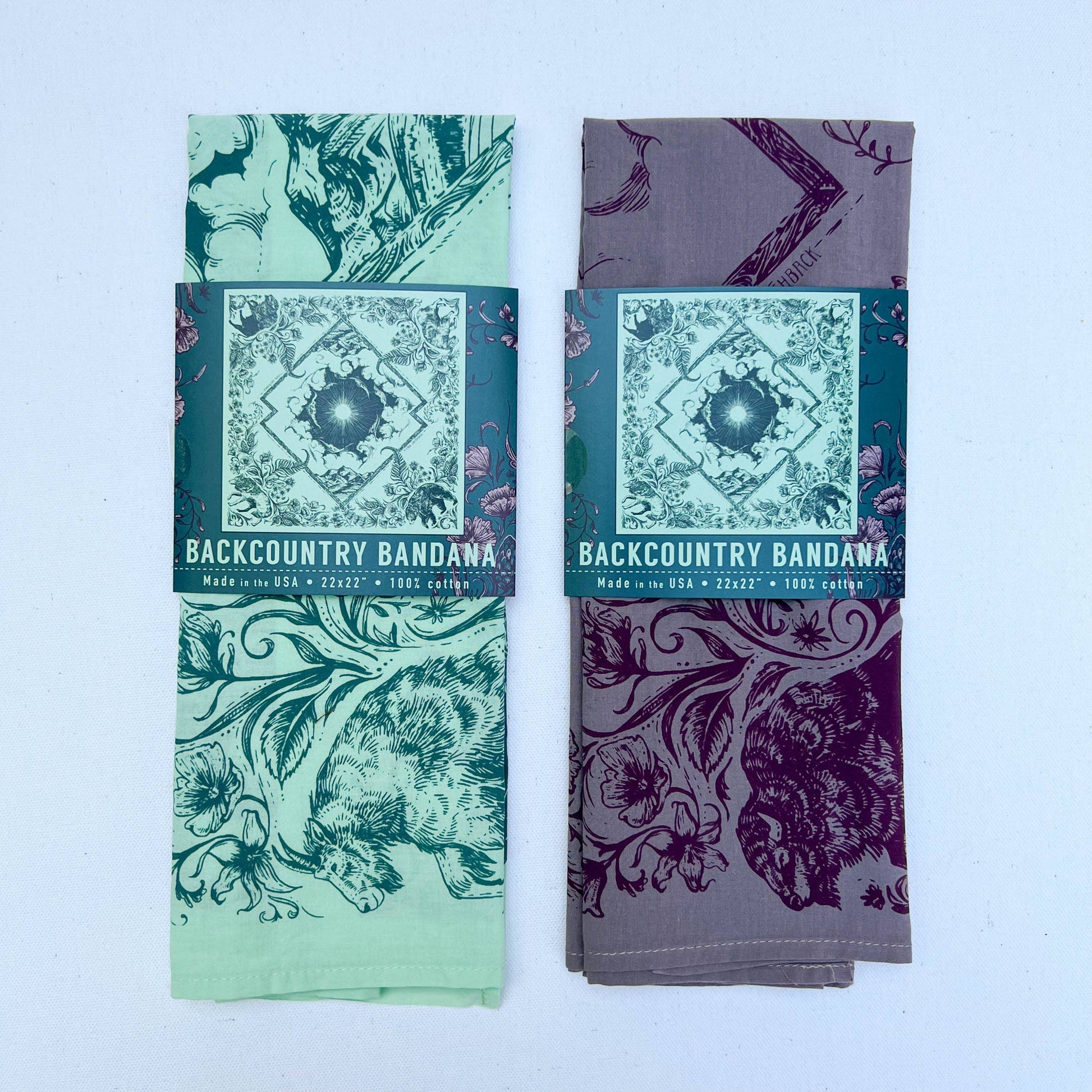 This premium quality, super soft bandana features some of the best of the backcountry; bear, mountain goat, bison, wolf, wildflowers, and mountains. Perfect for outdoor and mountain retailers, hikers, backpackers and mountain bikers.