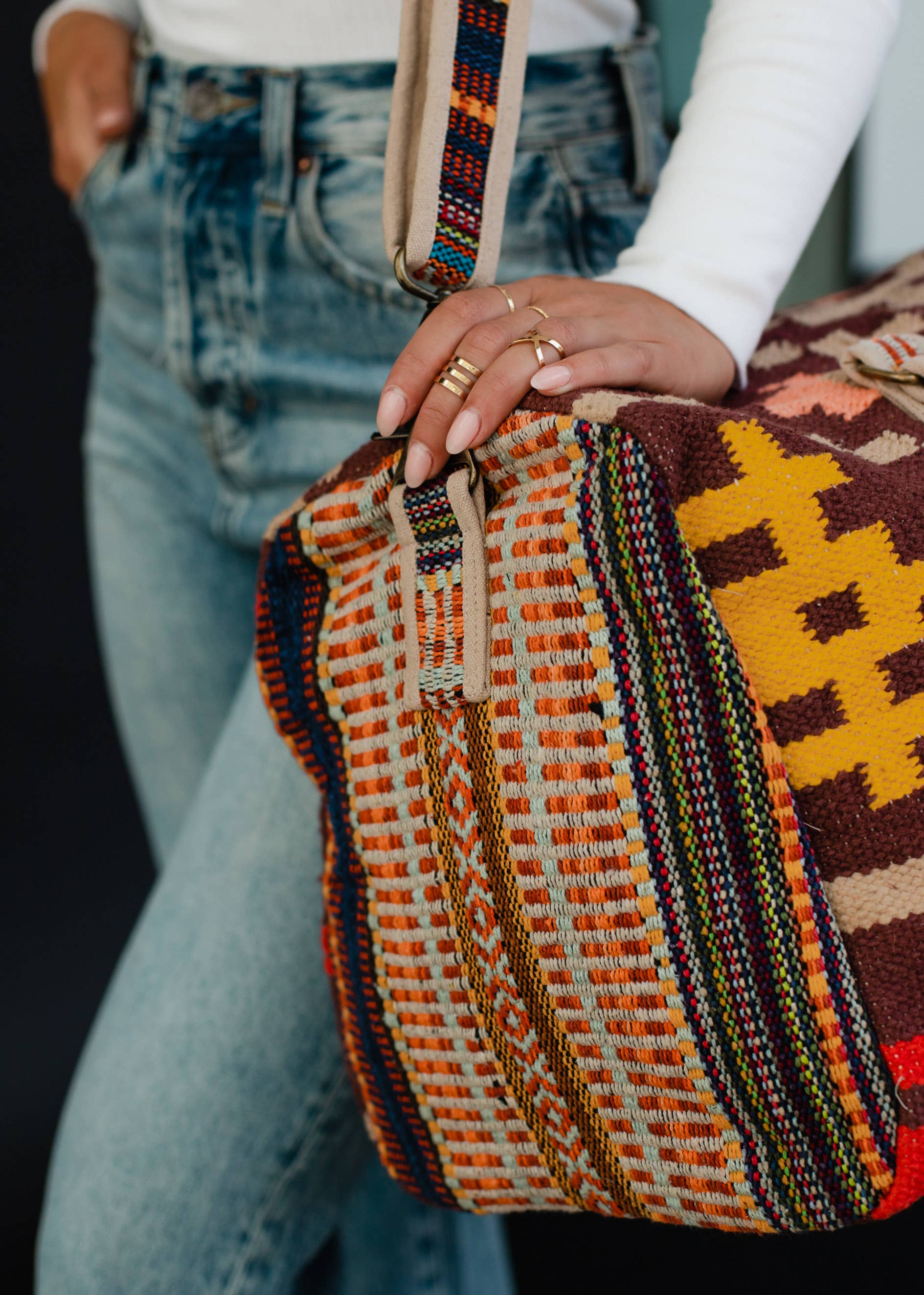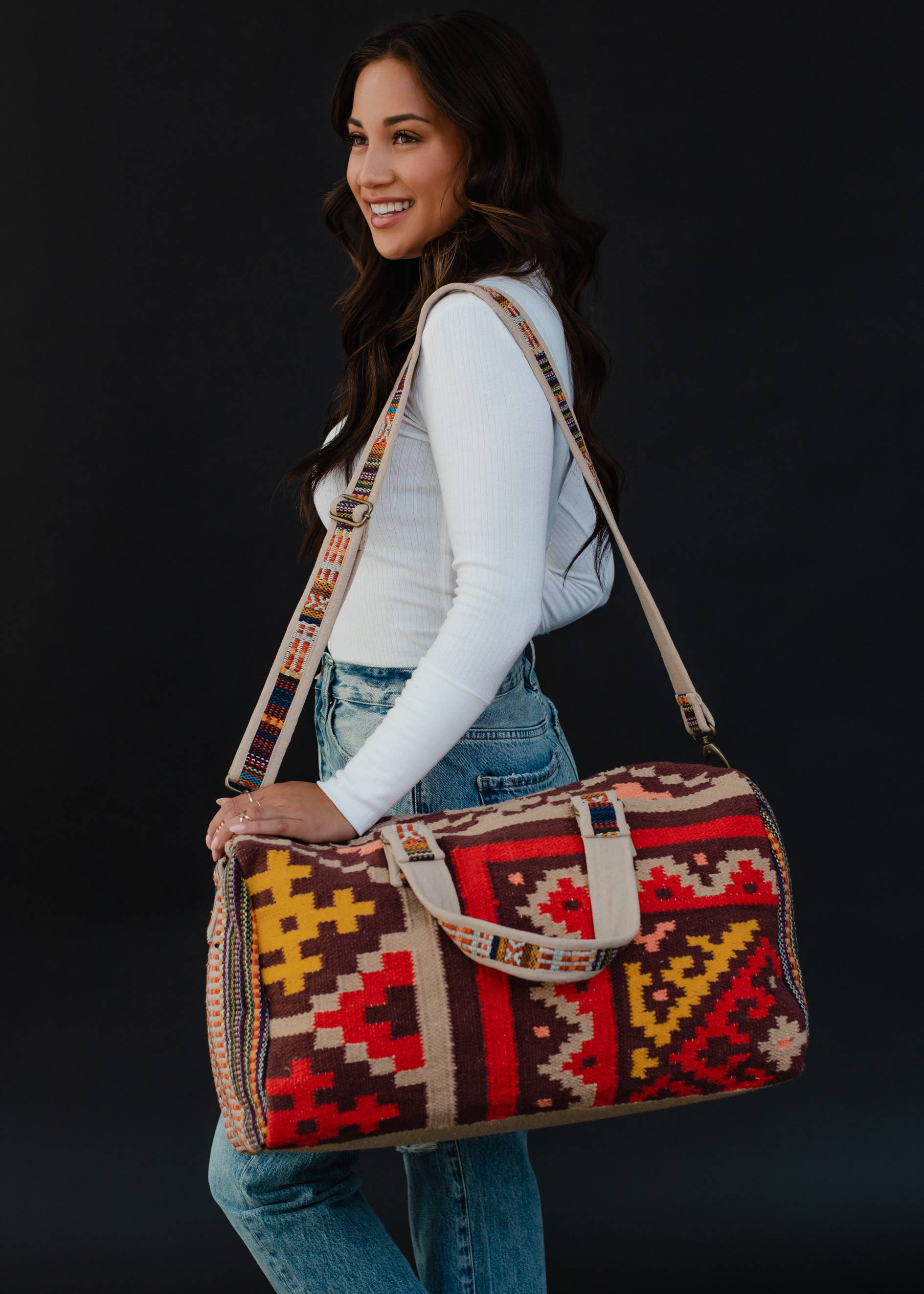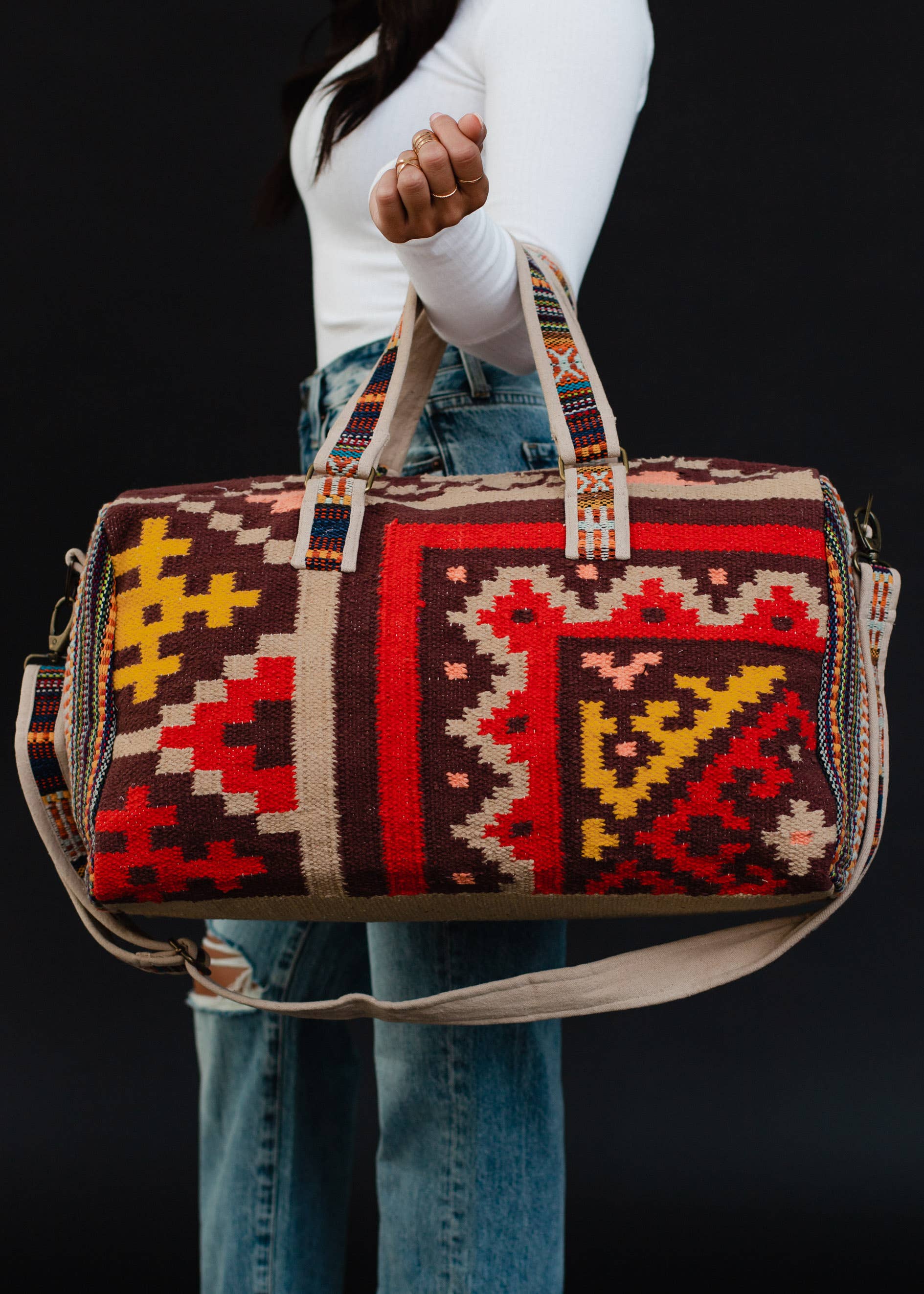 Brown w/ red, tan, mustard & pink Aztec pattern duffel Zipper closure with 2 small pockets 20" x 11" x 8" 100% Cotton