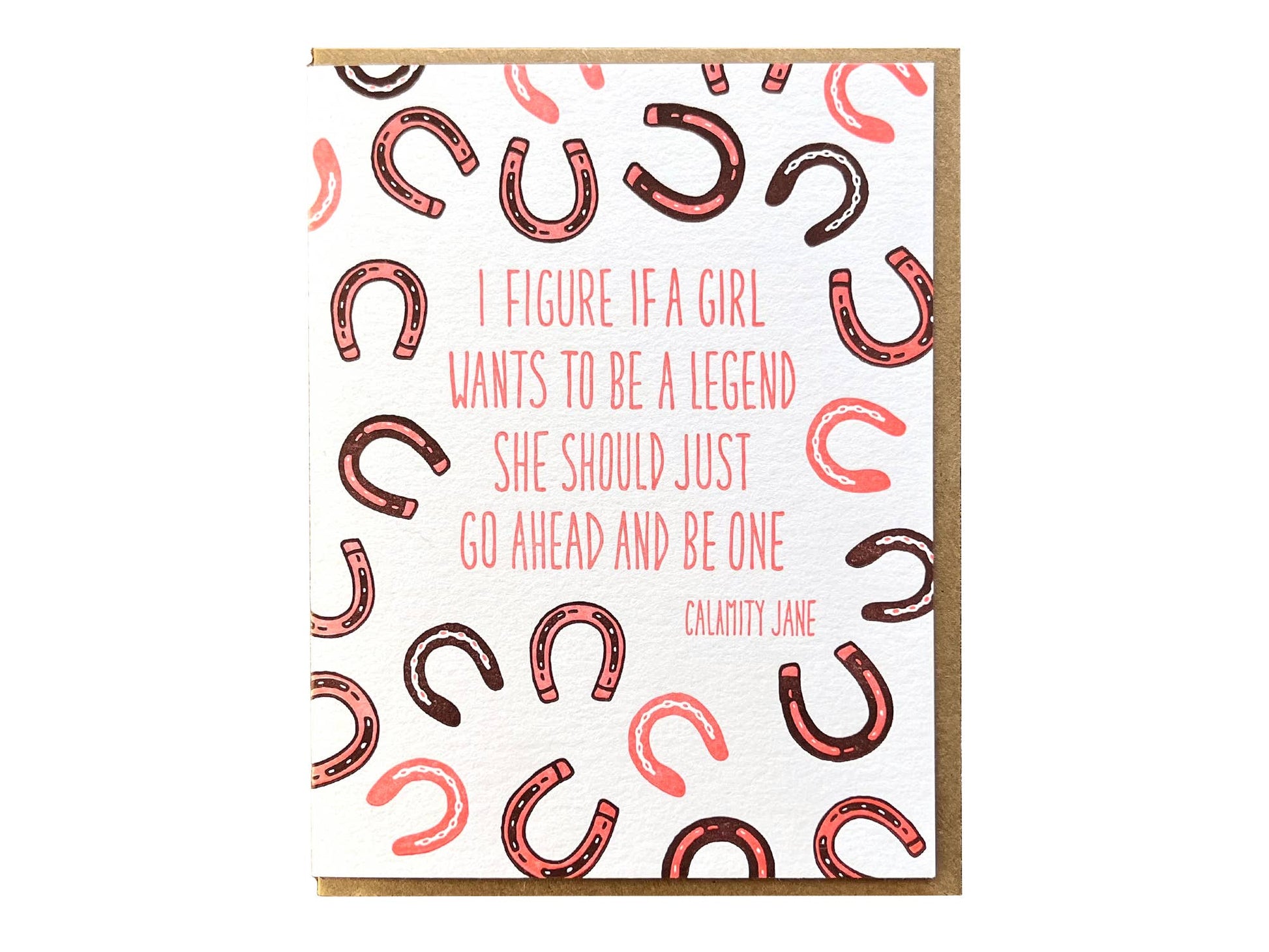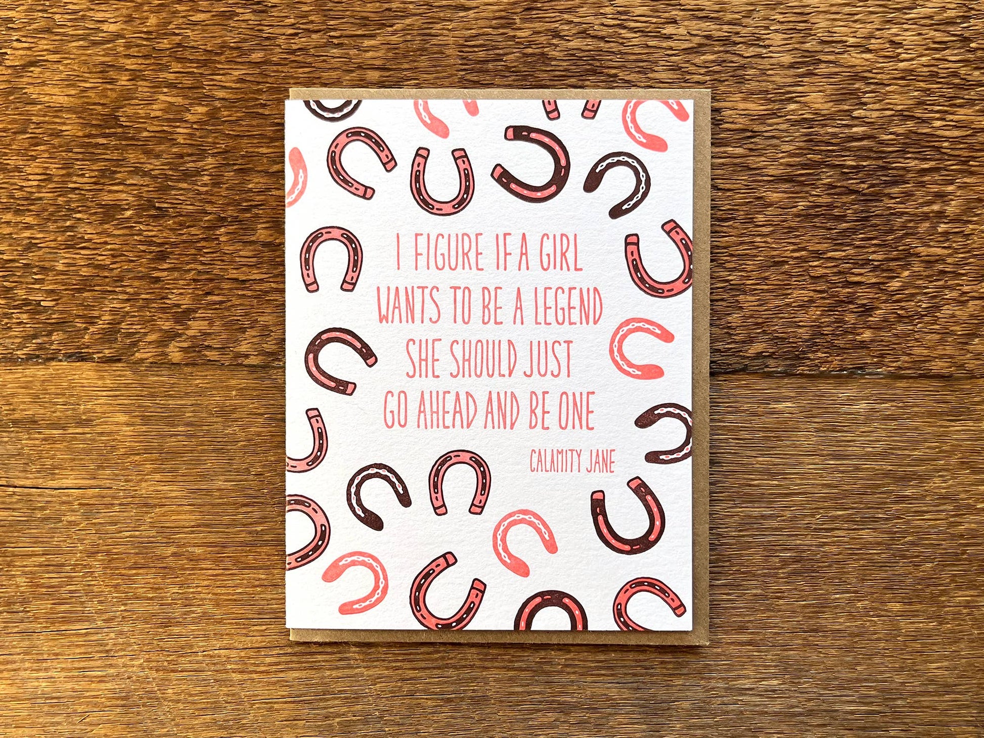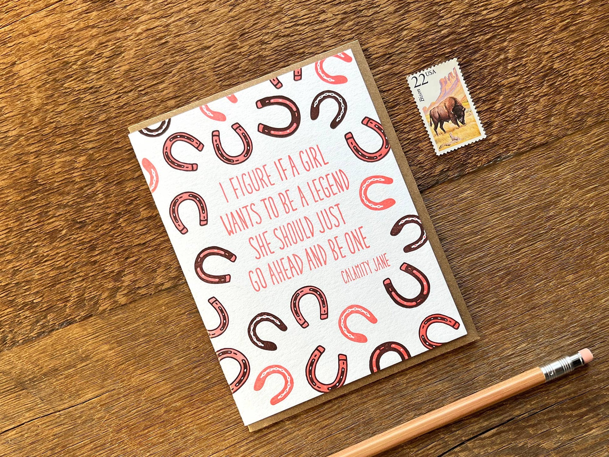 Letterpress printed folded cards, blank inside Size A2 (4-1/4" x 5-1/2") Image Description: a folded white A2 card with carious colored pink horseshoes along the edges, the pink text "I figured if a girl wants to be a legend she should just go ahead and be one. - Calamity Jane" centered in the middle All images, products and designs © Noteworthy Paper & Press
