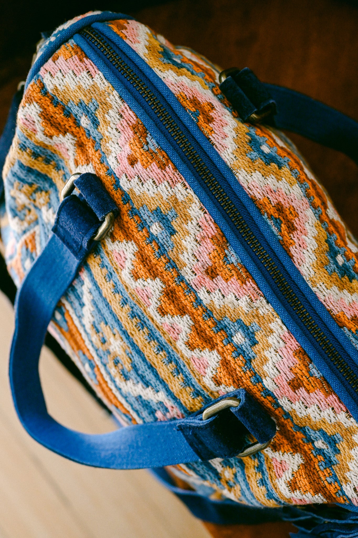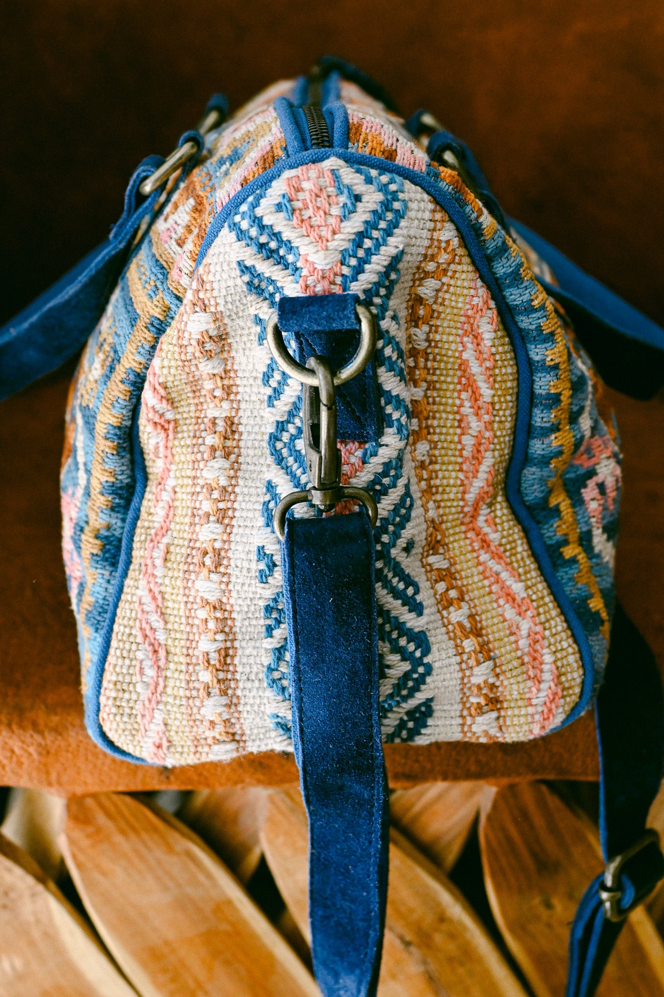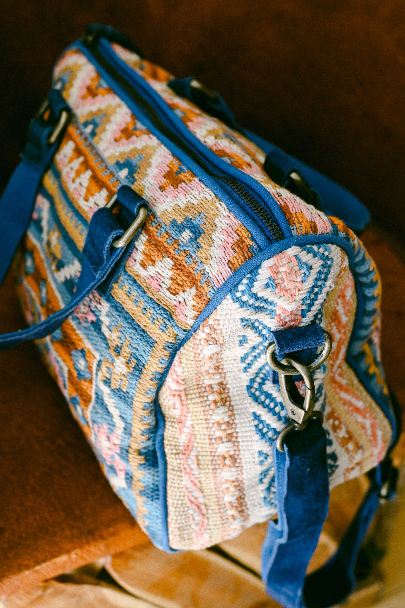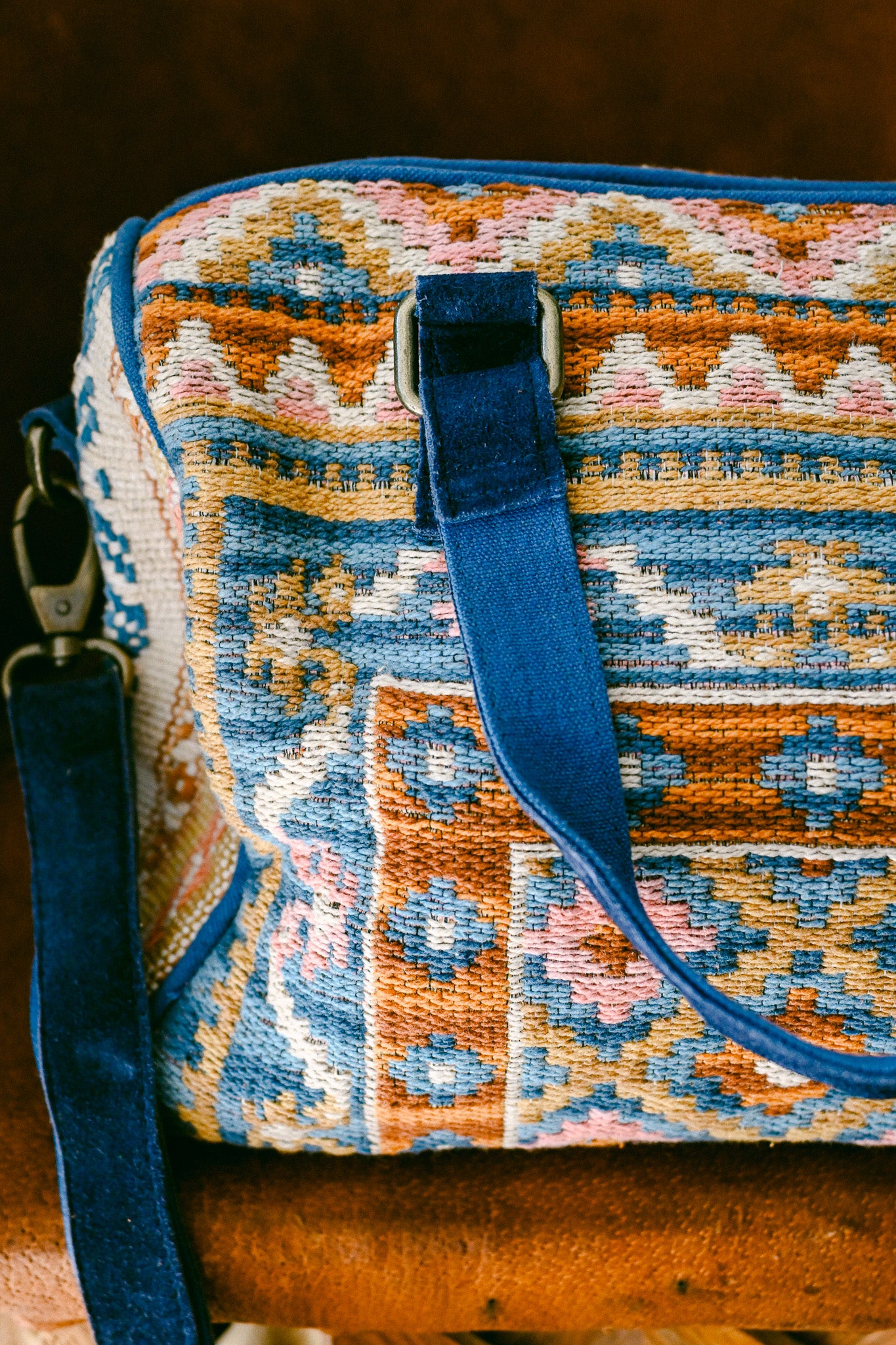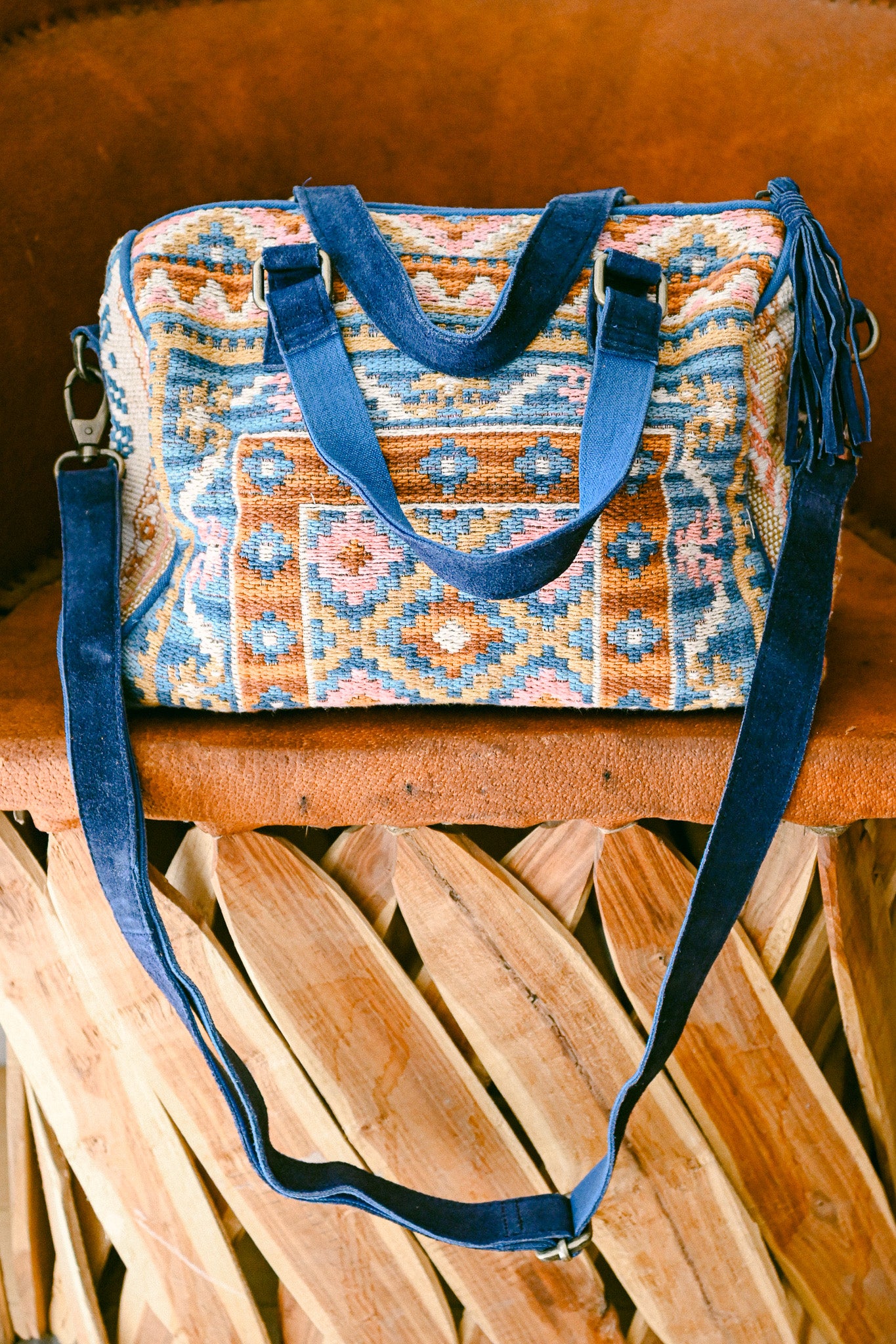 Boston bag with leather details in a southwestern kilim fabric - Castle Island print