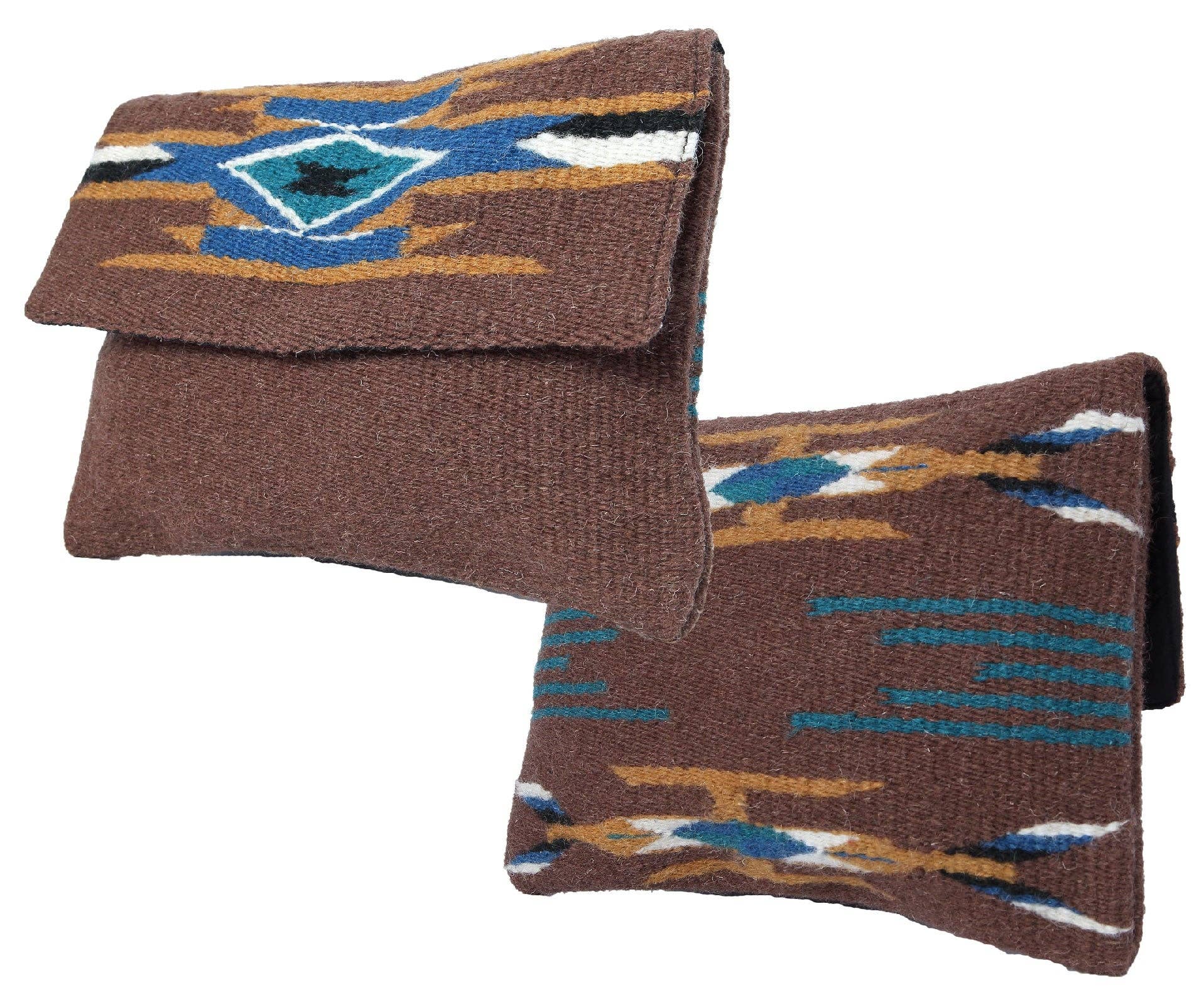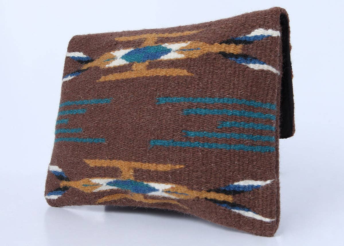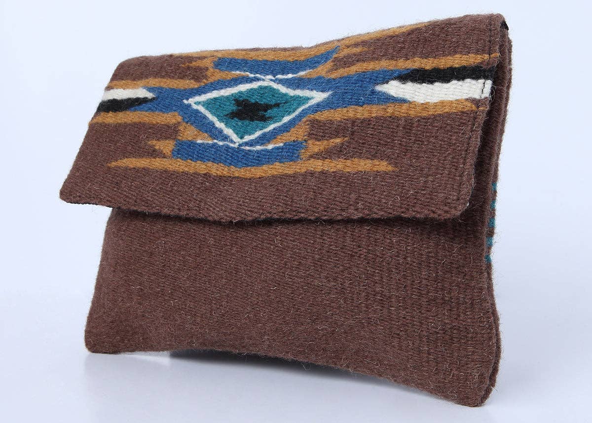 Handcrafted wool clutch purse with intricate Chimayo-style designs on both front and back. Has a magnetic snap closure and has a fully lined interior with an inside zippered pocket. Imported, apx. 11.5" x 8.5" This design comes in a brown color with accents of turquoise, blue, light fire, black, and white.