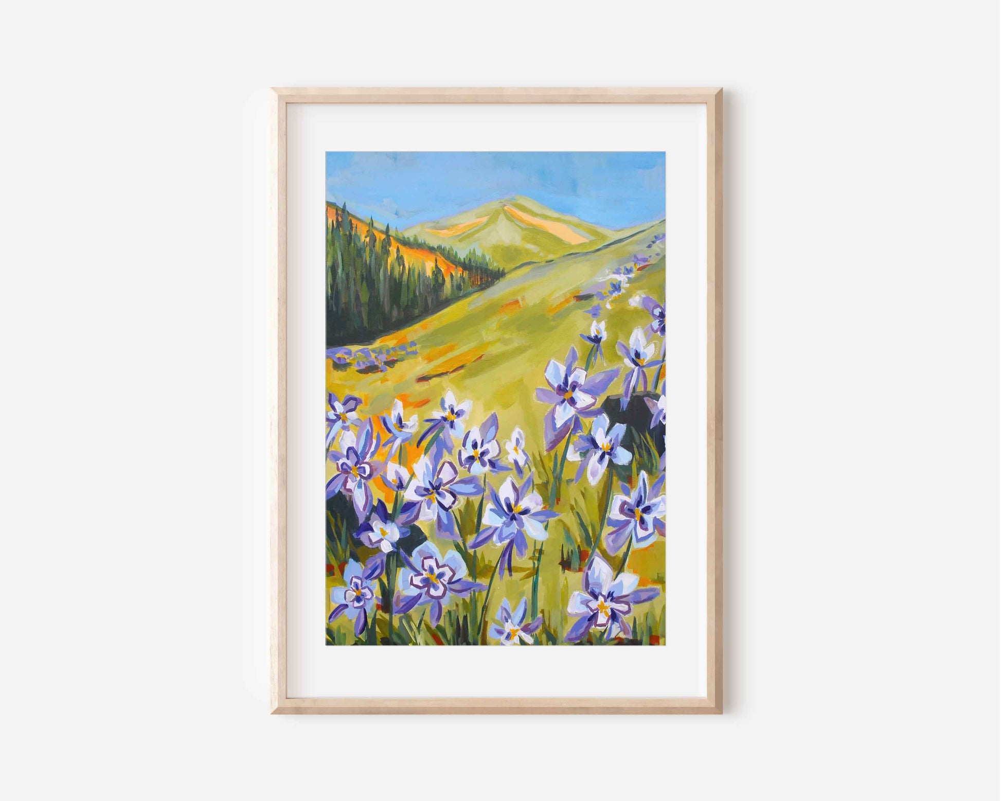 High in the Rocky Mountain alpine, the green grassy slopes are bursting with blooming Columbine flowers. The painting by Kaley Alie Art was inspired by a hike along the Continental Divide in Colorado. This high quality art print will brighten any room! More Details: - Frame & mat not included - A signed print of an original acrylic painting - Print will fit in standard frame sizes and will have a 1/2" white border. - Printed in the USA on lightly textured white linen paper - Packaged in a certified compostable clear sleeve with a sturdy backing board and shipped flat.