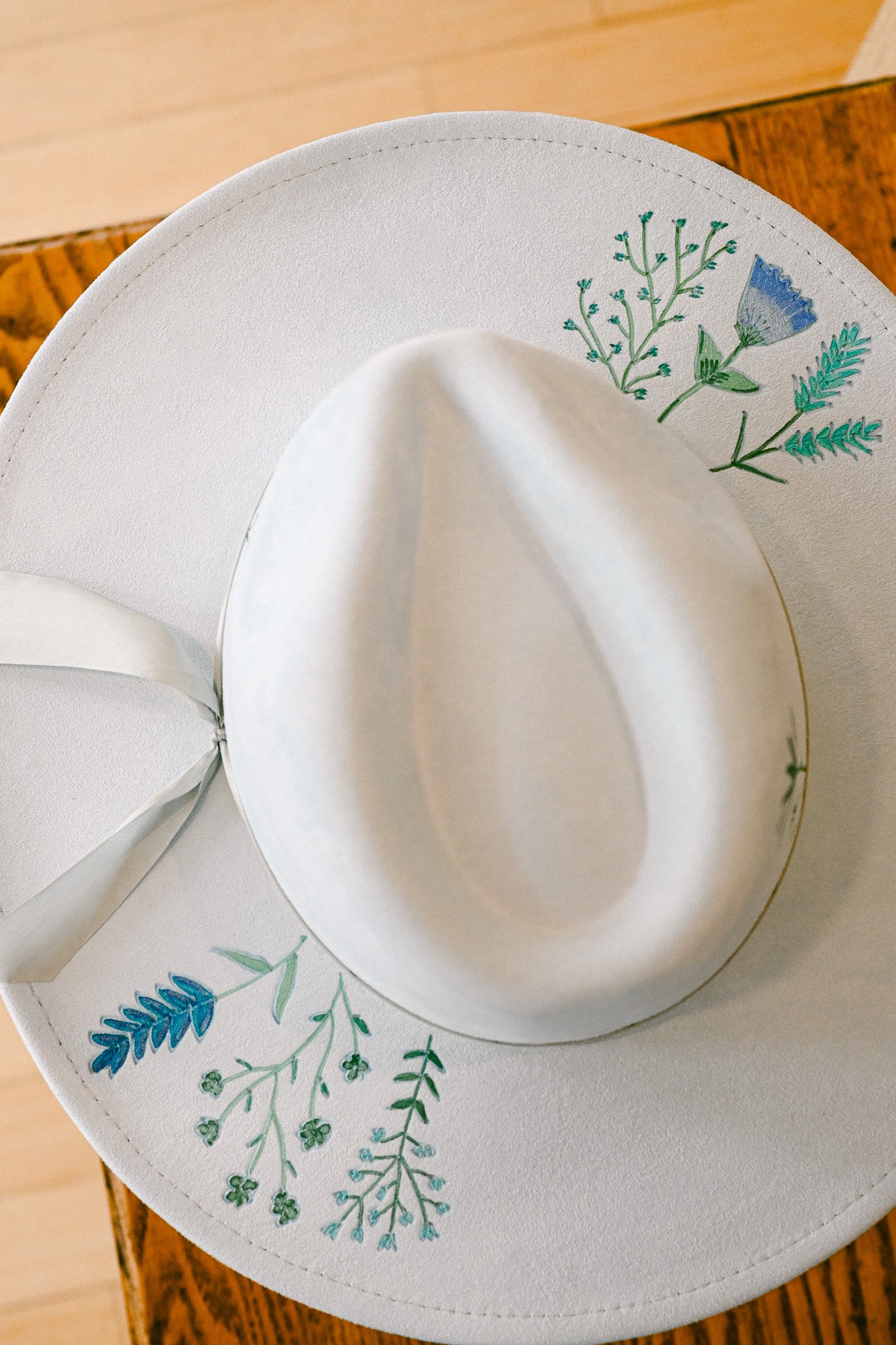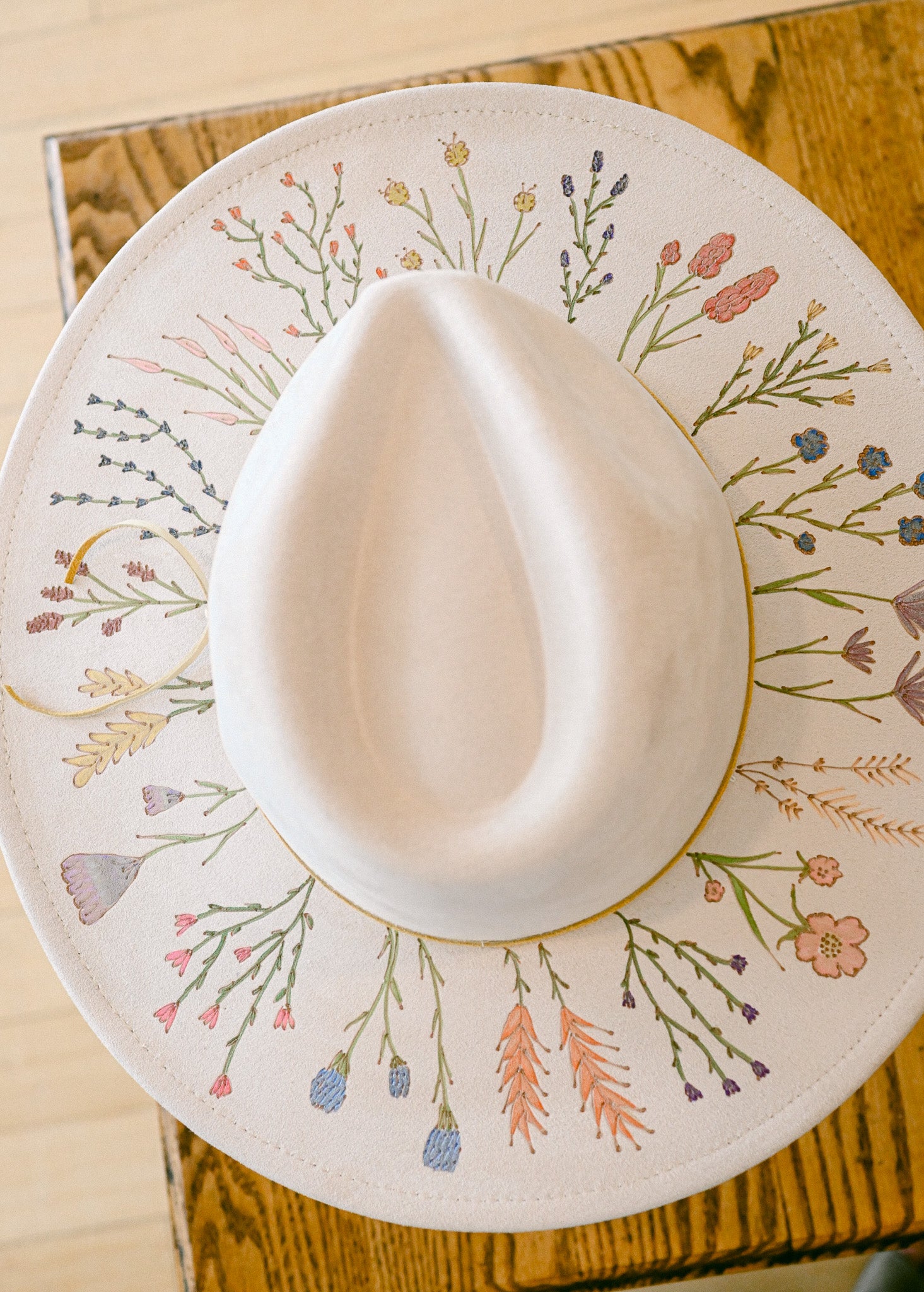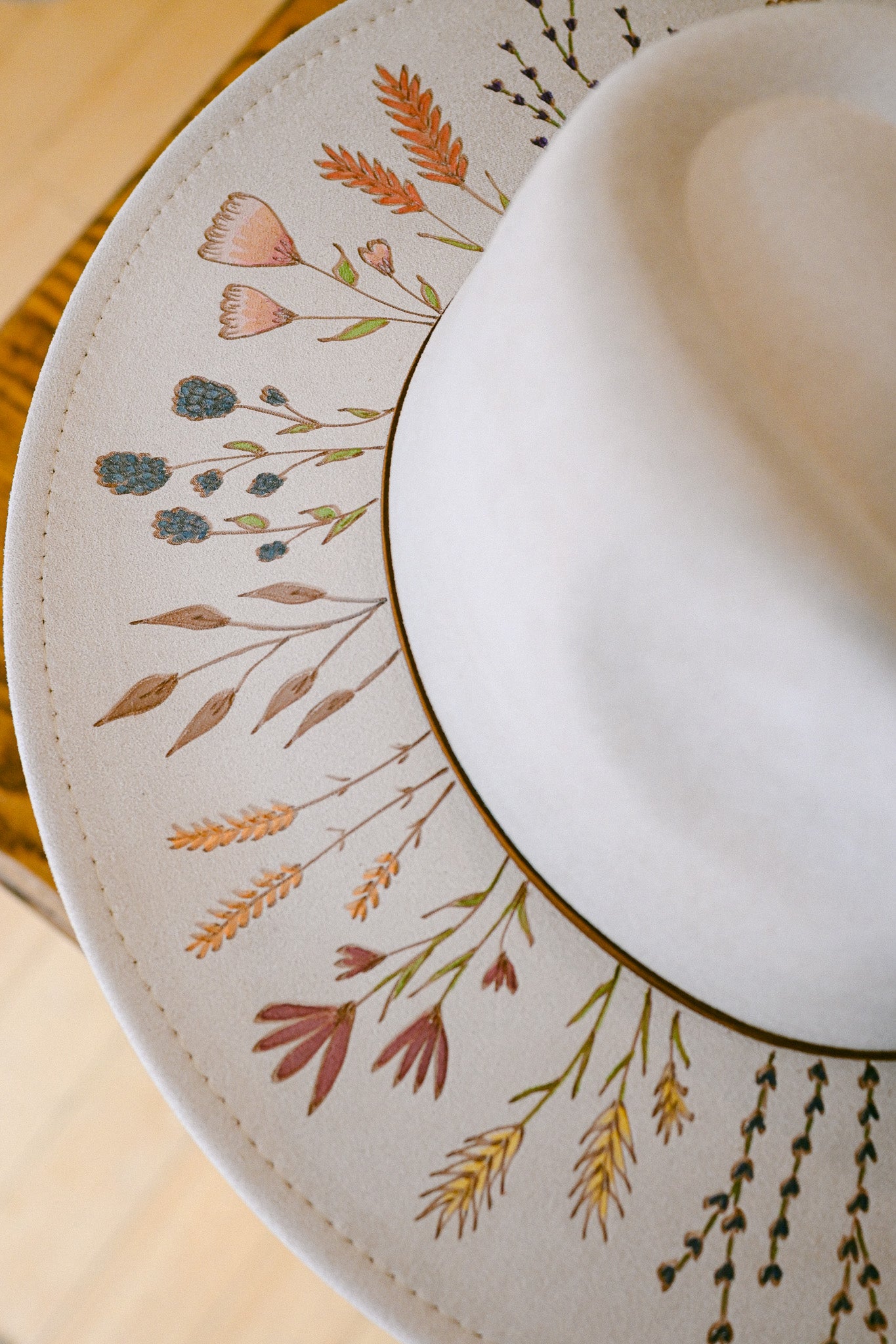 PLEASE NOTE: This product page is for burned and painted hats, which include color on the flowers; for burned-only hats (without colored flowers) see the Custom Order Hand-Burned Wildflower Hat product. If you do not see your preferred hat color here, please reach out - we can special order your preferred color for you!