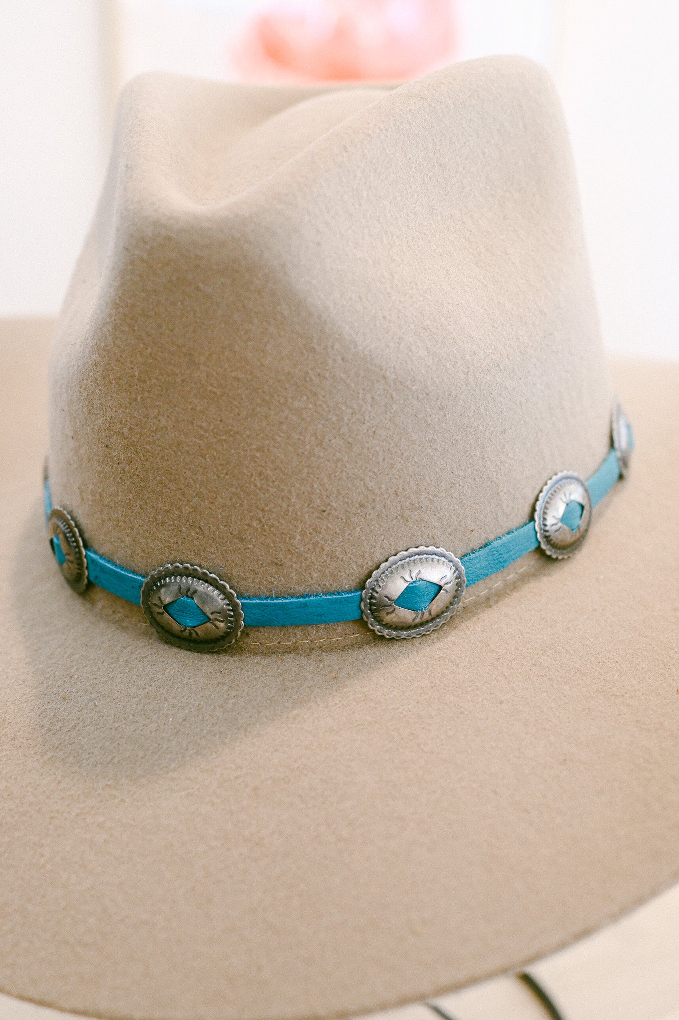 Soft deerskin leather hat band with concho accents all the way around, and a bolo slide closure for an adjustable fit that works for any hat size.