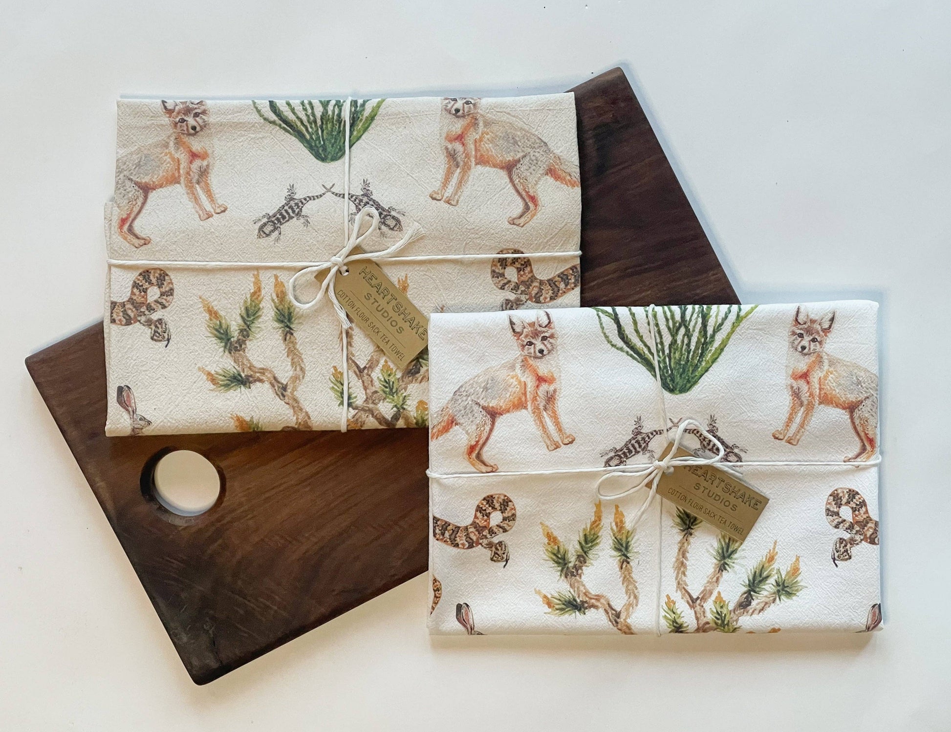 These artistic tea towels will add a colorful botanical touch to your kitchen! The large unbleached natural cotton flour sack dishtowels are printed with Kit Hutchinson's original gouache painting illustrations arranged in symmetrical mandala inspired designs. This towel features paintings the flora and fauna of Joshua Tree National Park! Towels come folded and tied with string with a kraft tag, ready for gift giving. These beautiful towels are the perfect combination of art and function!