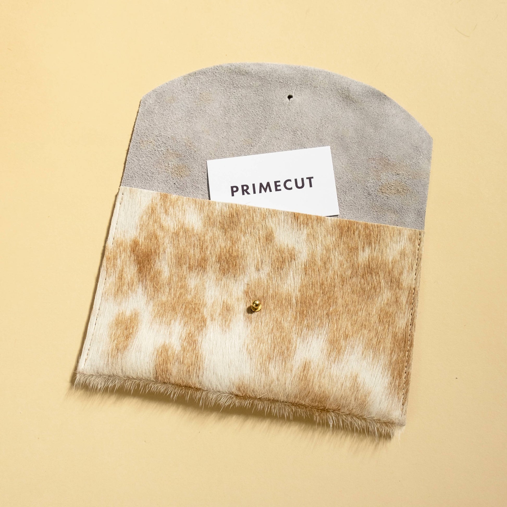 The perfect size clutch for traveling or going out. - Cowhide exterior - Unlined - Solid brass stud fastener - Fits all of the essentials (passport, phone, etc.) - Approximately 8.5” W x 5.5” T - Handmade in Portland, OR by Primecut. This item is made from naturally colored hides. Color and composition will vary.