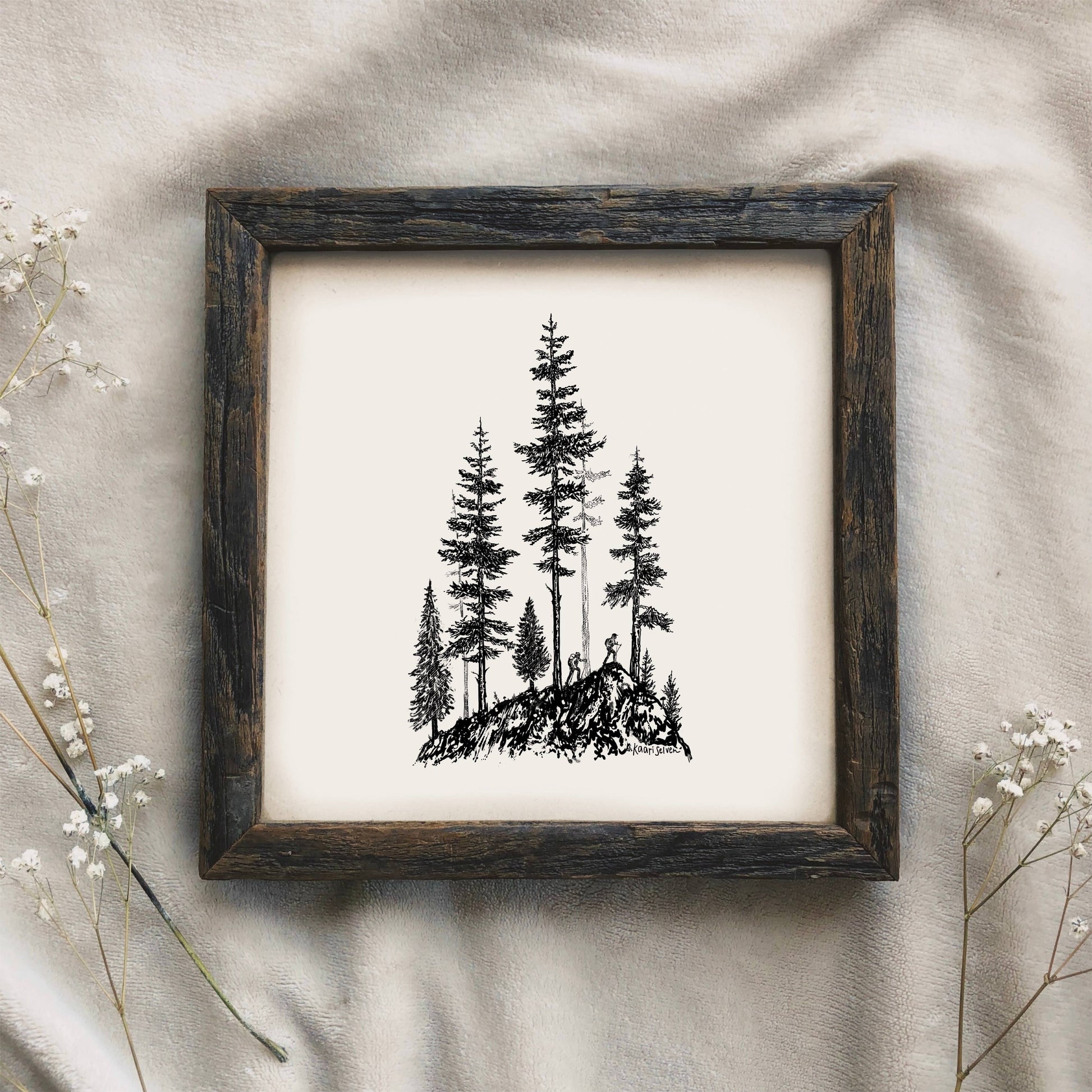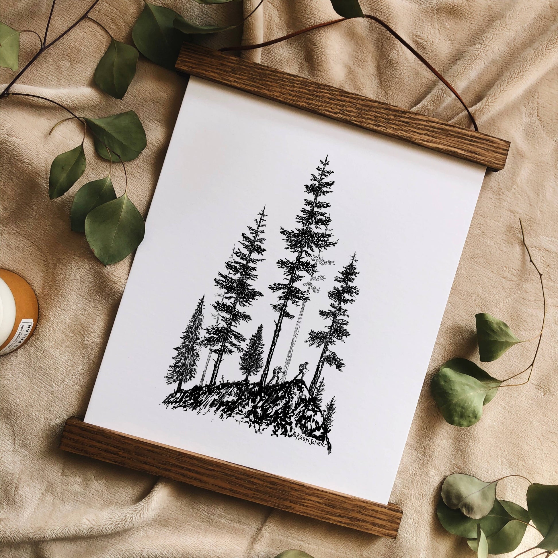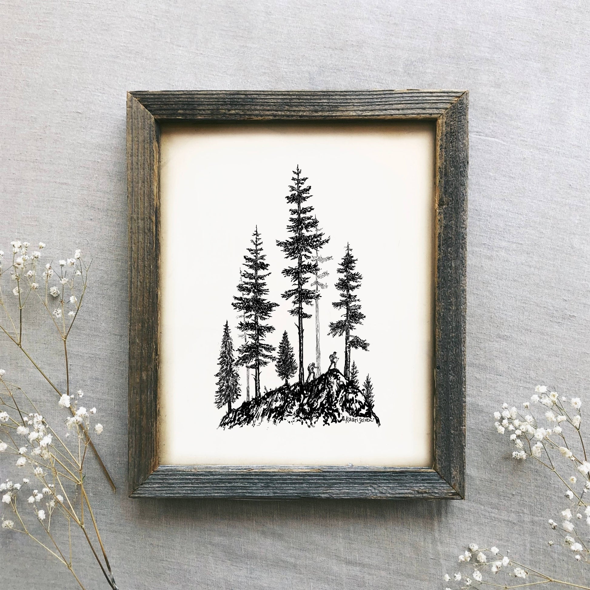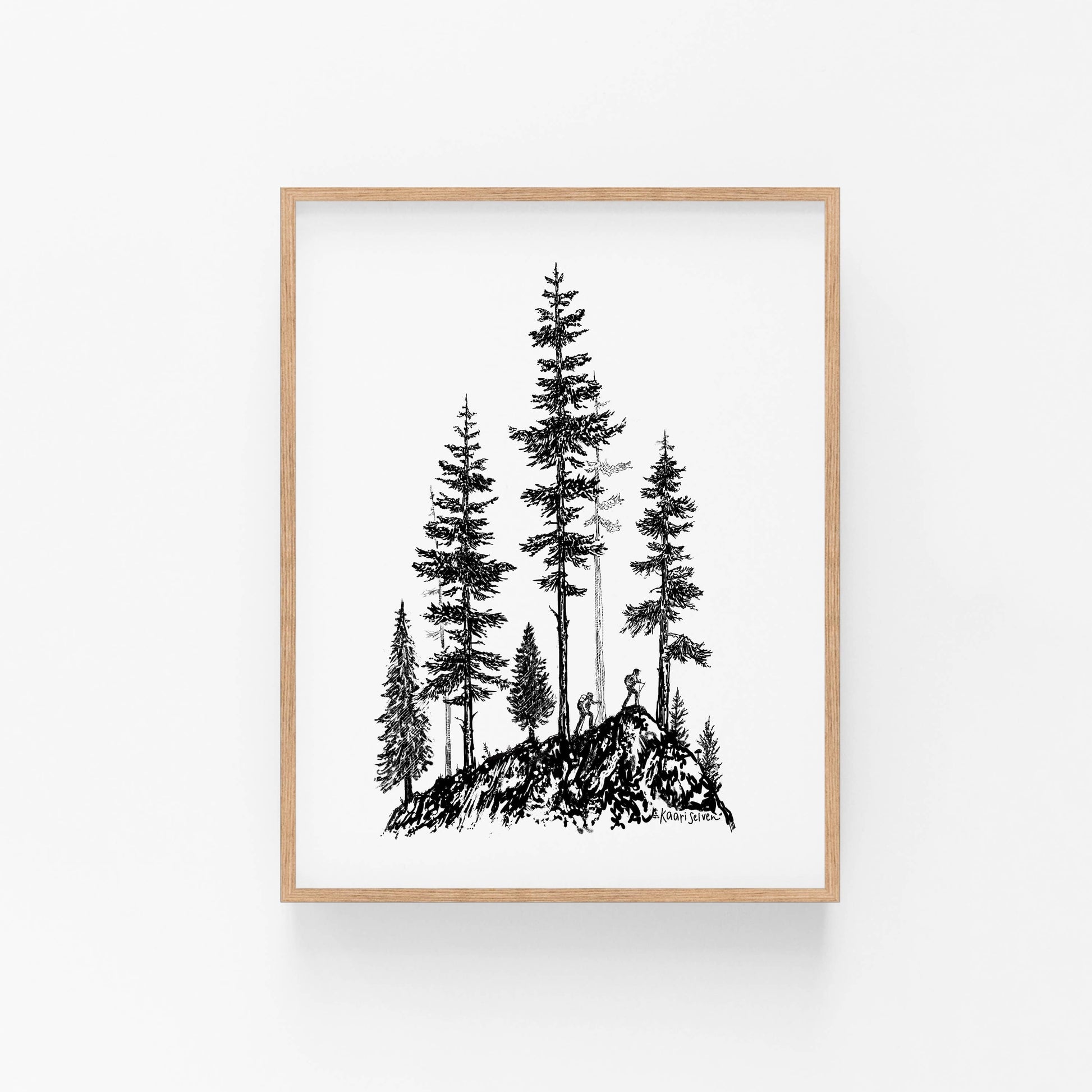 This nature-inspired art print features two hikers in a whimsical forest of tall trees. Kaari's art catches the eye of the adventure enthusiast who loves to explore the great outdoors.
