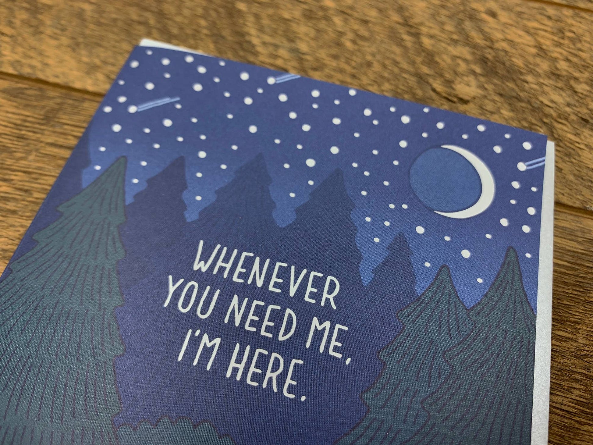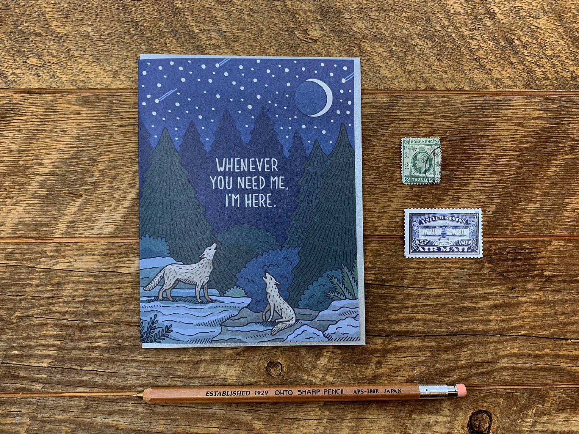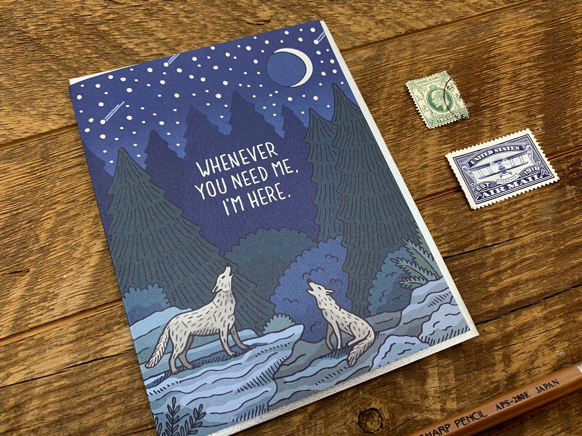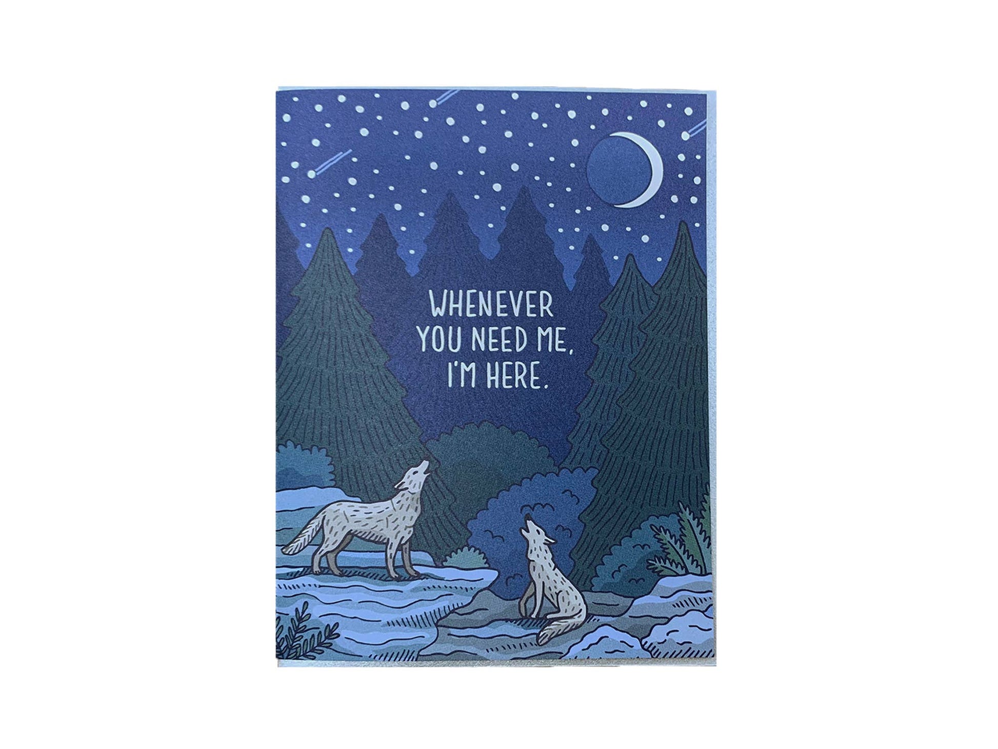 Image Description: a full color offset and foil printed A2 card, the scene is two wolves howling at a crescent moon, the silver foil "WHENEVER YOU NEED ME, I'M HERE" centered amongst the scene