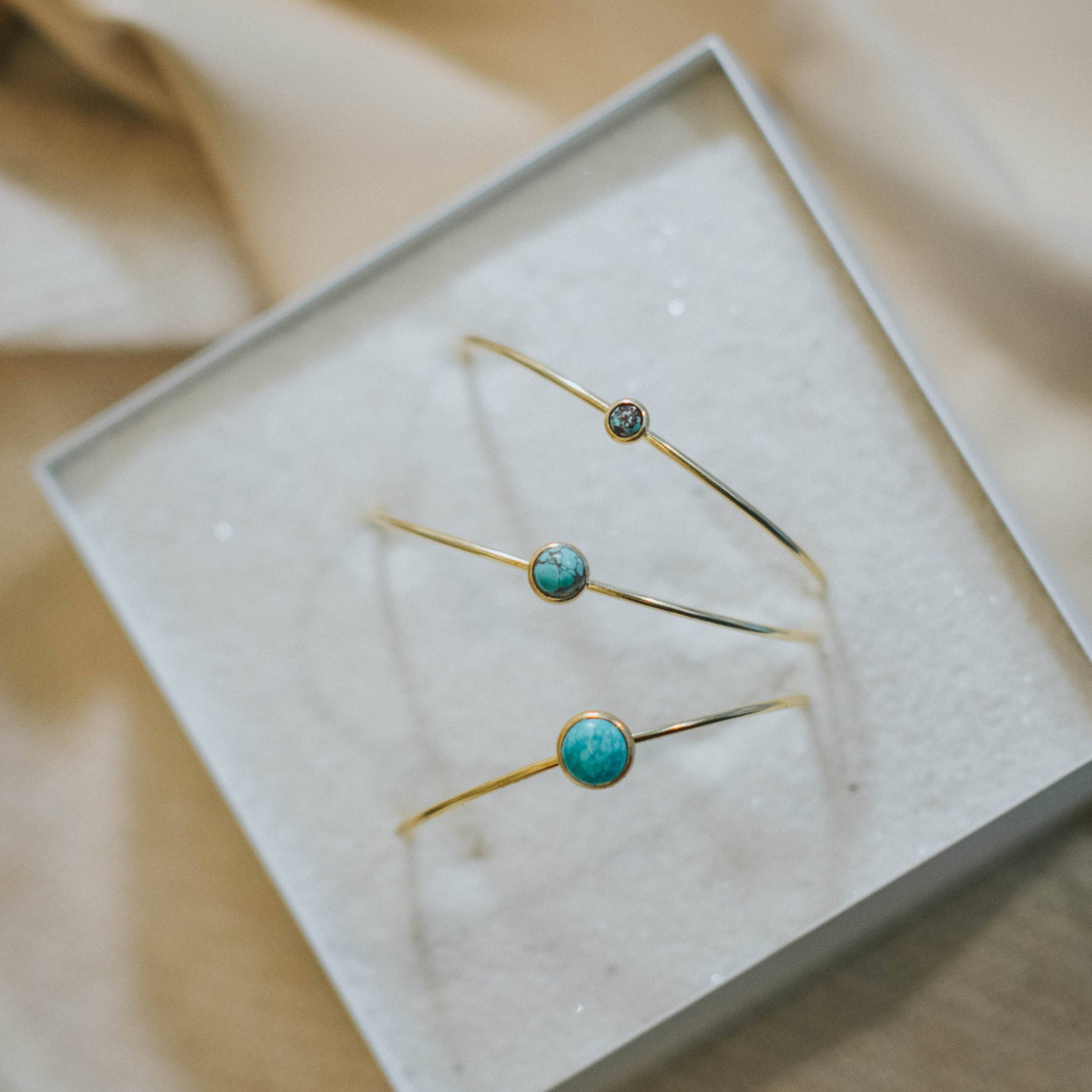 A dainty, solid brass adjustable cuff with a 8mm bezel set turquoise stones. These cuffs are cut, hammered, bent, and soldered by hand, then paired with high quality turquoise cabochons.