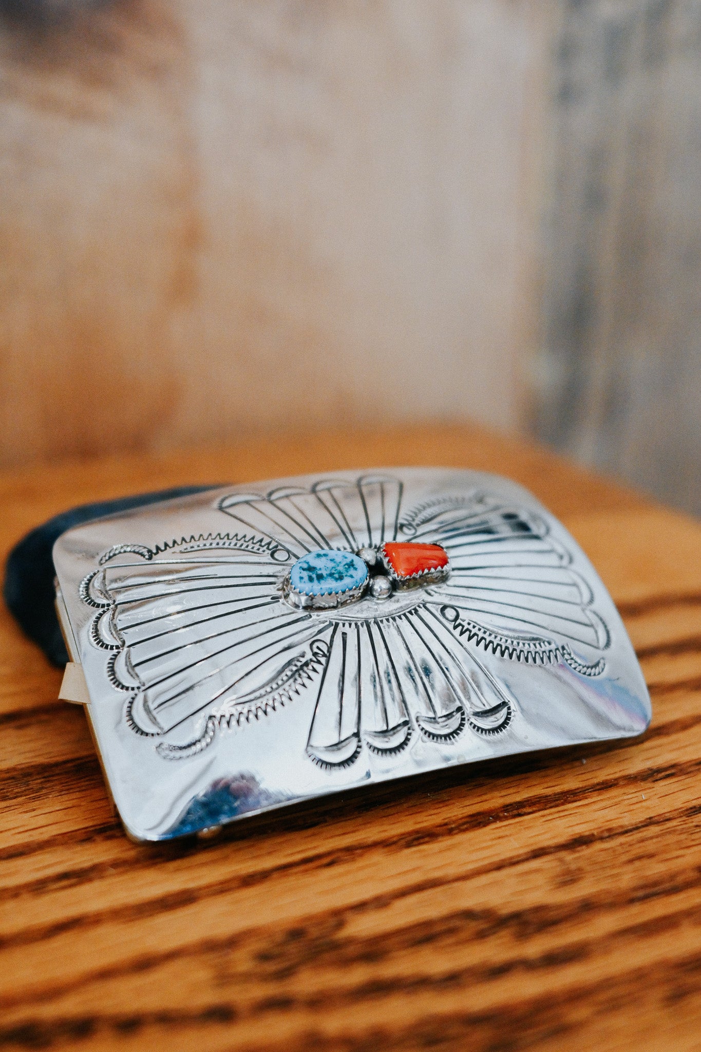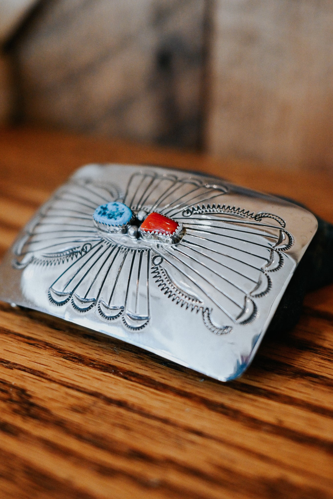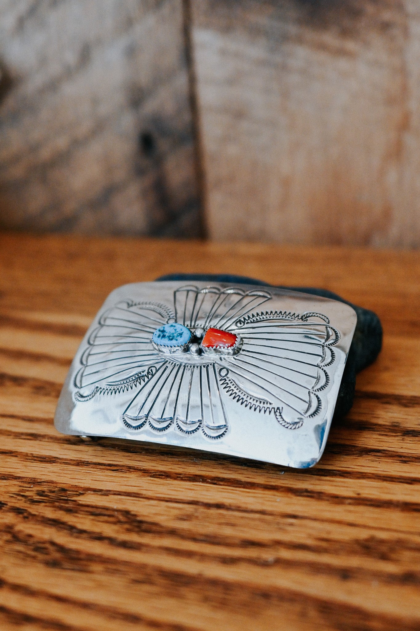 Navajo handmade Kingman turquoise and coral sterling silver belt buckle by Jolene Begay