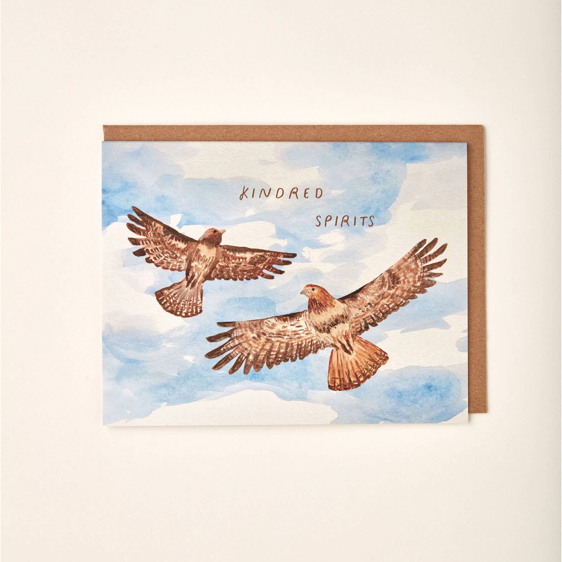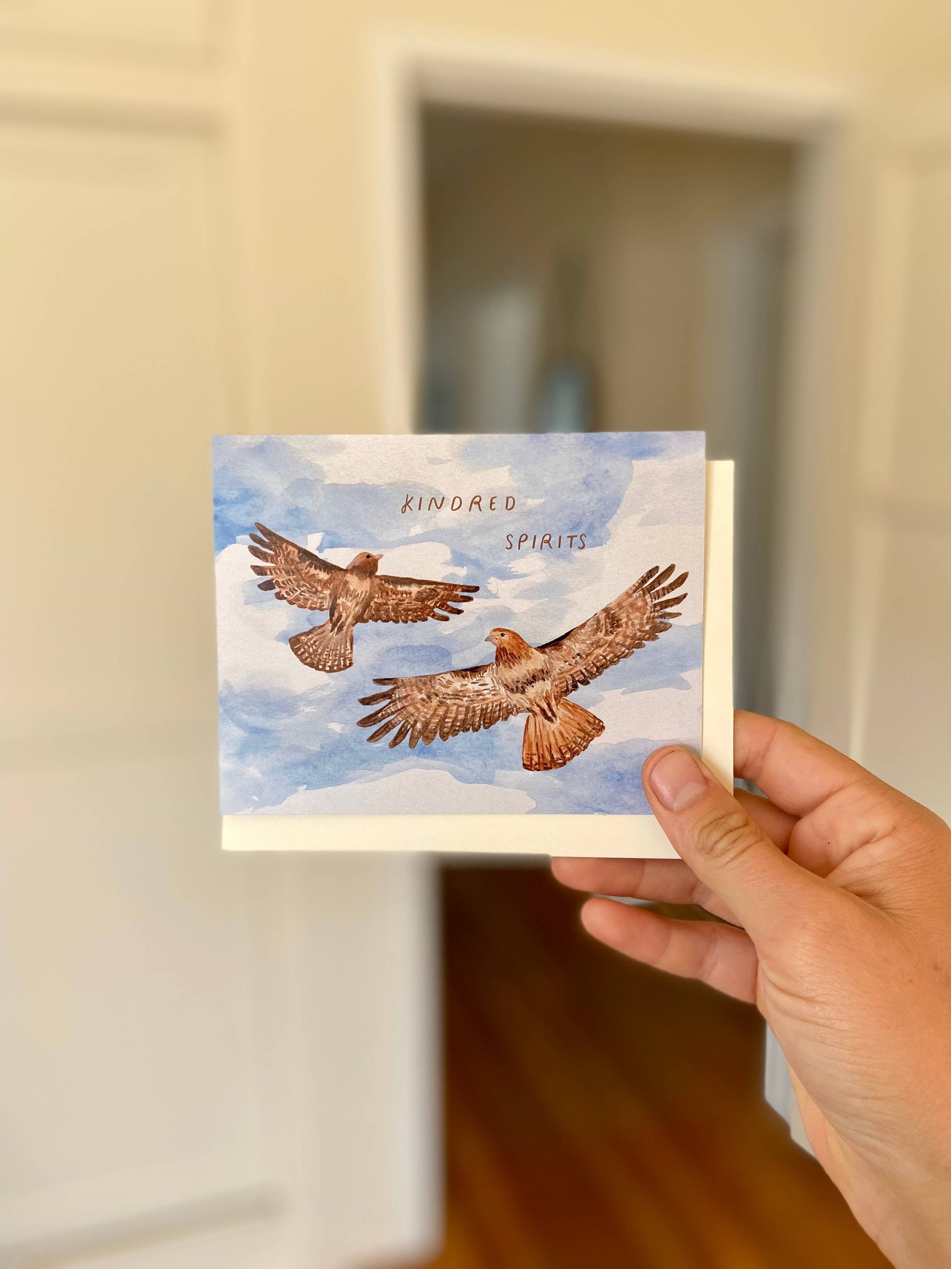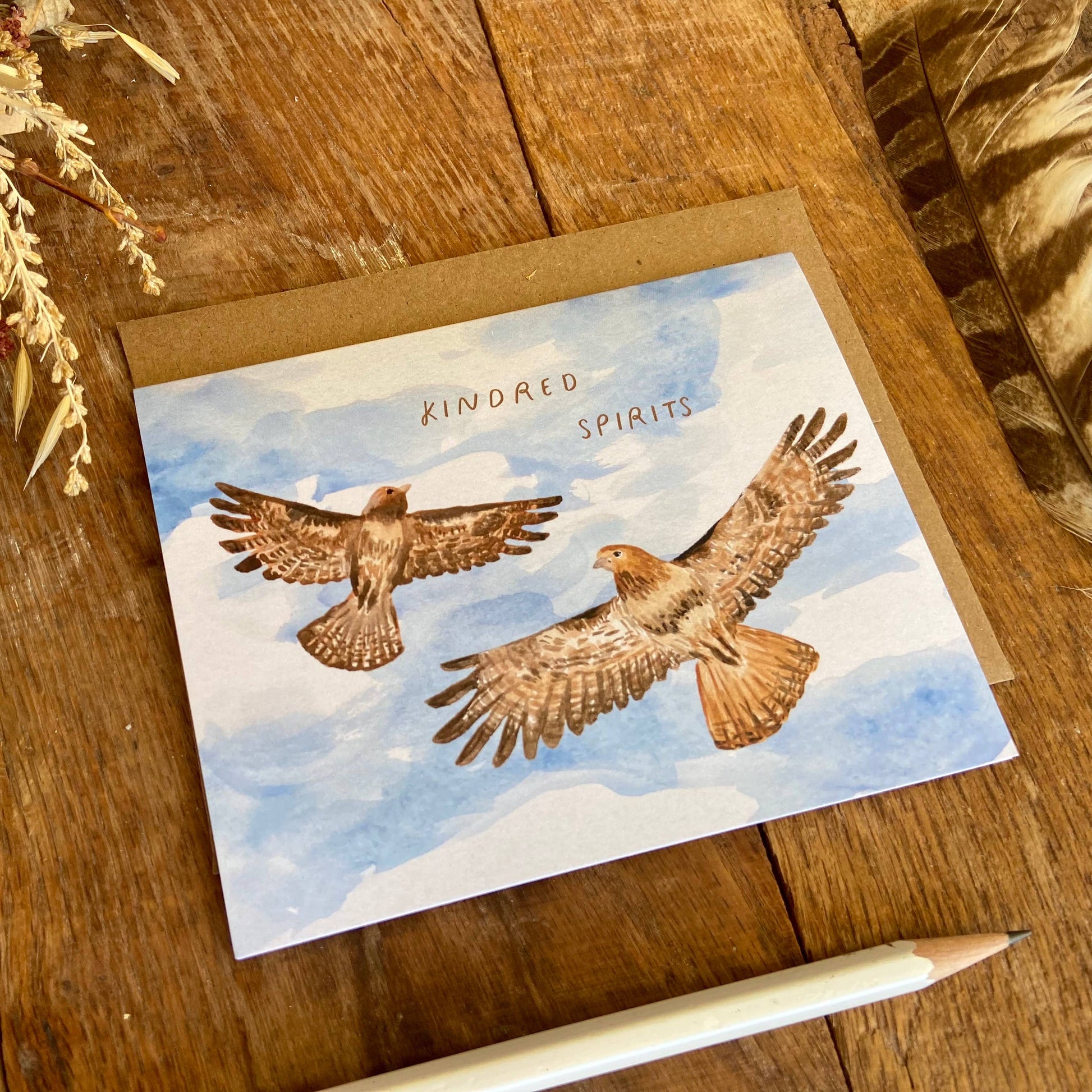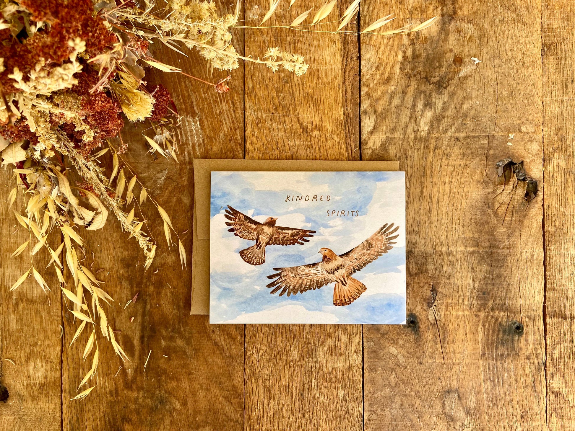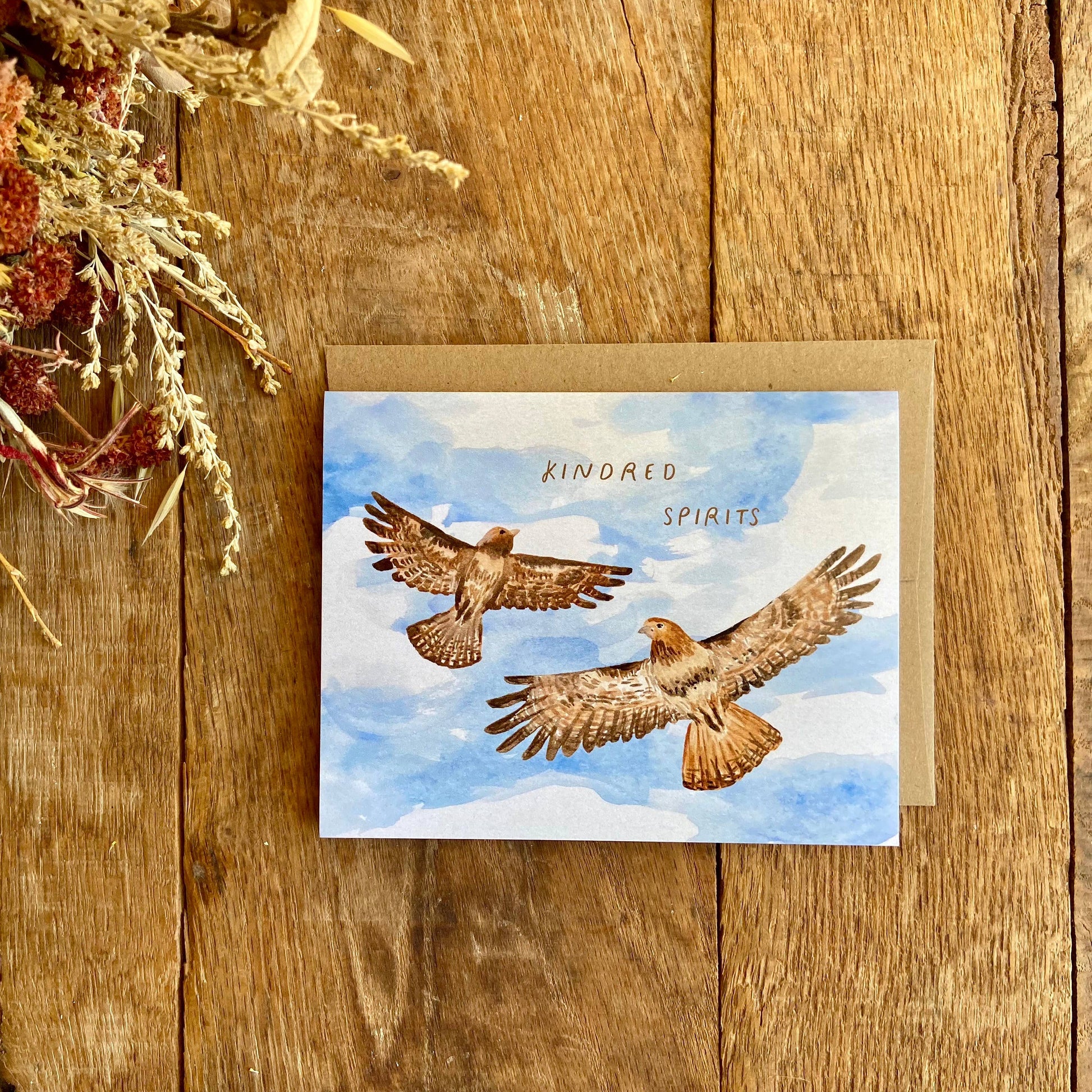 Inspired by the red tail hawks I see in my area, this card serves as a beautiful note for a kindred spirit in your life! Size: A2 Card- 5.5" W x 4.25" H folded - blank inside Paper: 110# matte felt texture paper Includes kraft recycled envelope Packaged in clear protective sleeve. By Little Salt Wagon.