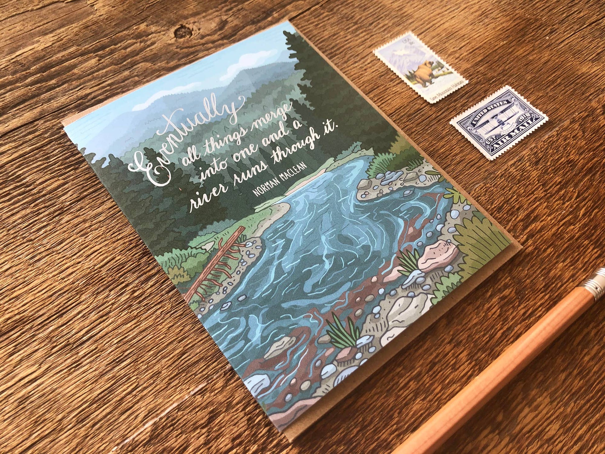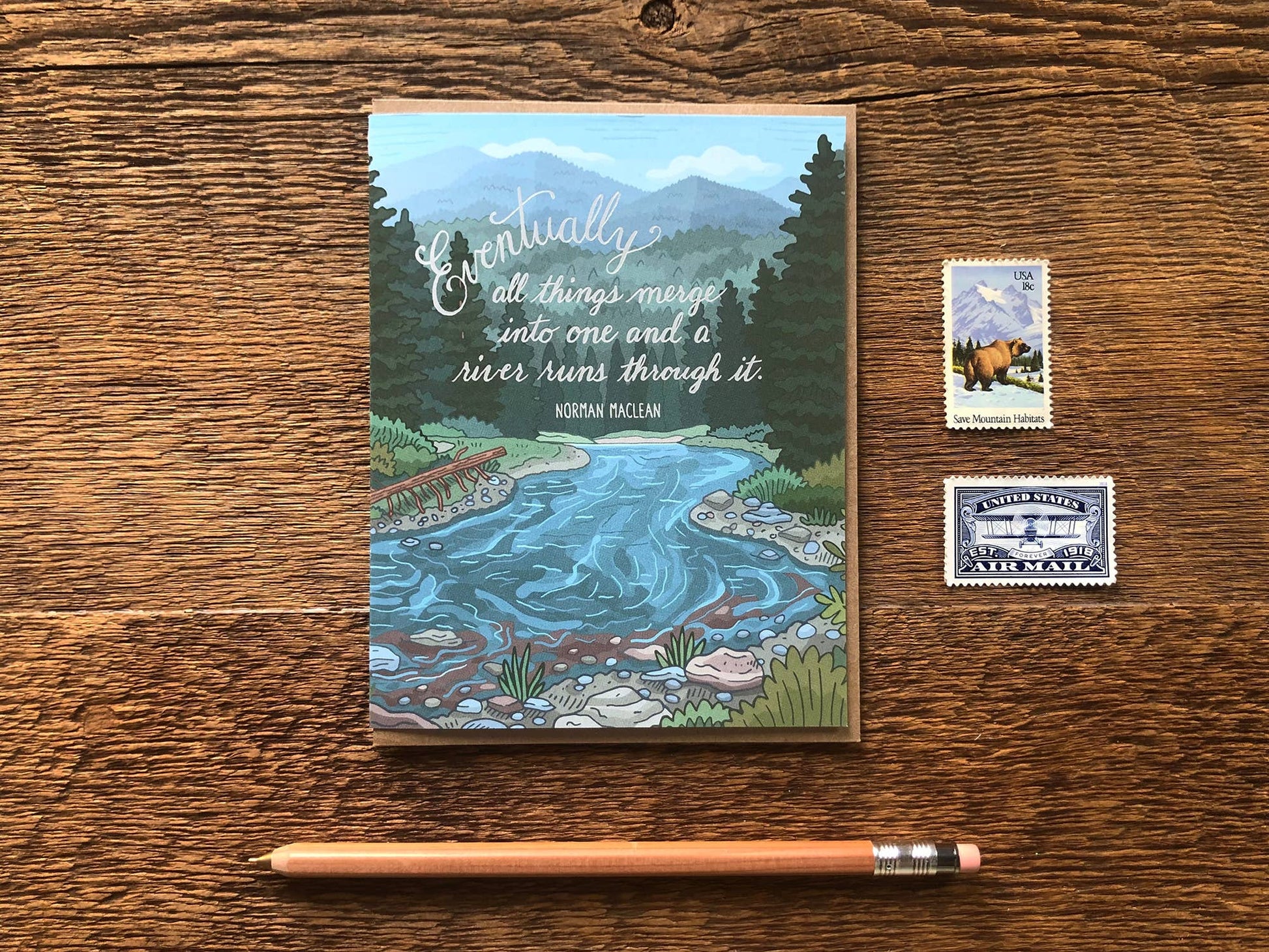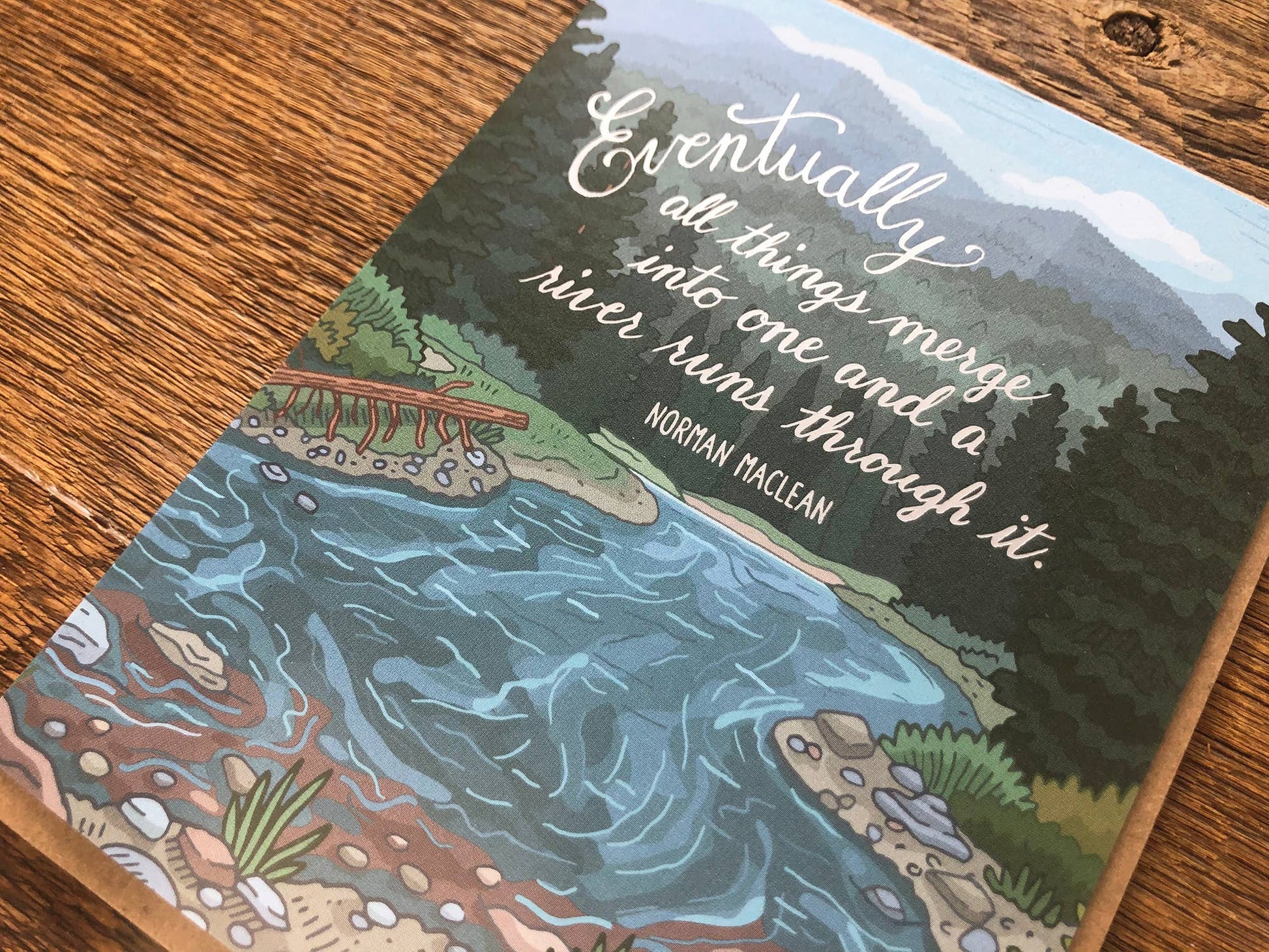 Image Description: a digitally printed card of a river running to a mountain landscape, the silver text "Eventually, all things merge into one and a river runs though it. - Norma Maclean" centered at the top