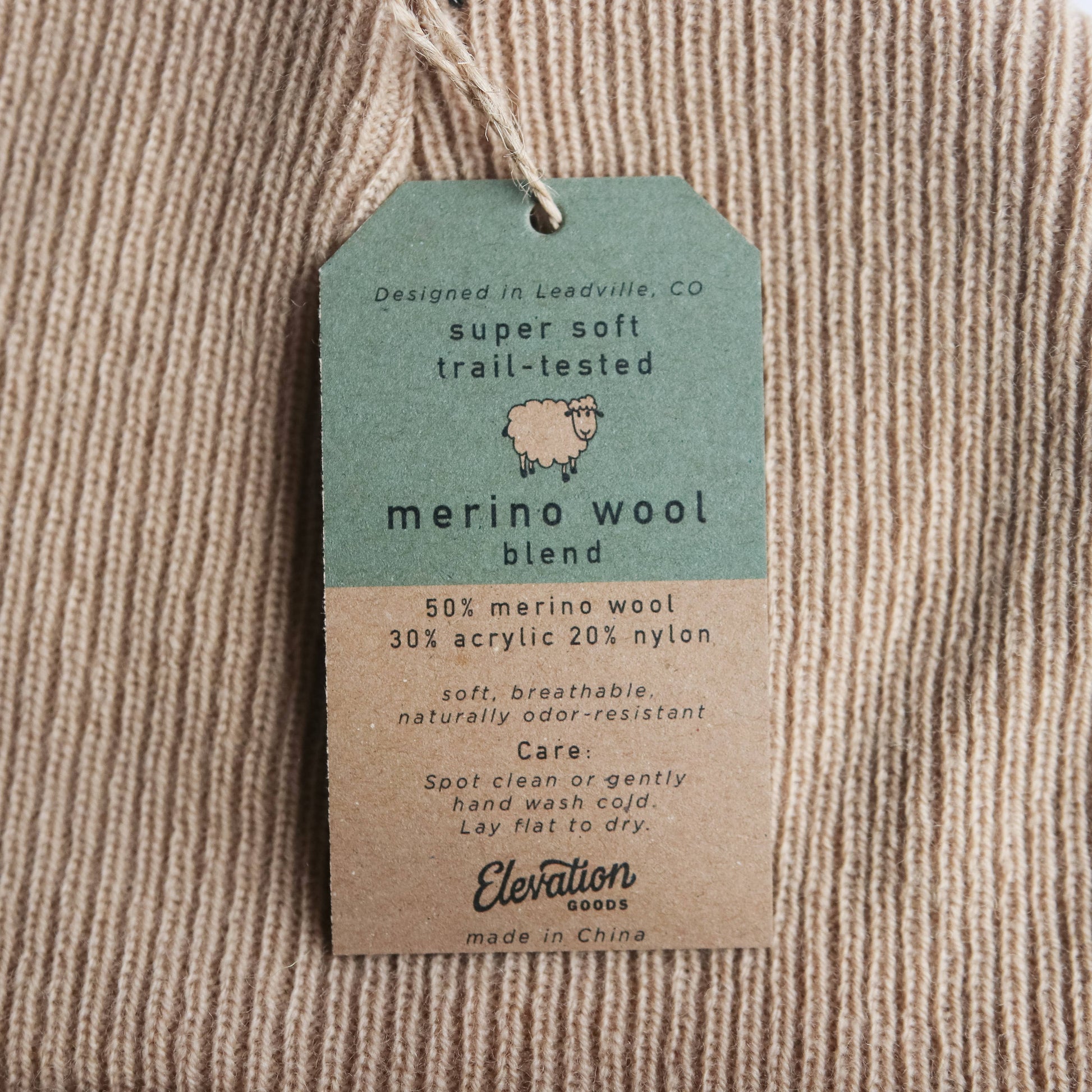 Keep your head cozy on summit mornings and campfire nights with our Tan Merino Wool Mountain Beanie. Made from a soft blend of 50% merino wool, 30% acrylic, and 20% nylon, it balances warmth, breathability, and durability — perfect for life lived above 10,000 feet.