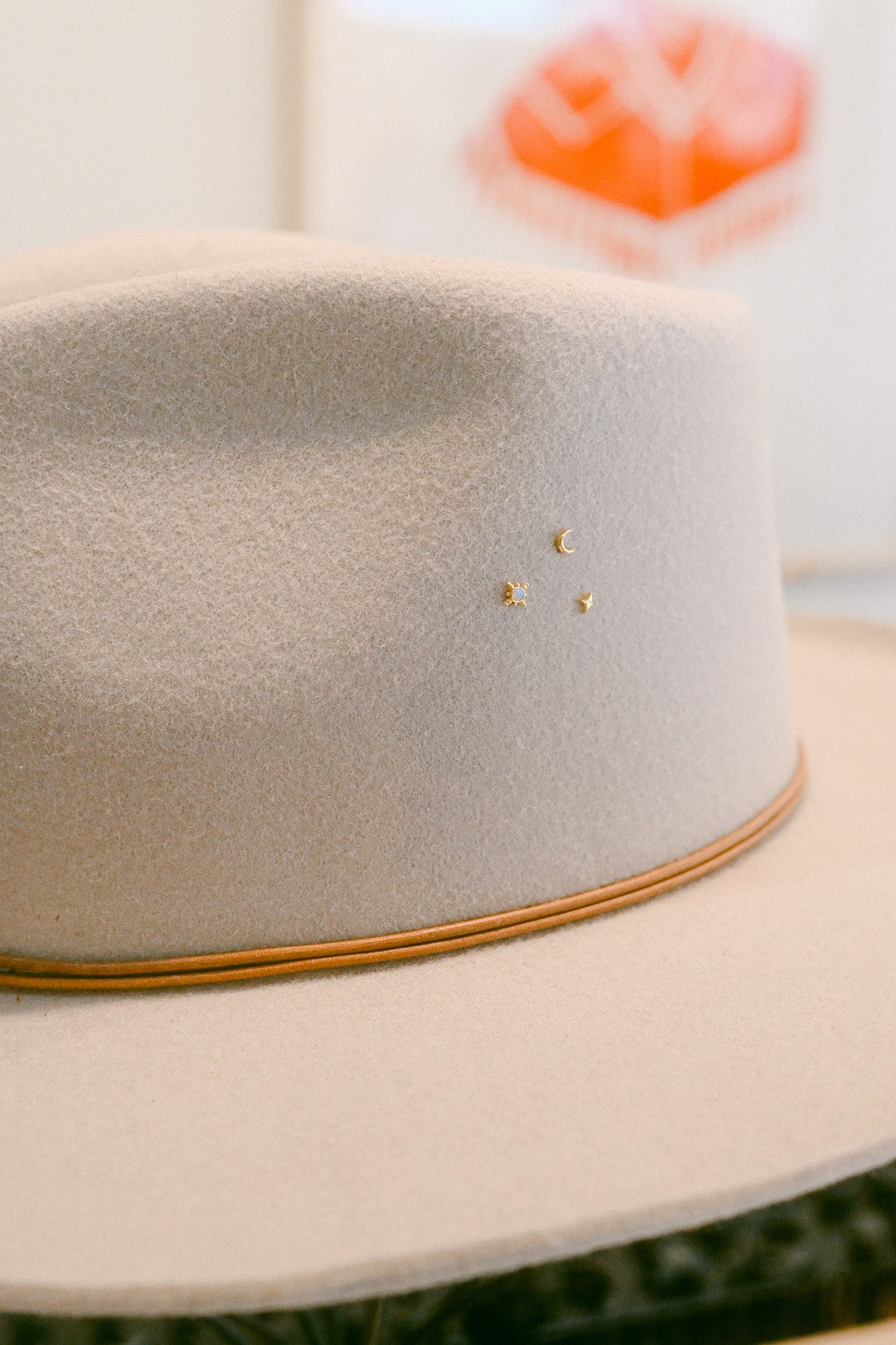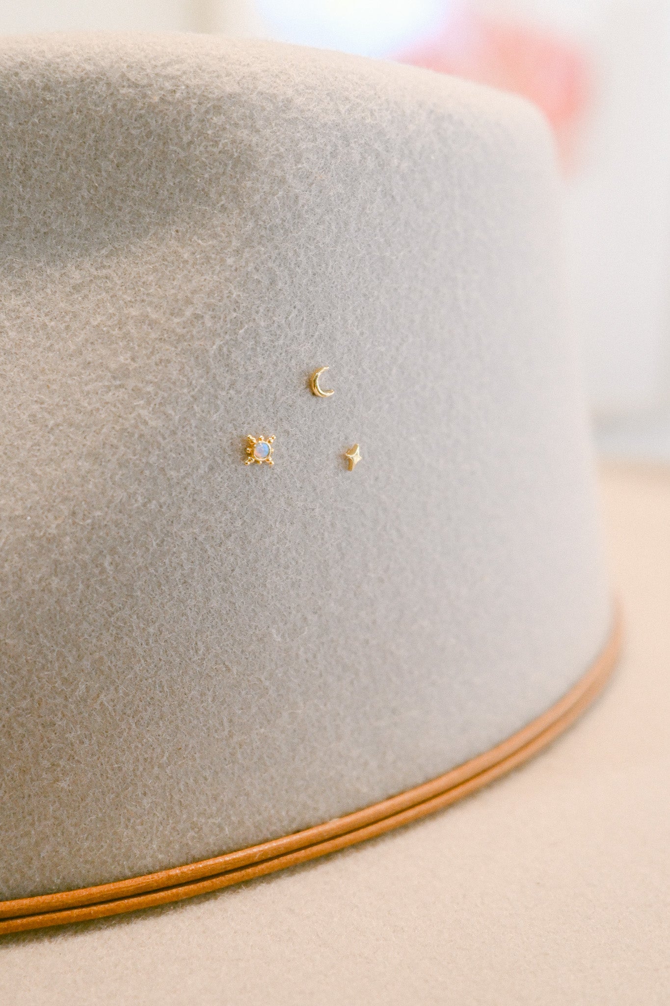 Set of three moon and stars - tiny little accents for your hat that make a big impact on the look! Hat charms require a small hole to be put in the hat before putting the charm in (we recommend using a scratch awl tool if you are doing it yourself!), and come with a rubber earring-style backing for comfort. Gold: 18k gold-dipped; Silver: Rhodium plated.
