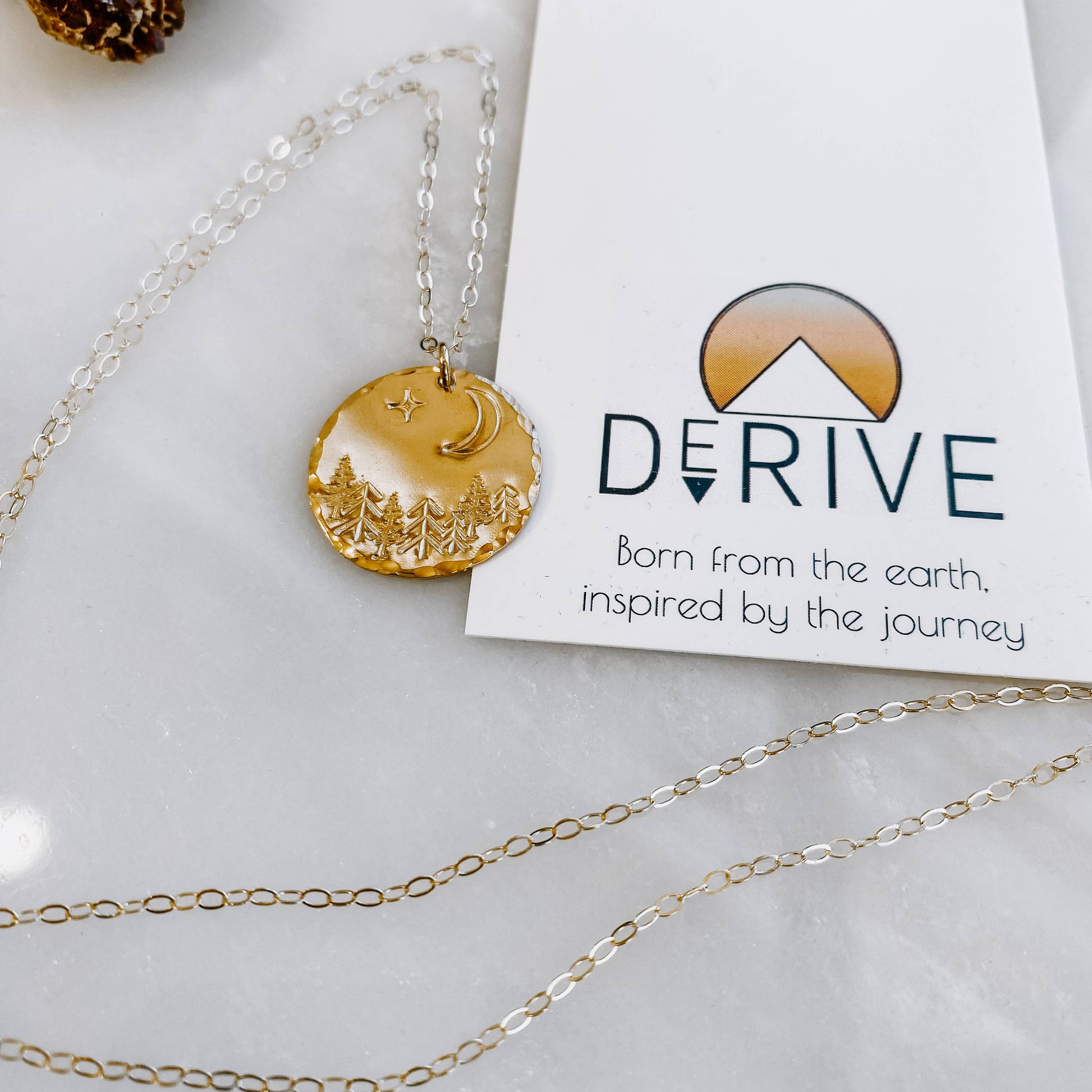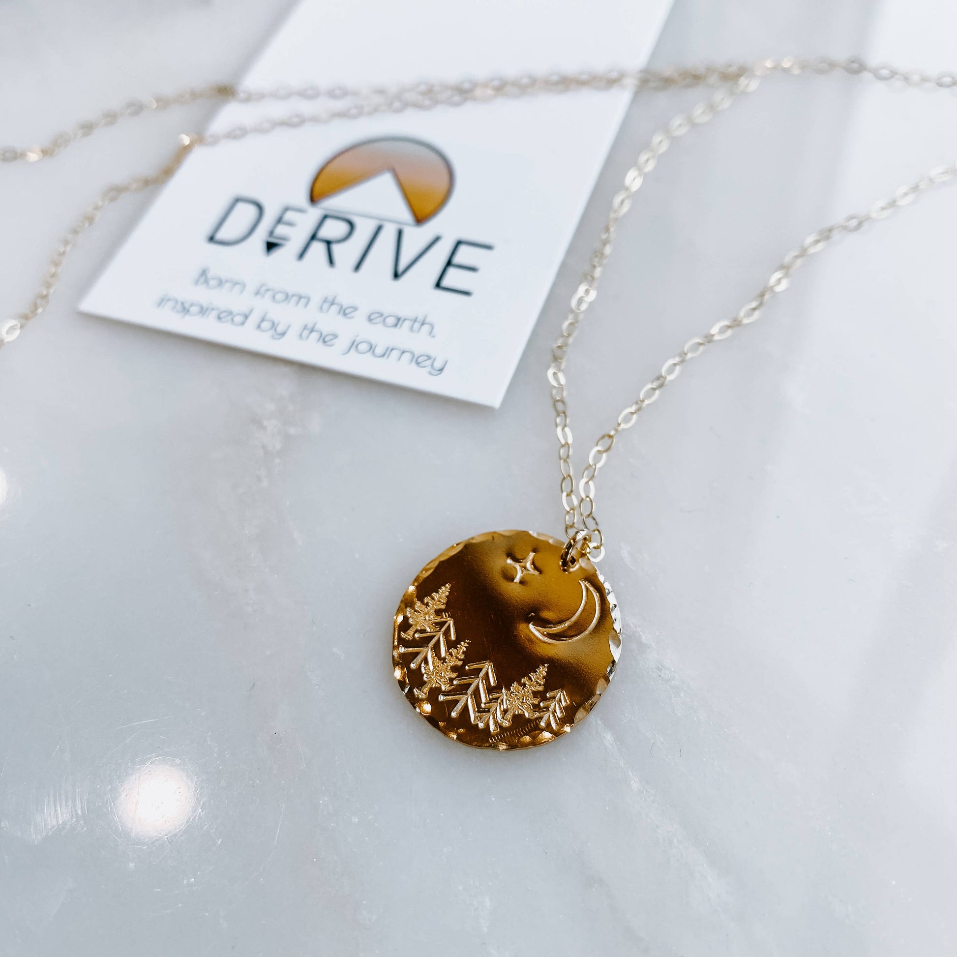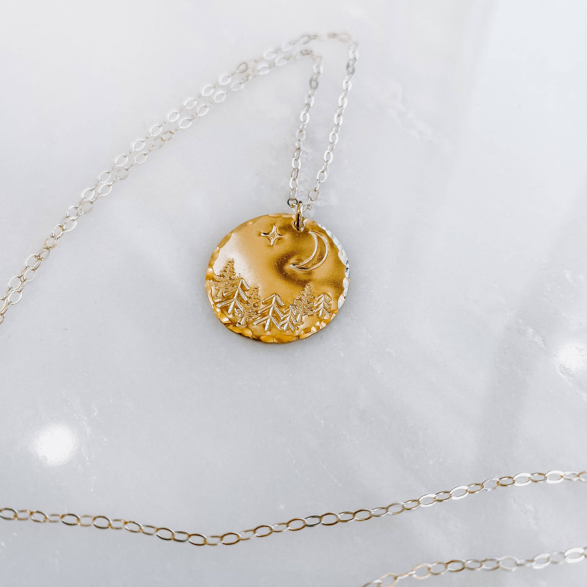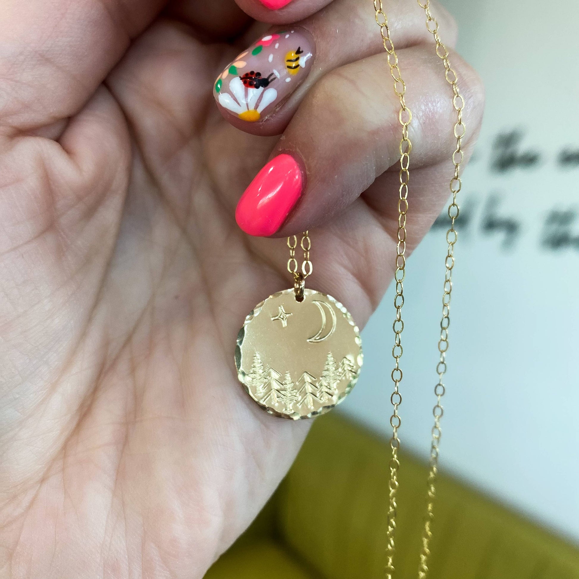 Adorable coin necklace features hand stamping of a little forest scene- trees, moon and a star stamped on a 19mm coin with a dainty chain. Available in 14k gold fill or Sterling Silver. 18" length. Forest theme Forest necklace Coin necklace Woodland necklace Hand Stamped coin necklace