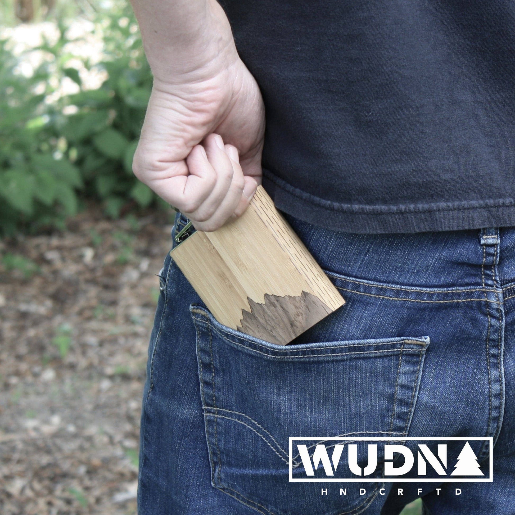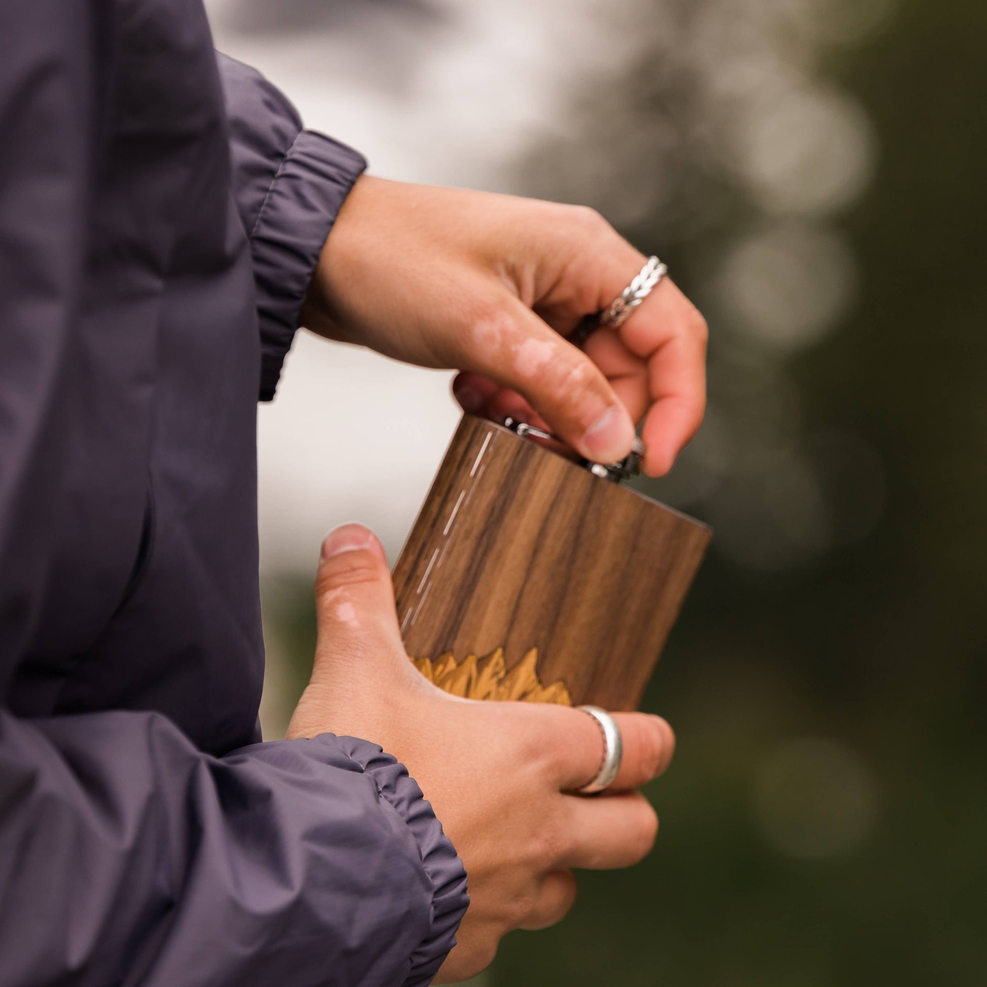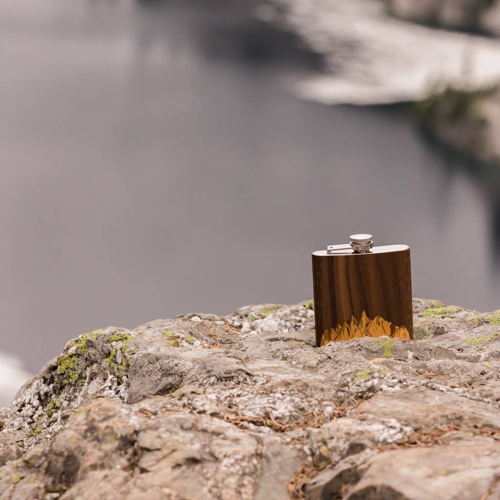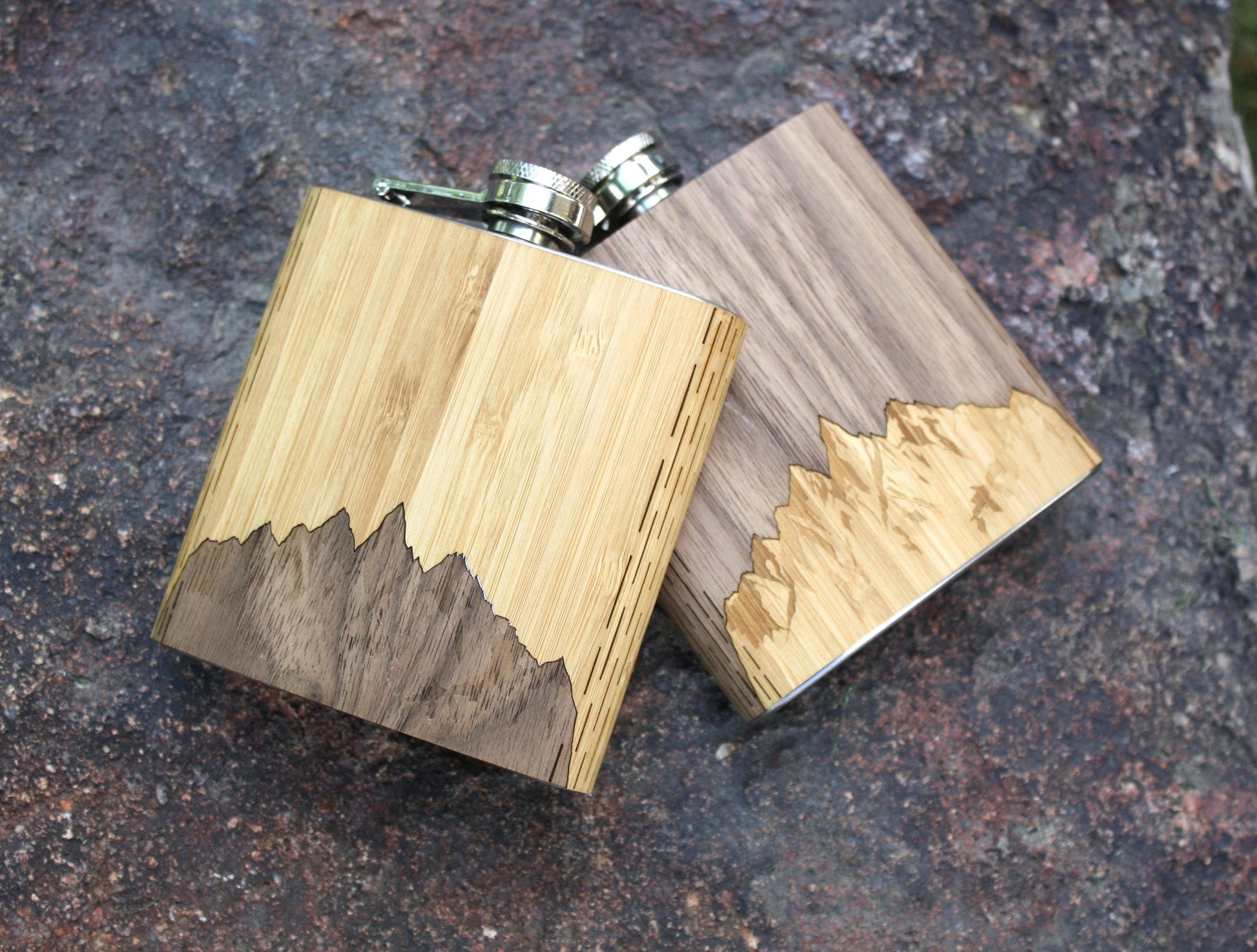 High-quality 6 oz. Wooden Hip Flask (Mountains in Bamboo & Black Walnut) This wooden flask with a sturdy stainless-steel body is a simple and a cost friendly gift for yourself or that all your friends will enjoy. Perfect gifts for your best man, groomsmen, father, grandfather or uncle. * Holds 6 oz. of Whiskey, Scotch, Bourbon or Vodka (if you swing that way) * Stainless Steel Body & Hinge * Sustainable Locally Sourced Wood * Handcrafted in Hidden Springs, Idaho, USA *