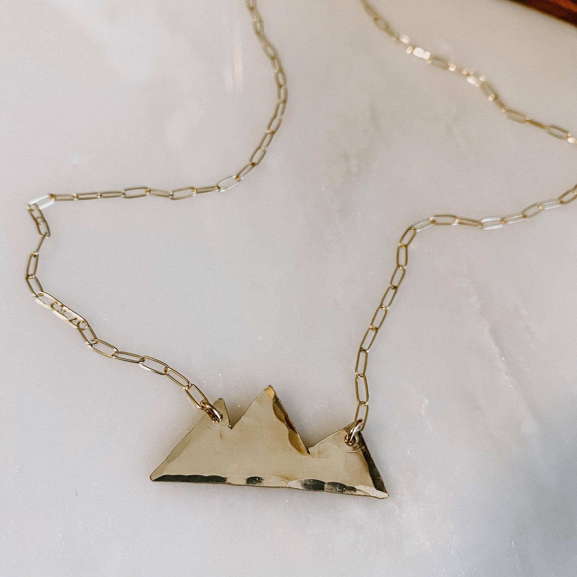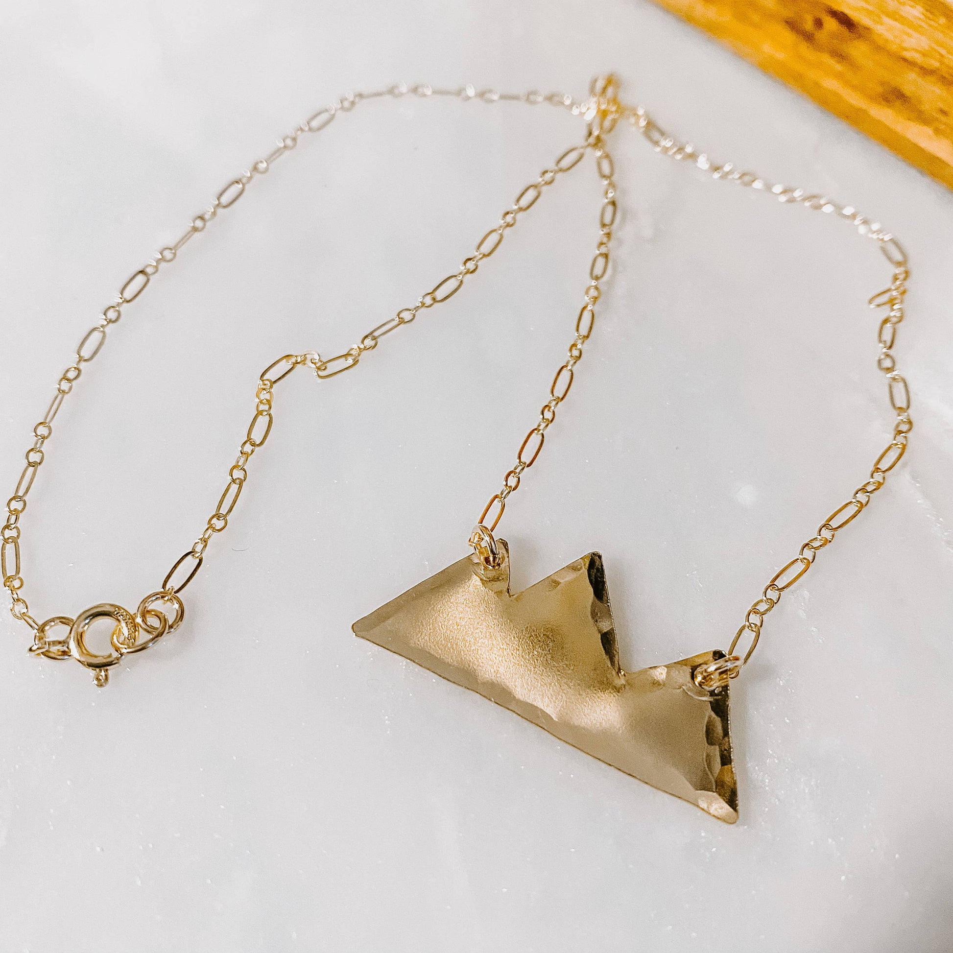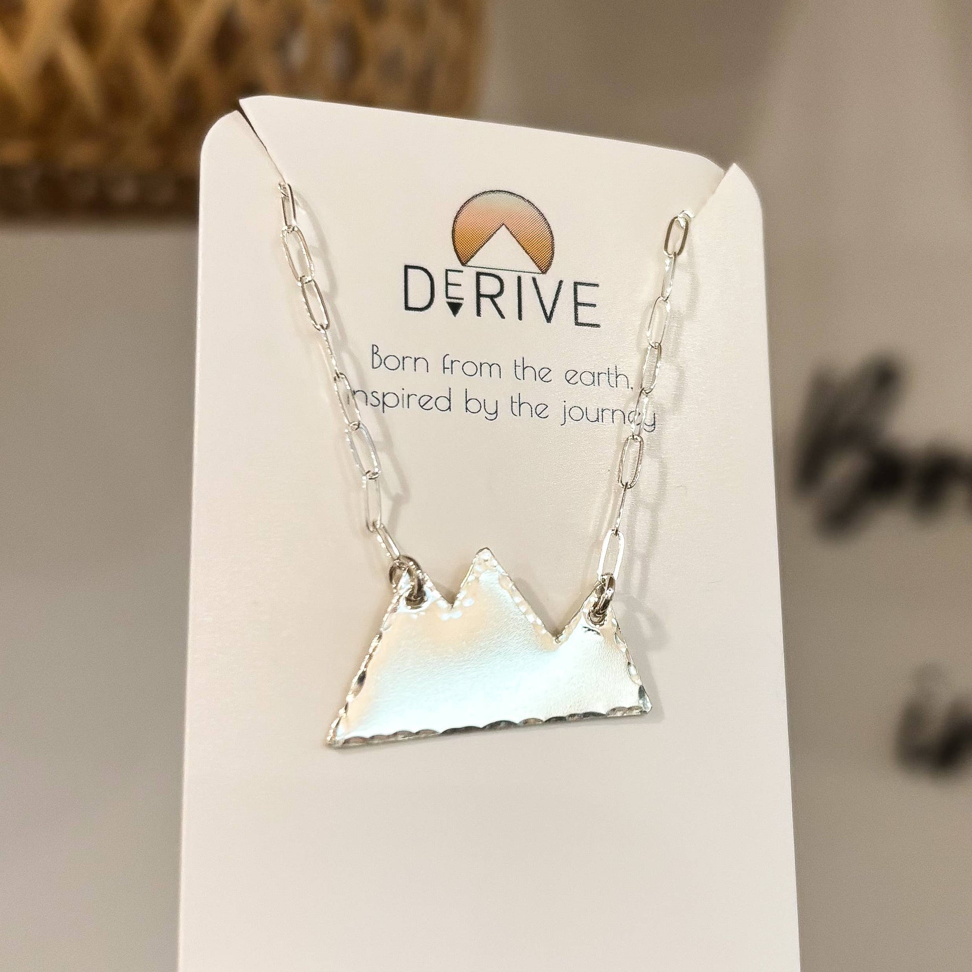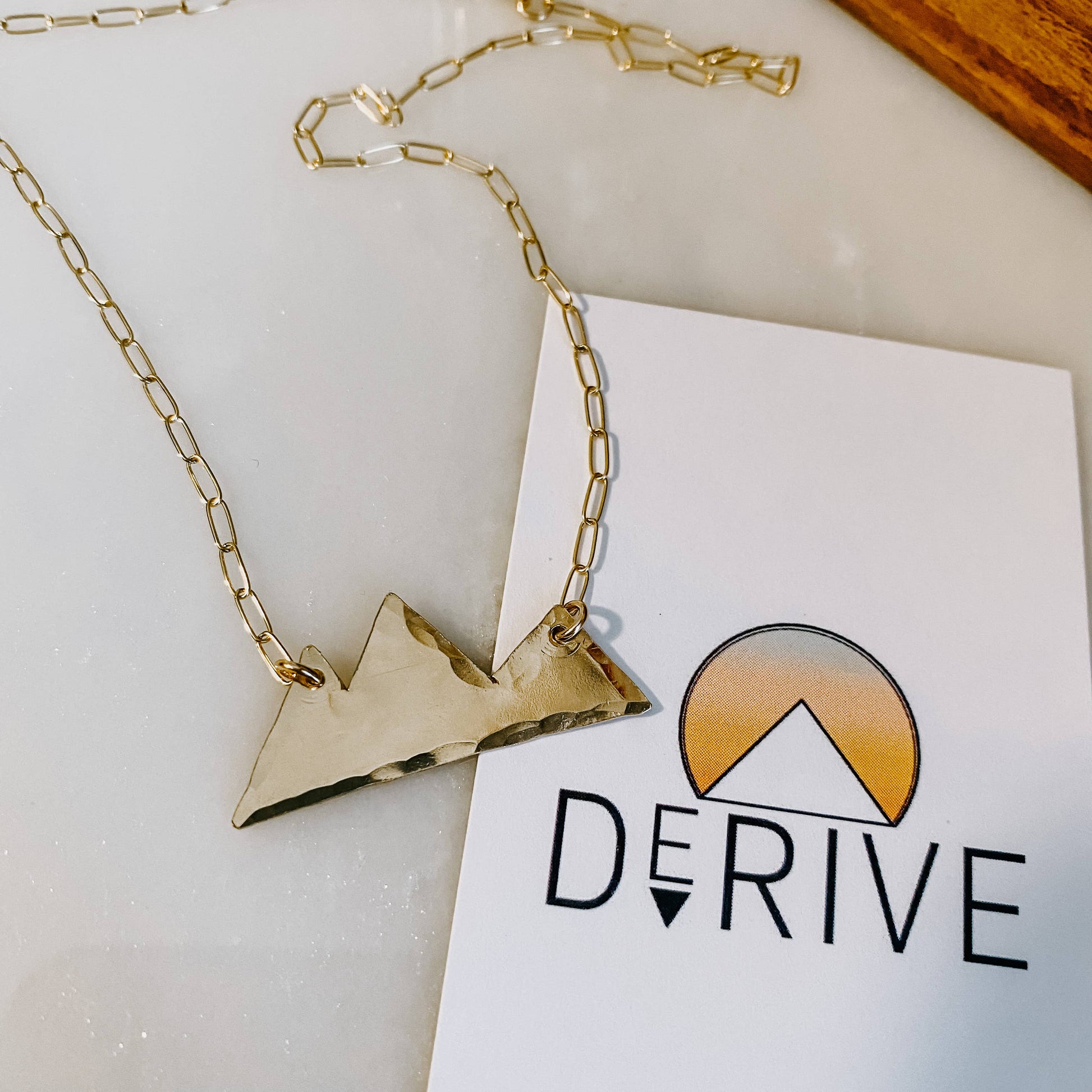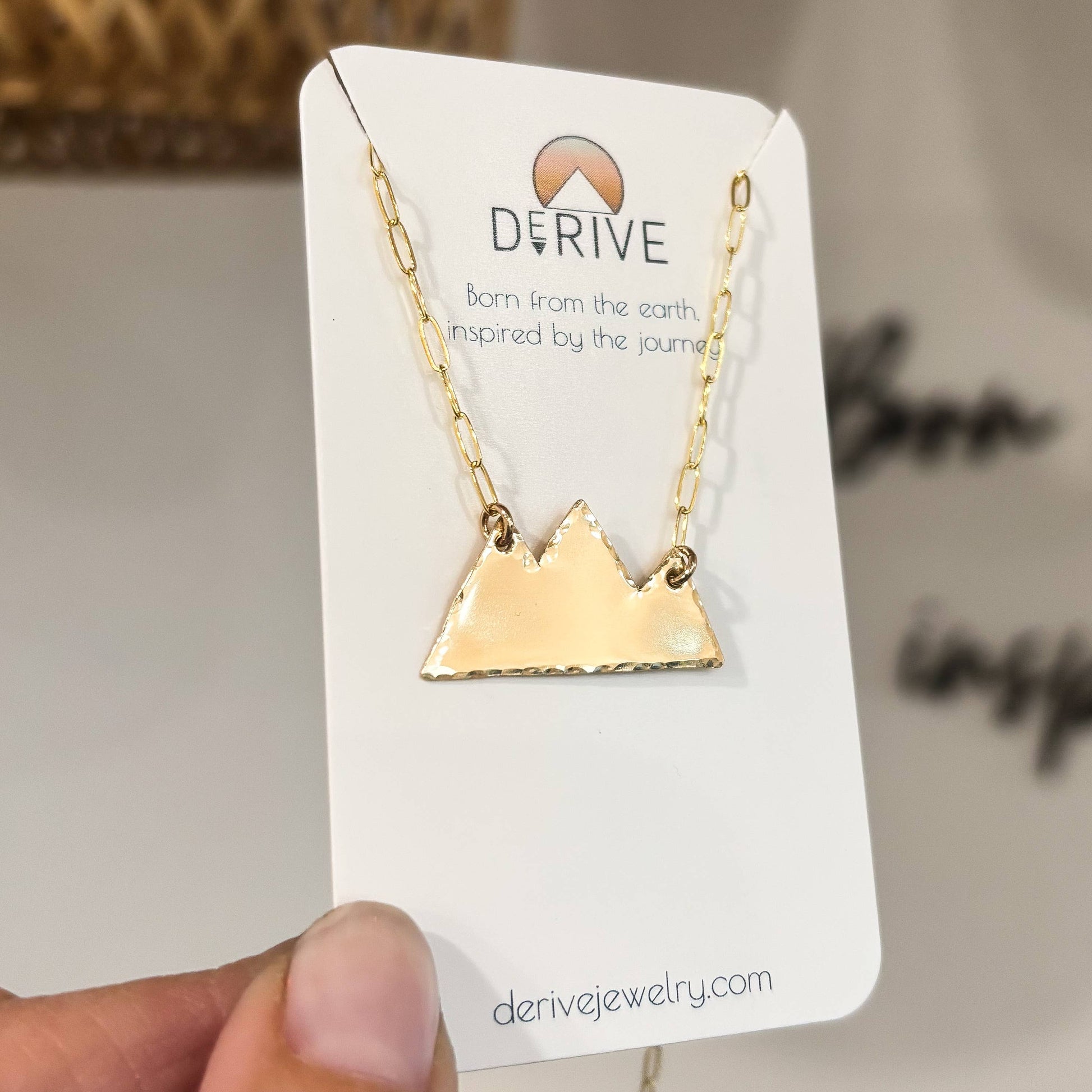 This mountain necklace is hand cut and hammered. Perfect to wear solo or layered up. Available in 14k gold fill or sterling silver, and in 18" length. All Derive Jewelry comes on a branded card back. Hypoallergenic, waterproof and nickel free.