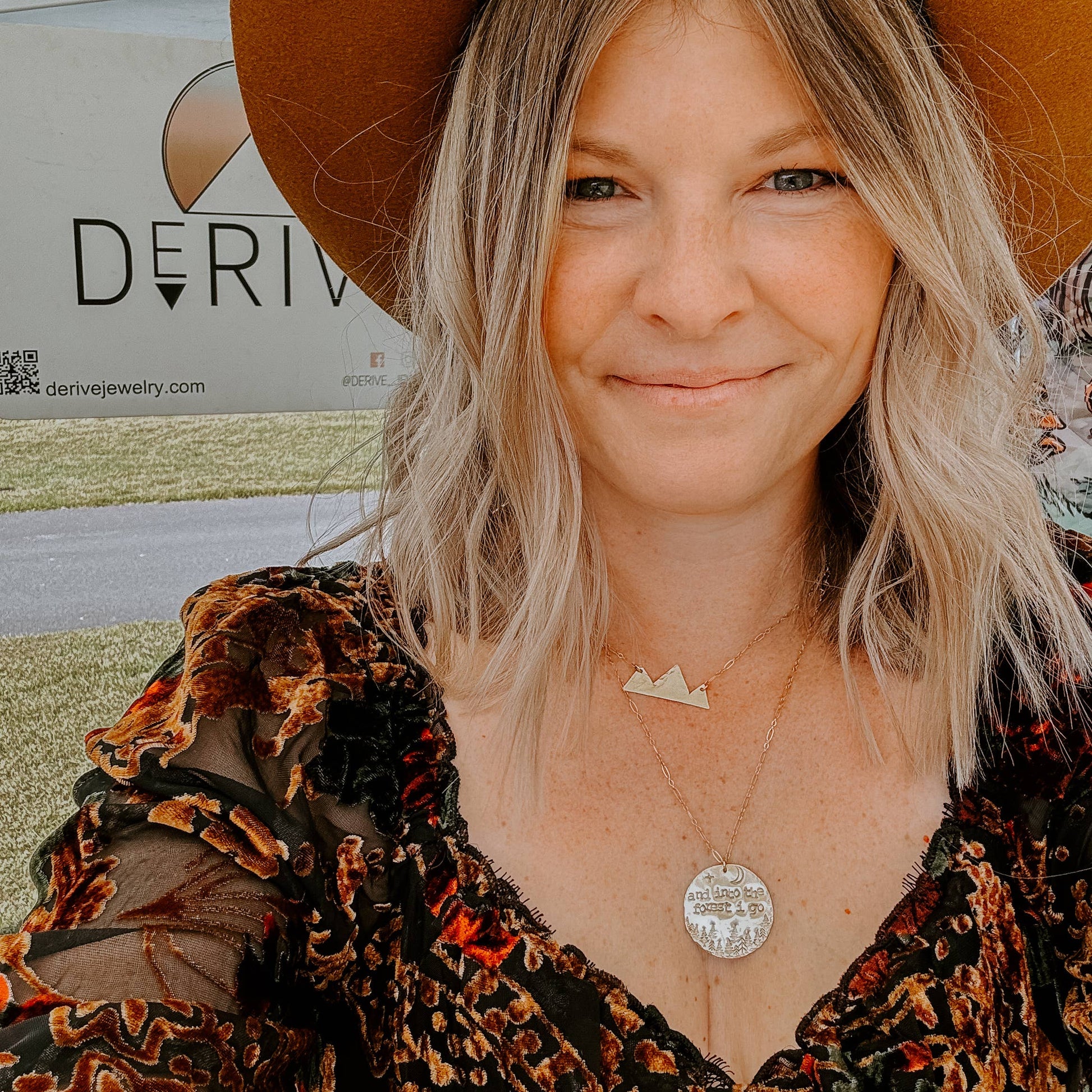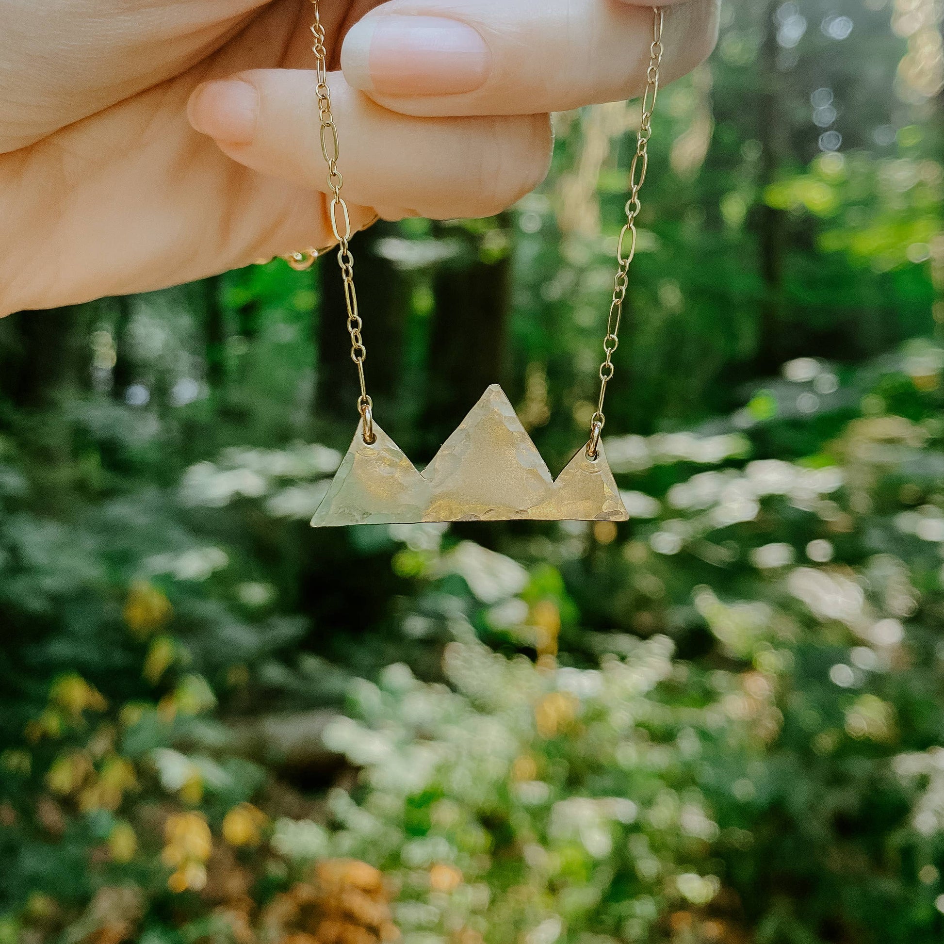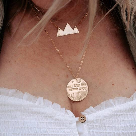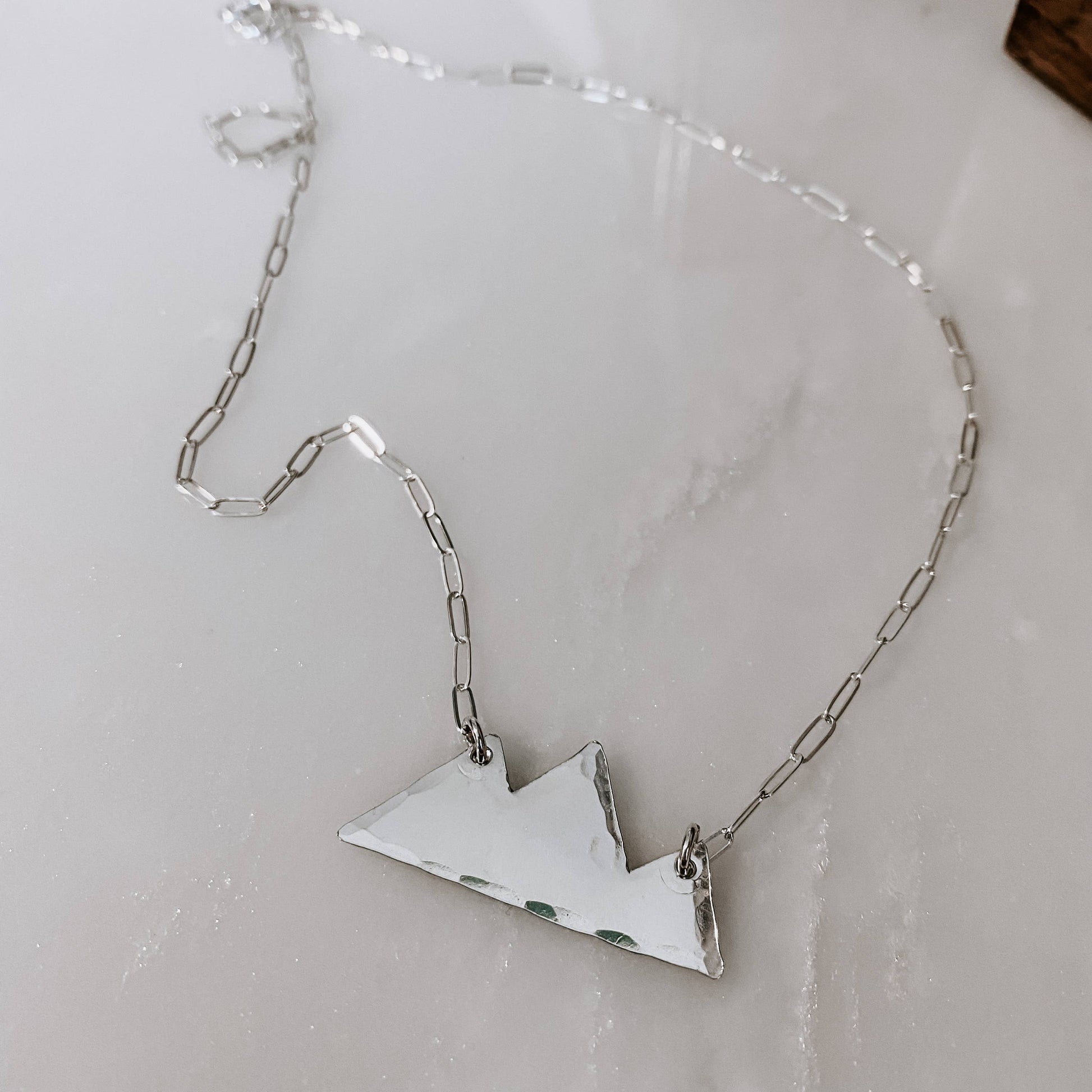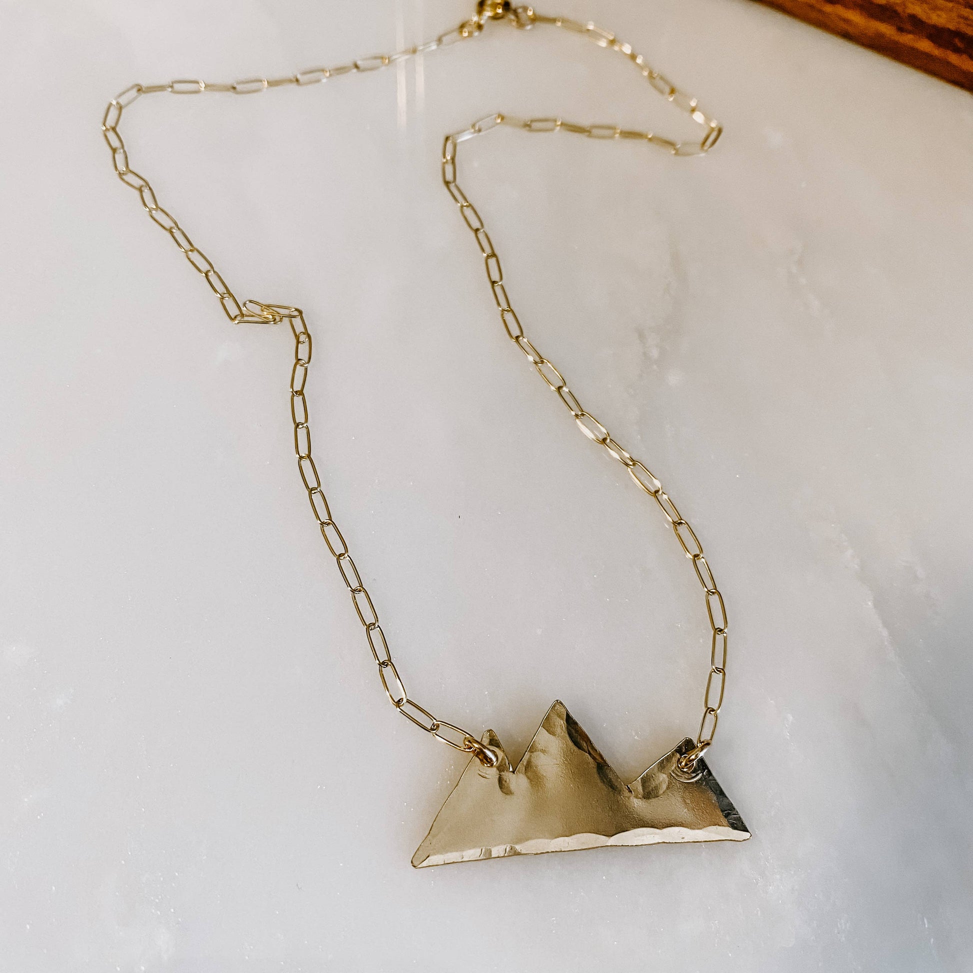 This mountain necklace is hand cut and hammered. Perfect to wear solo or layered up. Available in 14k gold fill or sterling silver, and in 18" length. All Derive Jewelry comes on a branded card back. Hypoallergenic, waterproof and nickel free.