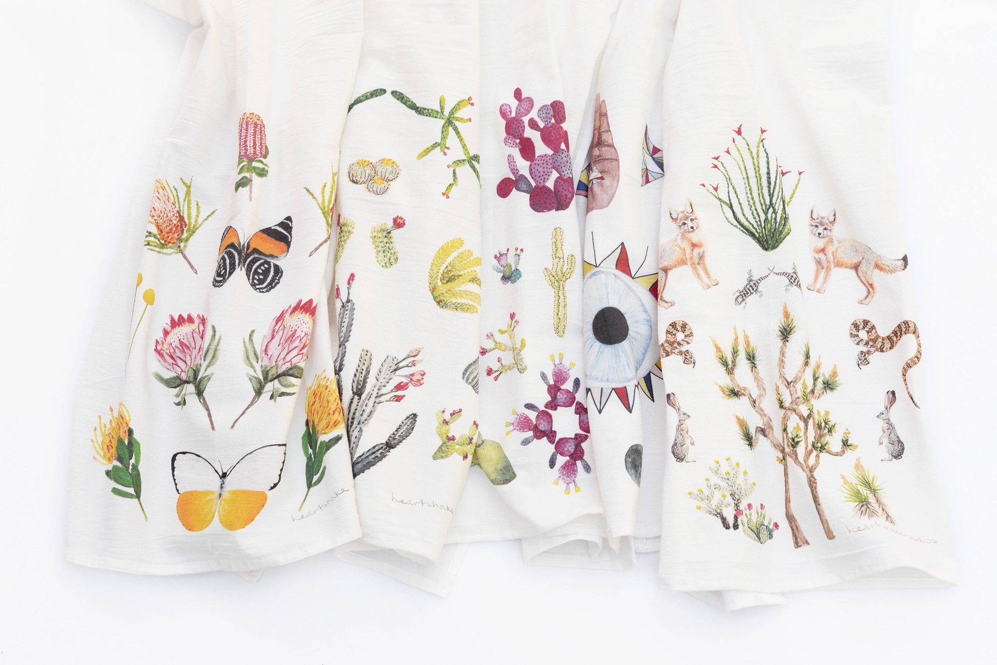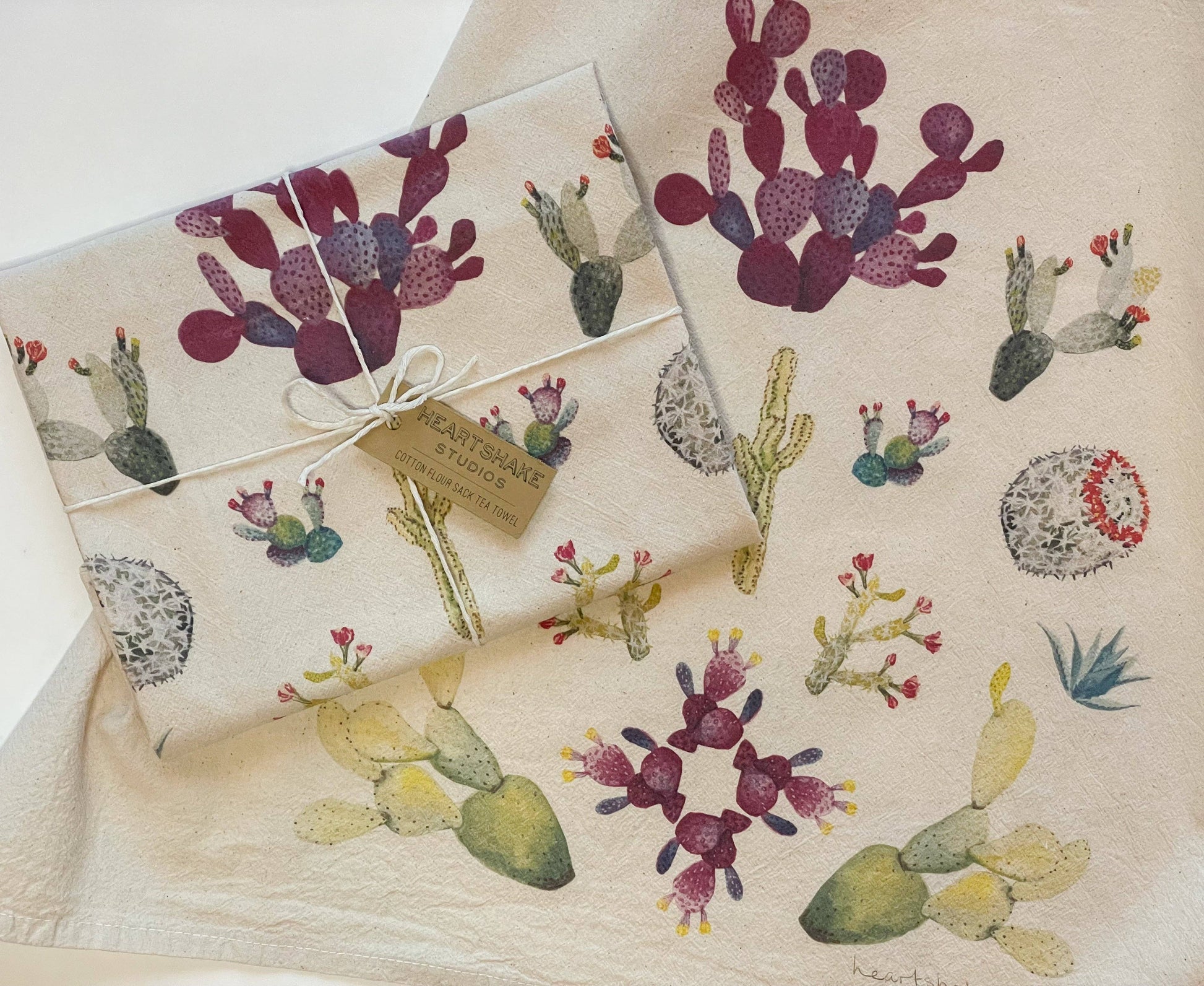 These artistic tea towels will add a colorful botanical touch to your kitchen! The large soft white or unbleached natural cotton flour sack dishtowels are printed with Kit Hutchinson's original gouache painting illustrations arranged in symmetrical mandala inspired designs. This towel features paintings of a variety of colorful flowering cacti! Towels come folded and tied with string with a kraft tag, ready for gift giving. These beautiful towels are the perfect combination of art and function!