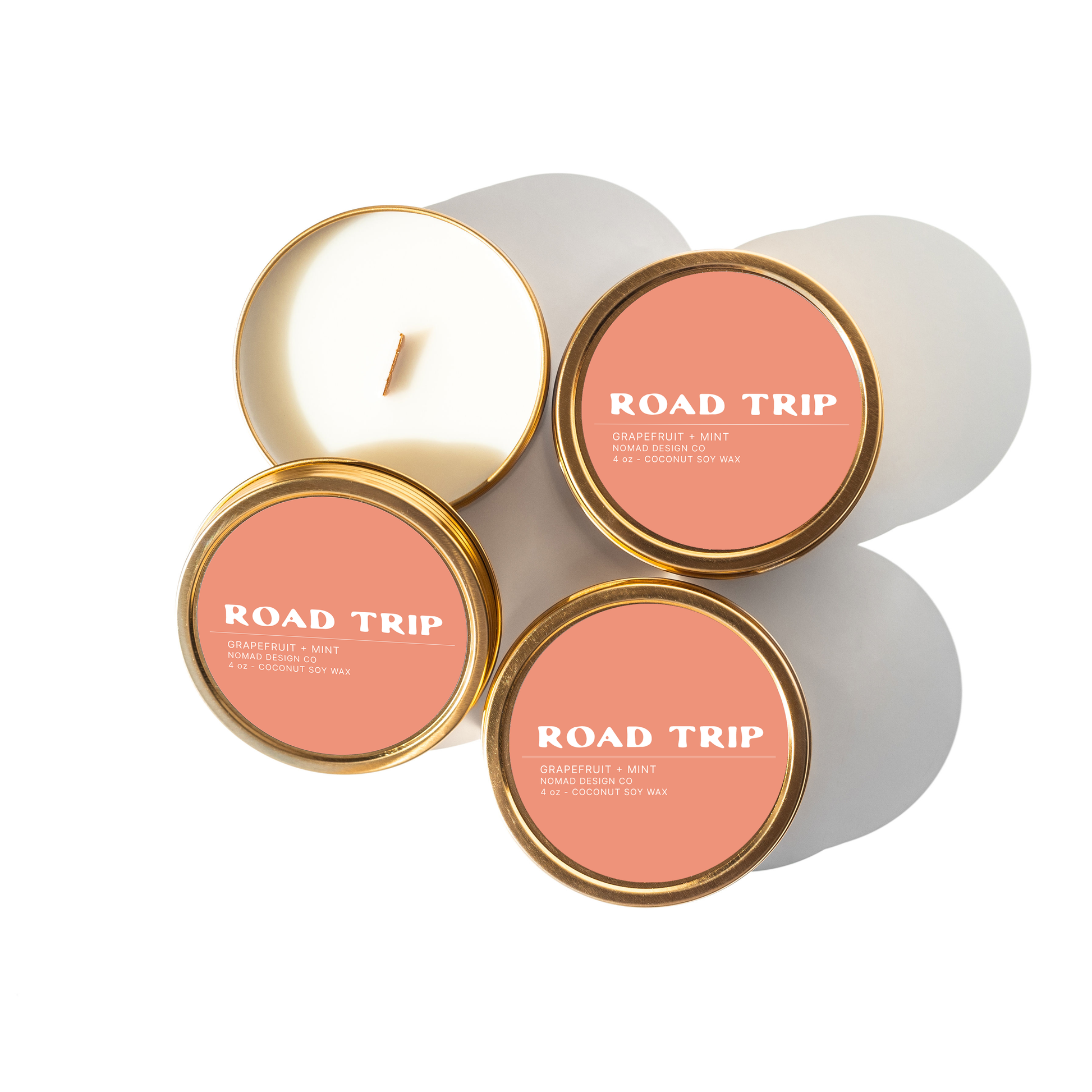 Road Trip is a fun and complex summer fragrance that we enjoy year-round! It’s a bright and enjoyable blend of tangy grapefruit, garden-fresh mint, leathery thyme, crisp apple, bold citrus, and grounding bergamot. Scent Notes: Grapefruit, garden-fresh mint, apple Our travel tin candles are perfect for those who love to travel without missing the comforts of home. Bring your favorite scent with you anywhere you go. The size of these candles make them perfect for packing in your luggage or taking on weekend getaways. Our candles are made with all natural coconut soy wax and a crackling wood wick. We use premium fragrance oil that is phthalate-free, paraben-free, non-toxic and gluten-free. Each travel tin is hand poured into a 4oz gold tin. Approximately 20 hours of burn time. Size: 4oz Tin Height: 1.1" Tin Diameter: 3.2"