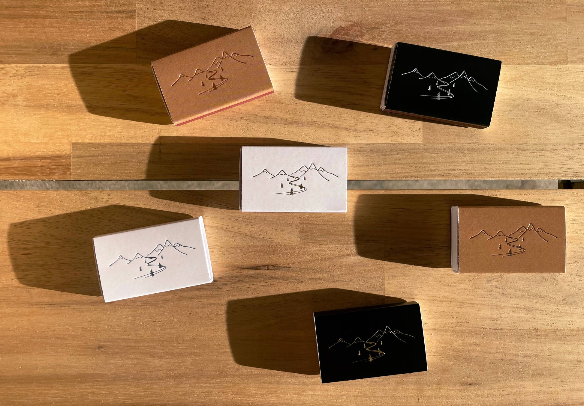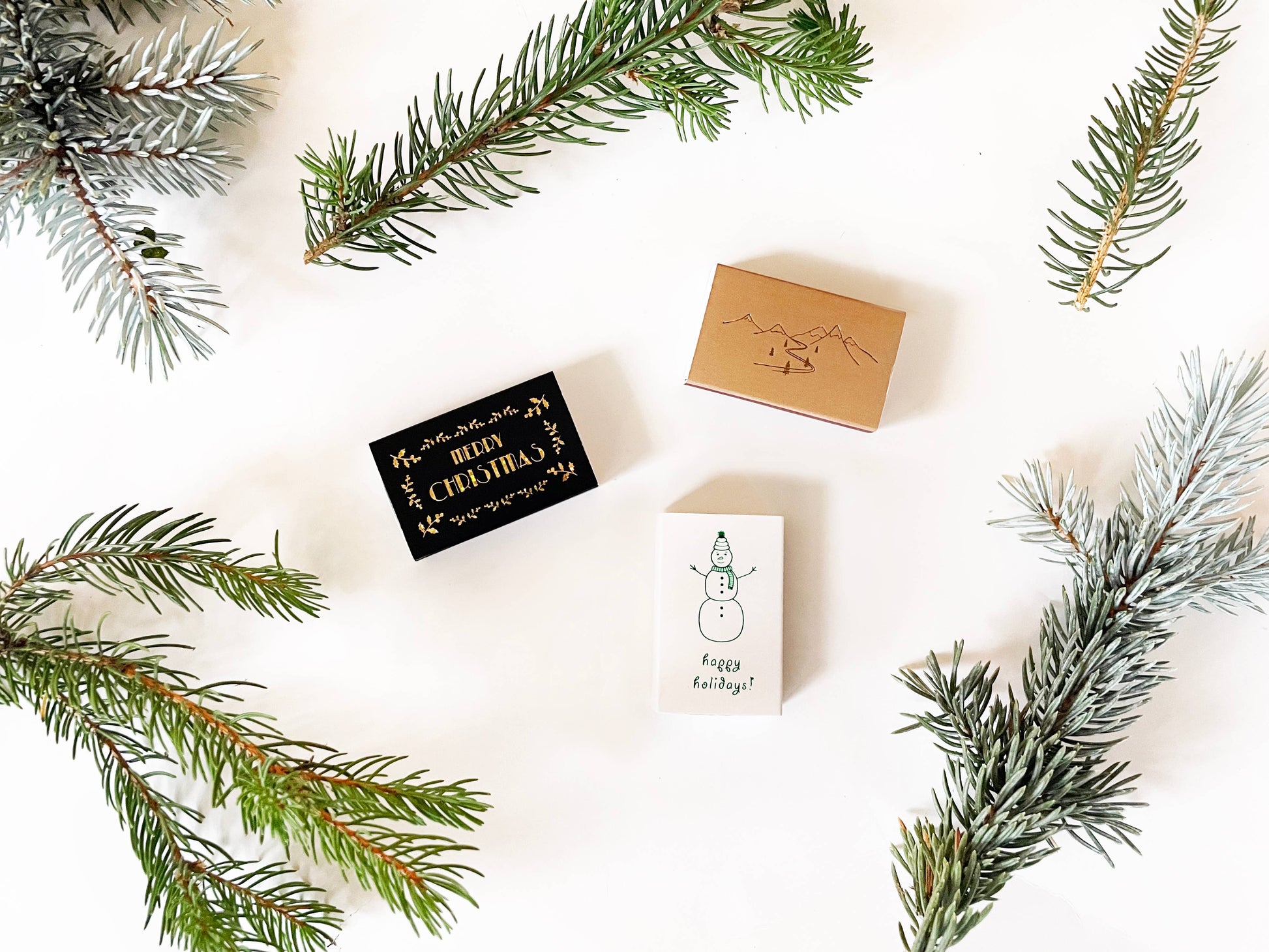 With an illustration of a wintry scene of snow capped mountains (based on the Three Sisters Mountains in the Cascade Mountain Range near Bend, Oregon) in your choice of foil color on a black, white, or gold box, this lovely little matchbox sets the perfect wintry touch and celebrates each snow day in its natural setting. These festive match holders will brighten up the long evenings all winter through Hanukkah, solstice celebrations, lantern walks, après skiing, snowboarding, snowshoeing, snowtubing, or sledding relaxation, yuletide festivities, Secret Santa parties, tree cutting adventures, Christmas parties, stocking stuffers, and into the new year as the days finally start to get longer.