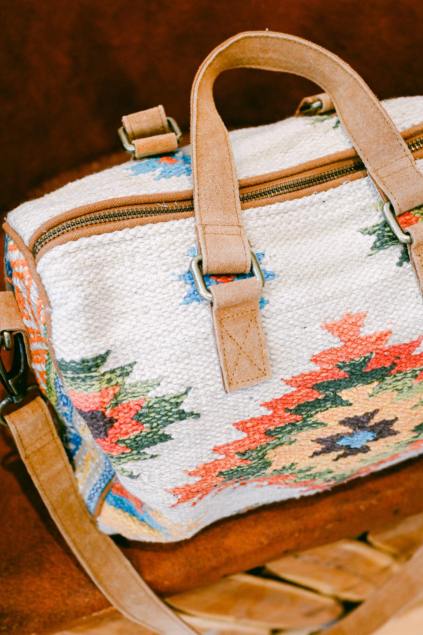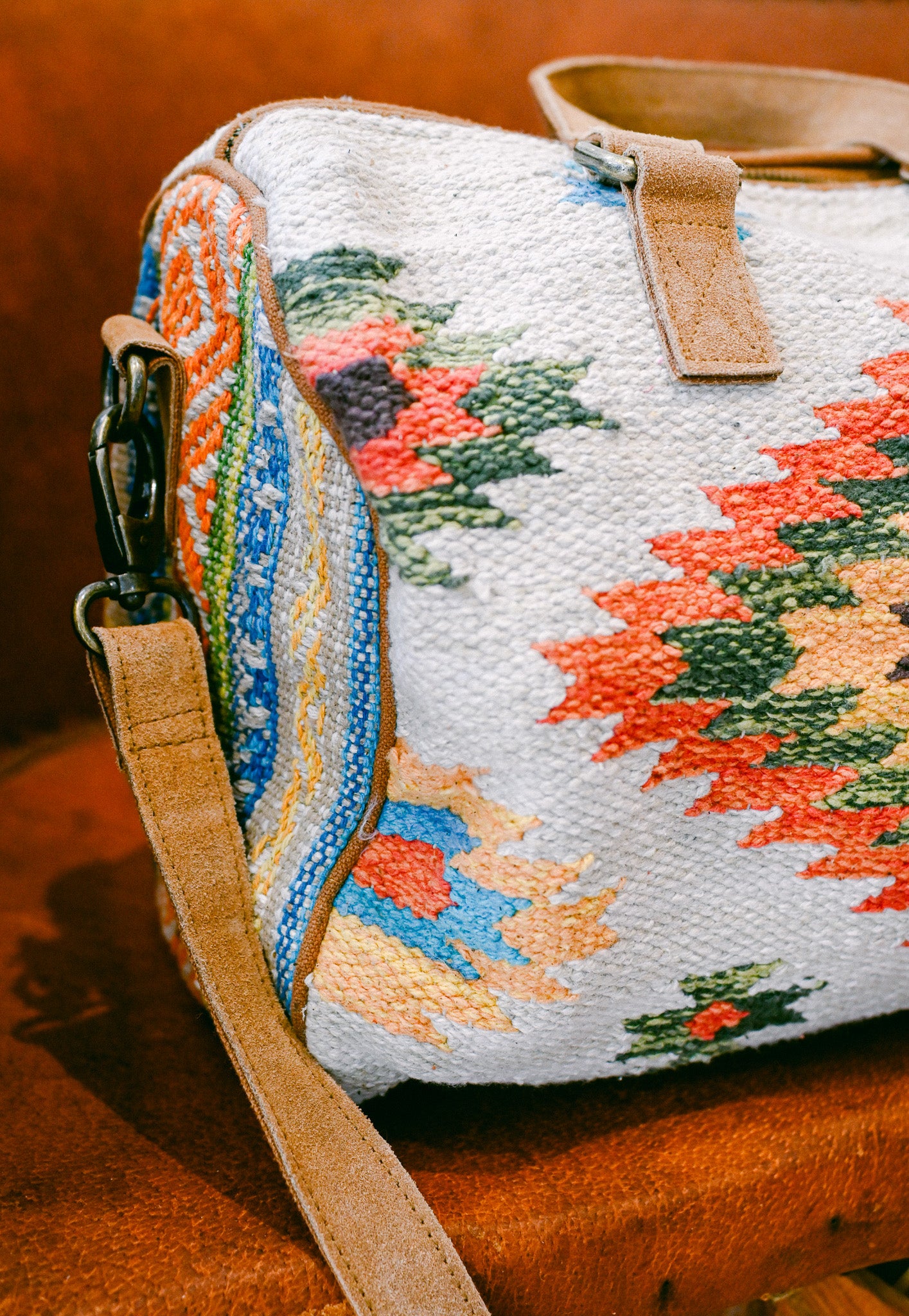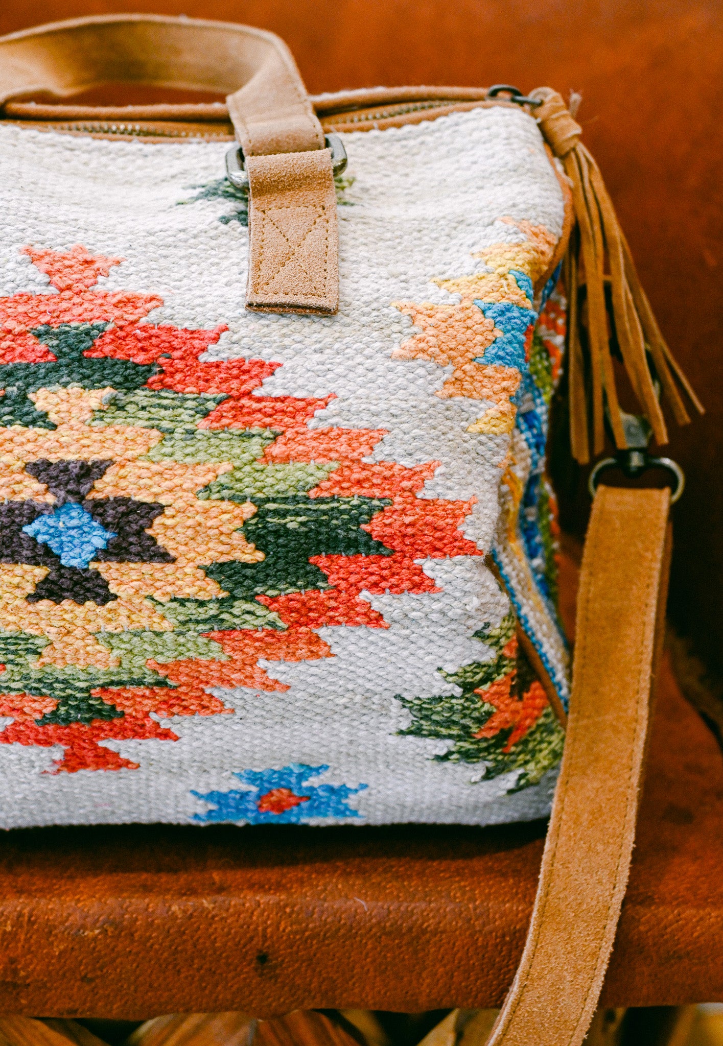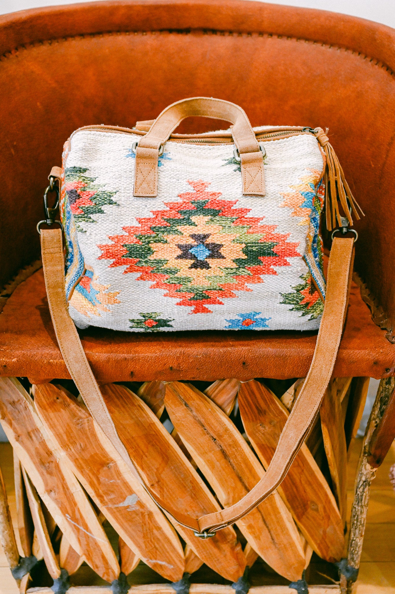 Boston bag with leather details in a southwestern kilim fabric - Harlow pattern