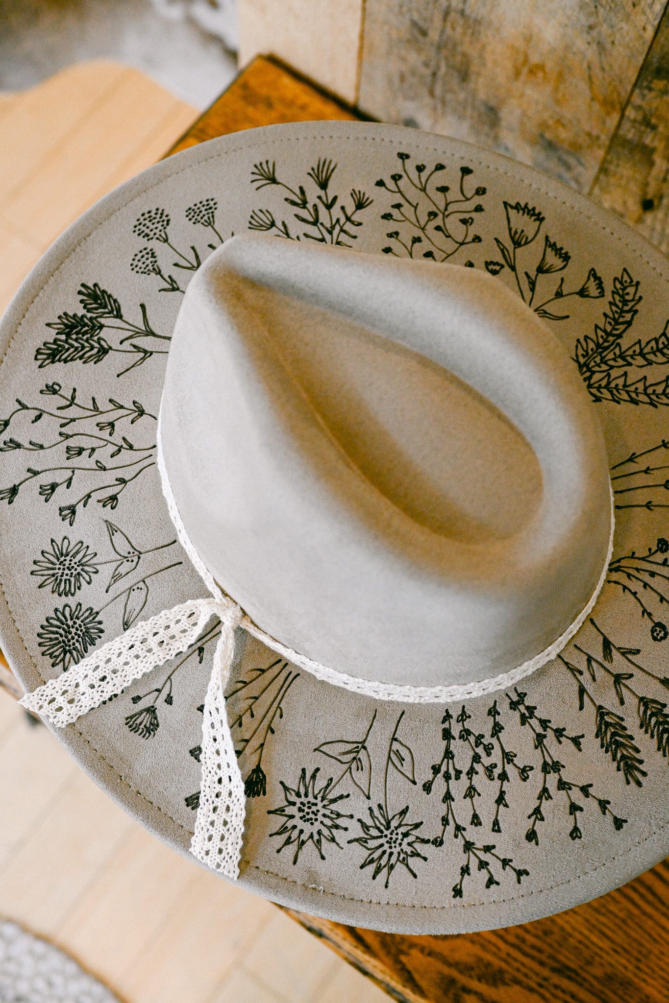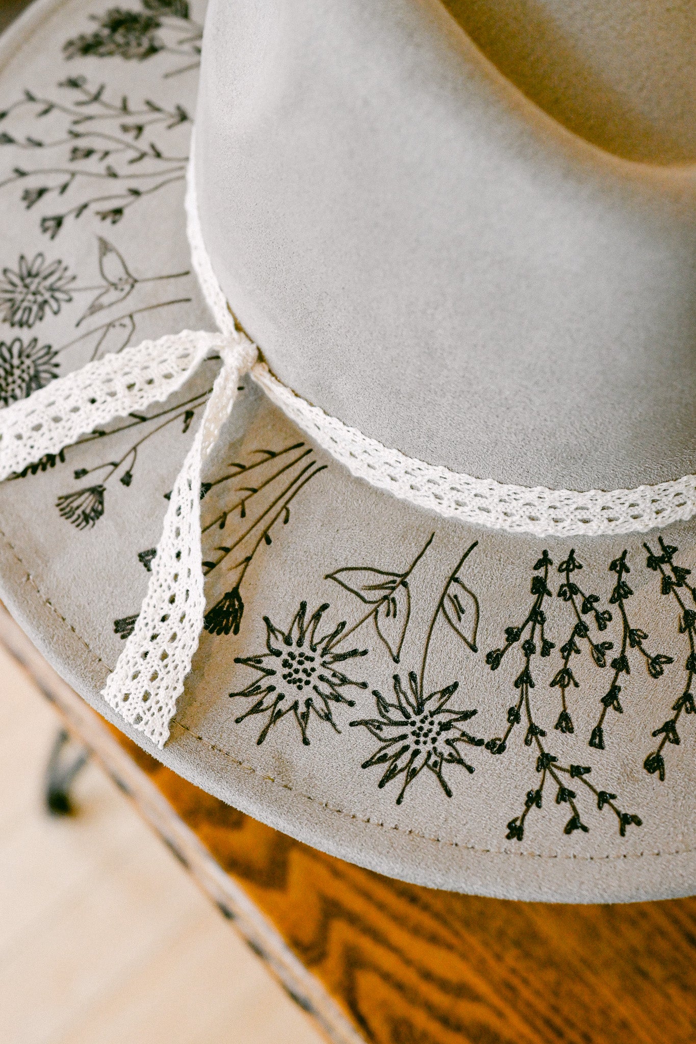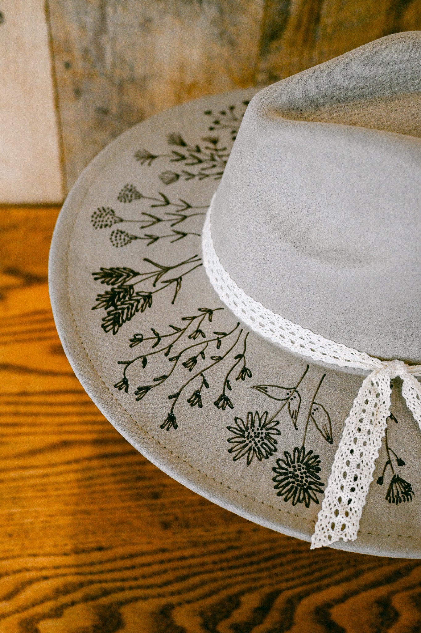 The Bailey is a one-of-a-kind hat featuring hand-burned Colorado wildflowers around the outer brim and on the inside brim. Each wildflower is meticulously burned freehand on the hat by The Mercantile Ouray owner, Kelly Leggett, here in Ouray, Colorado. The Bailey is a gray-beige colored vegan suede flat-brim rancher hat, with an adjustable tie inside for fit. The Bailey comes with an ivory cotton crochet detachable ribbon tie.
