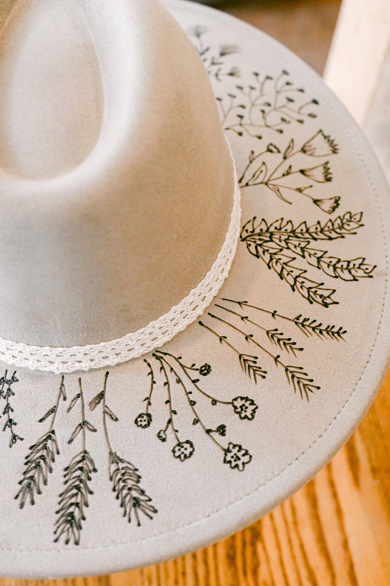 Each hand-burned wildflower hat is completely unique and one-of-a-kind, and therefore not returnable or exchangeable.