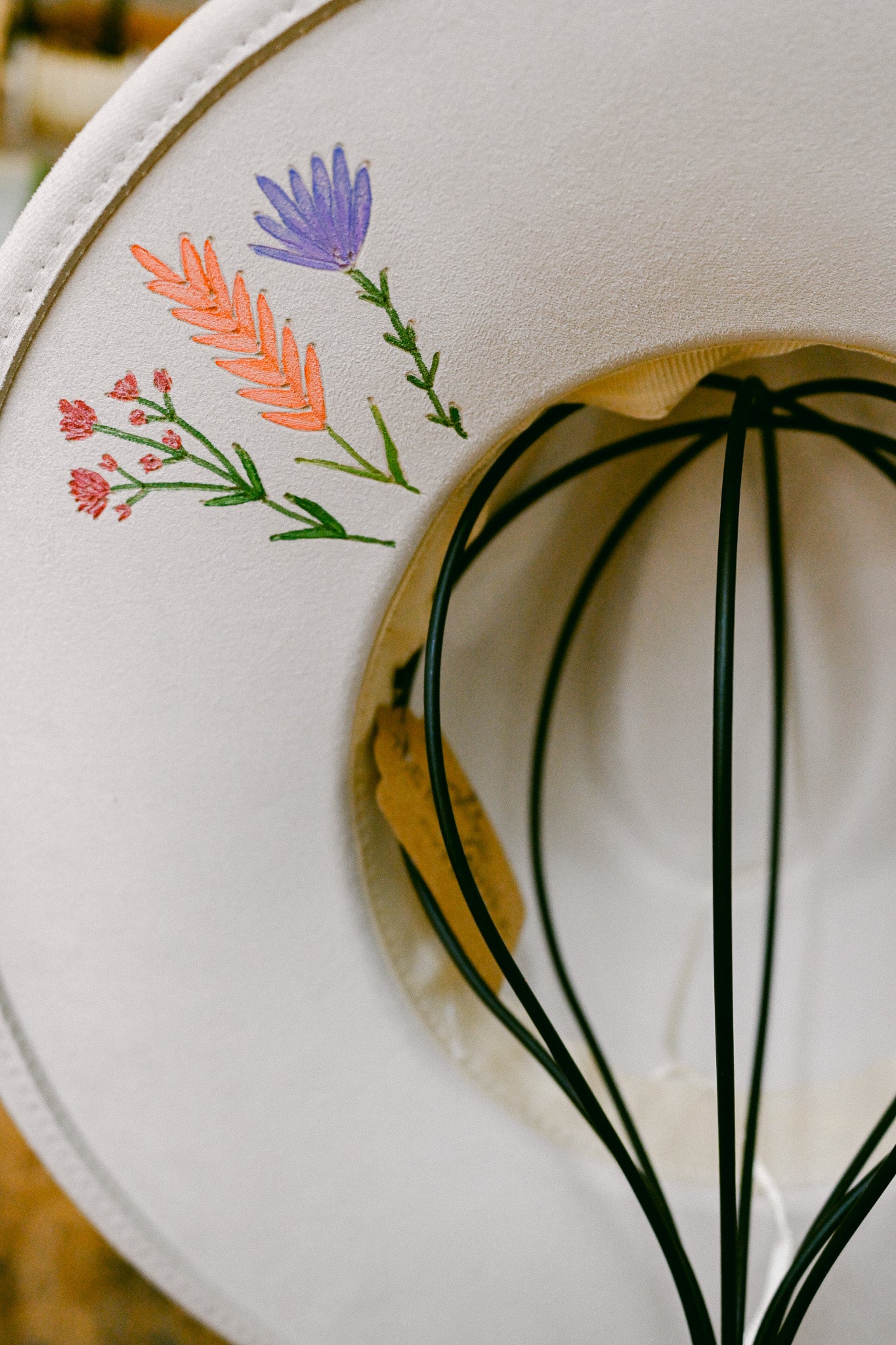 The Bonnie is a one-of-a-kind hat featuring hand-burned and hand-painted Colorado wildflowers on the outer brim, crown, and inside brim. Each wildflower is meticulously burned and painted freehand on the hat by The Mercantile Ouray owner, Kelly Leggett, here in Ouray, Colorado. The Bonnie is a cream colored vegan suede flat-brim rancher hat, with an adjustable tie inside for fit. The Bonnie comes with an ivory crochet lace detachable ribbon tie.