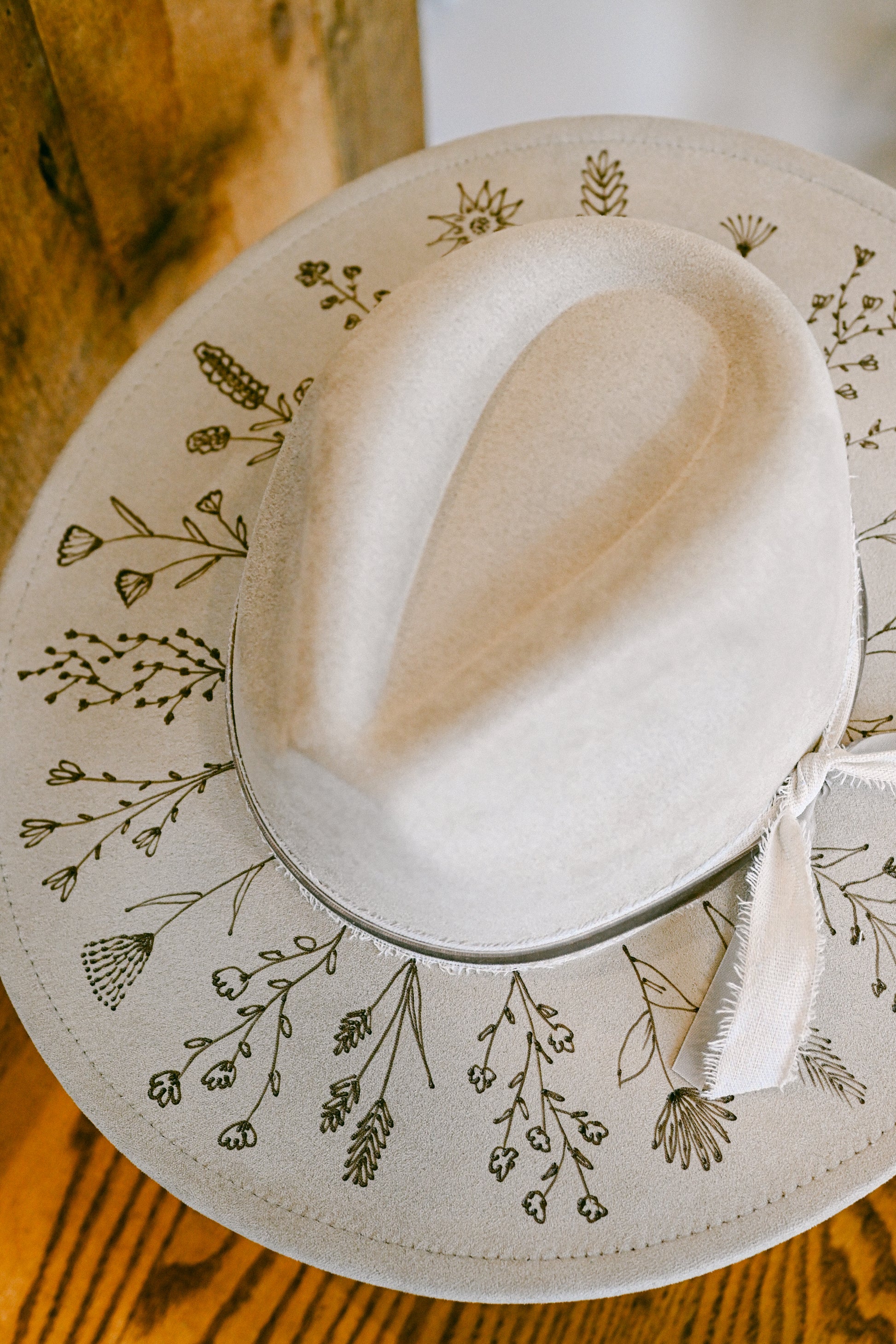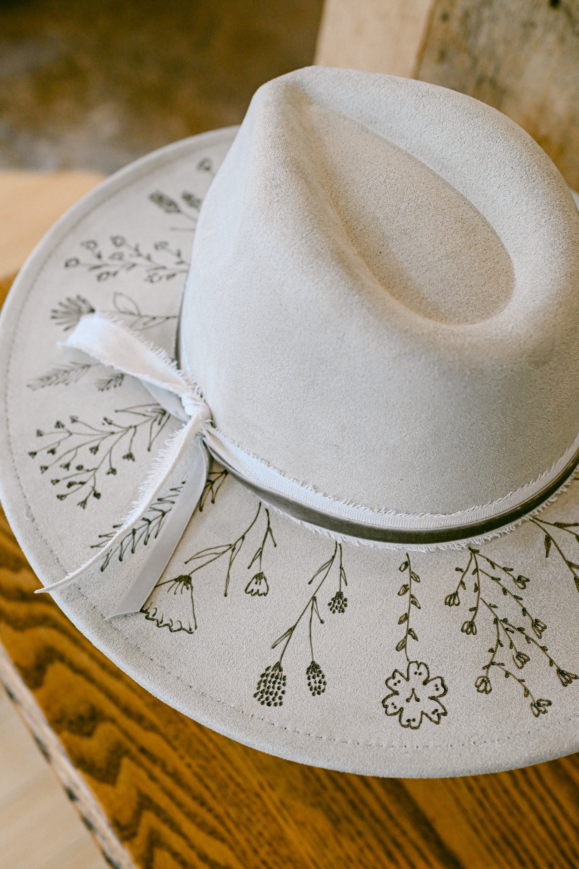 The Cheyenne is a one-of-a-kind hat featuring hand-burned Colorado wildflowers around the outer brim. Each wildflower is meticulously burned freehand on the hat by The Mercantile Ouray owner, Kelly Leggett, here in Ouray, Colorado. The Cheyenne is a gray-beige colored vegan suede flat-brim rancher hat, with an adjustable tie inside for fit. The Cheyenne comes with a gray-brown velvet ribbon layered over a white frayed cotton ribbon (detachable).