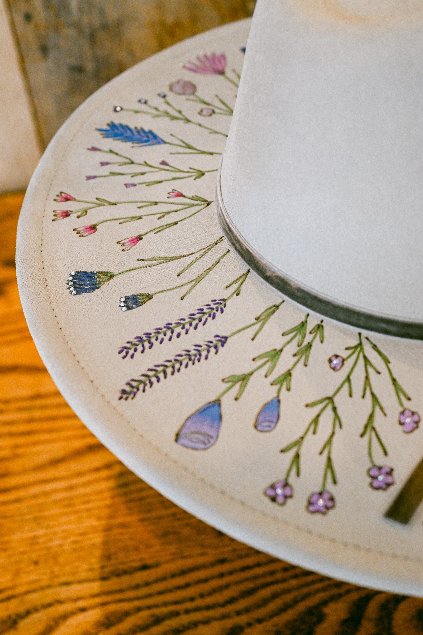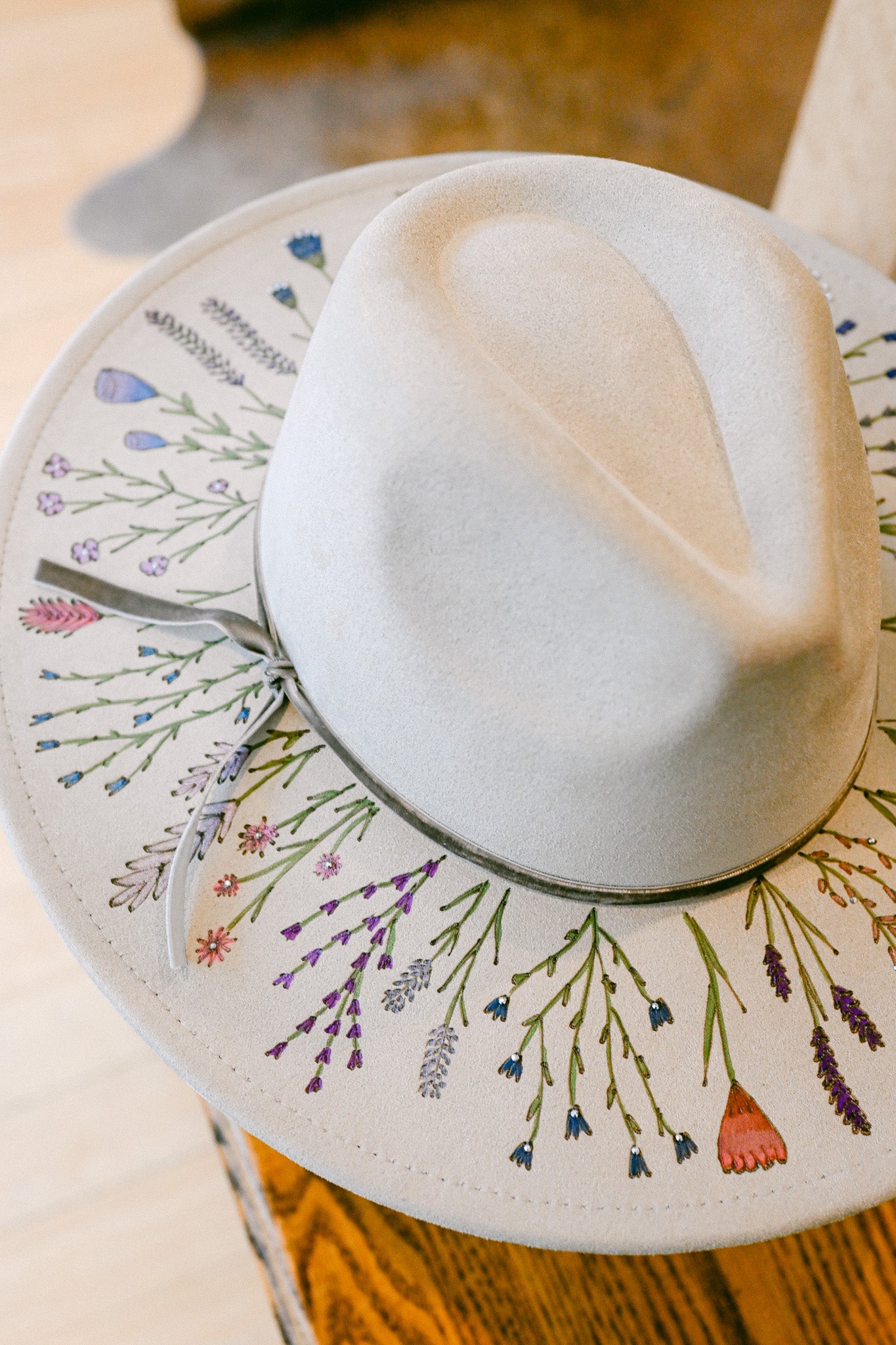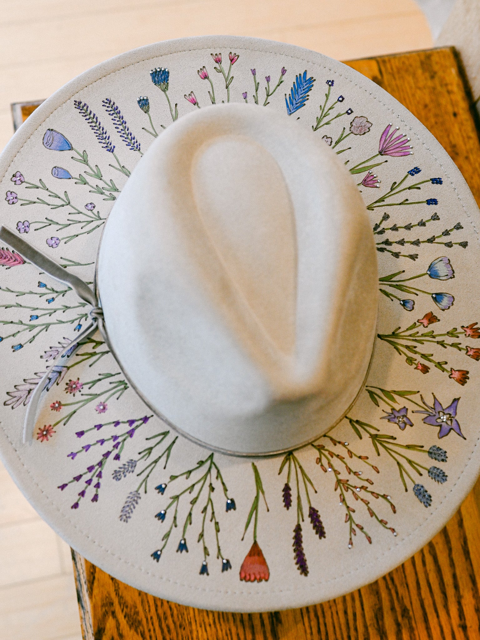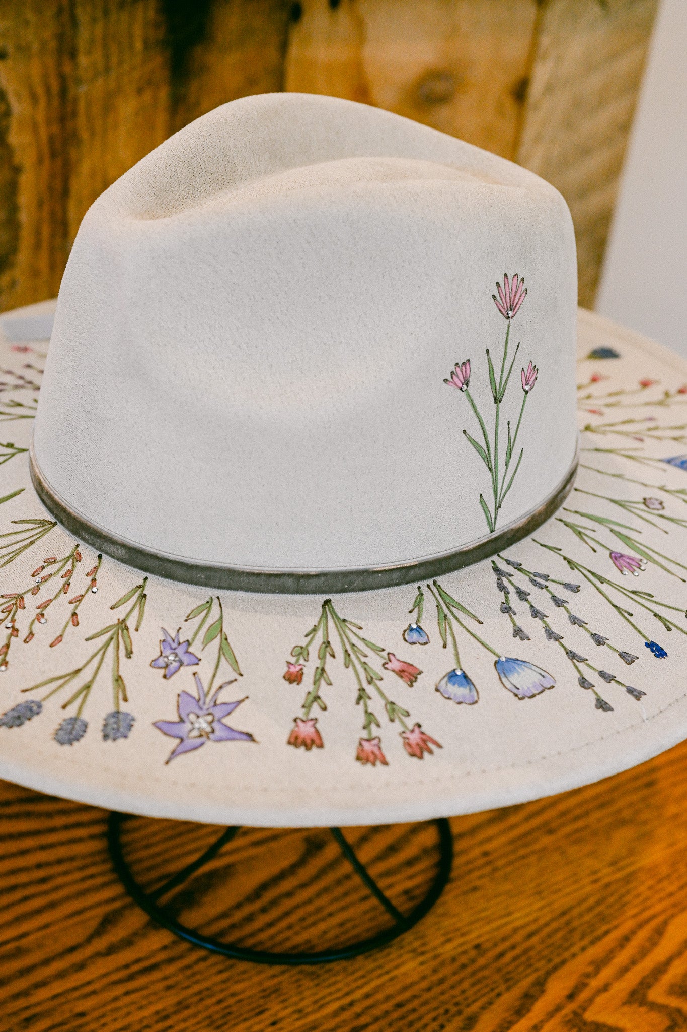 The Gemma is a one-of-a-kind hat featuring hand-burned and hand-painted Colorado wildflowers around the outer brim, on the crown, and on the inside brim. Each wildflower is meticulously burned and painted freehand on the hat by The Mercantile Ouray owner, Kelly Leggett, here in Ouray, Colorado. The Gemma is a light gray colored vegan suede flat-brim rancher hat, with an adjustable tie inside for fit. The Gemma is adorned with hand-placed crystals and a gray velvet detachable tie.
