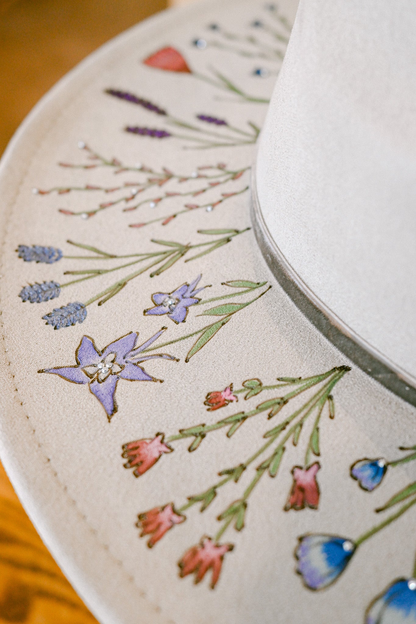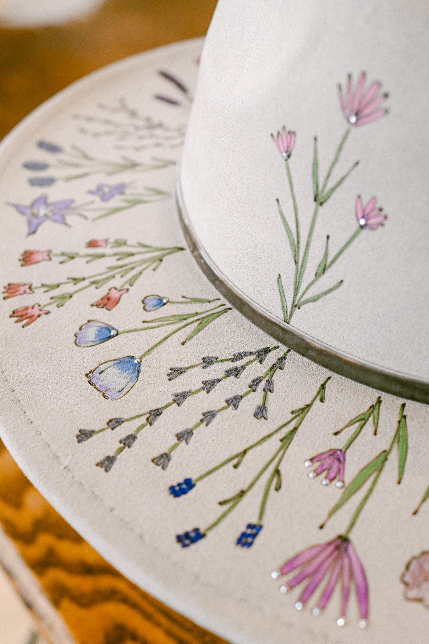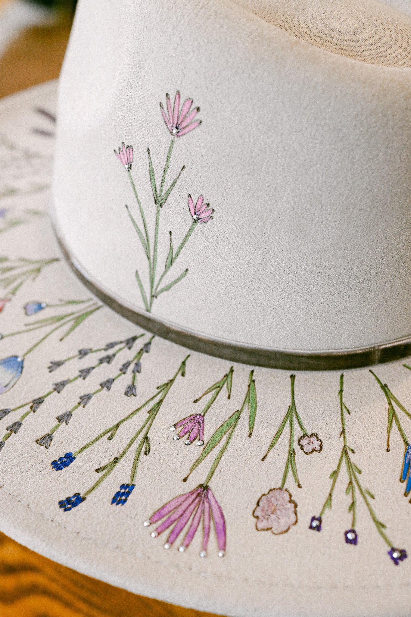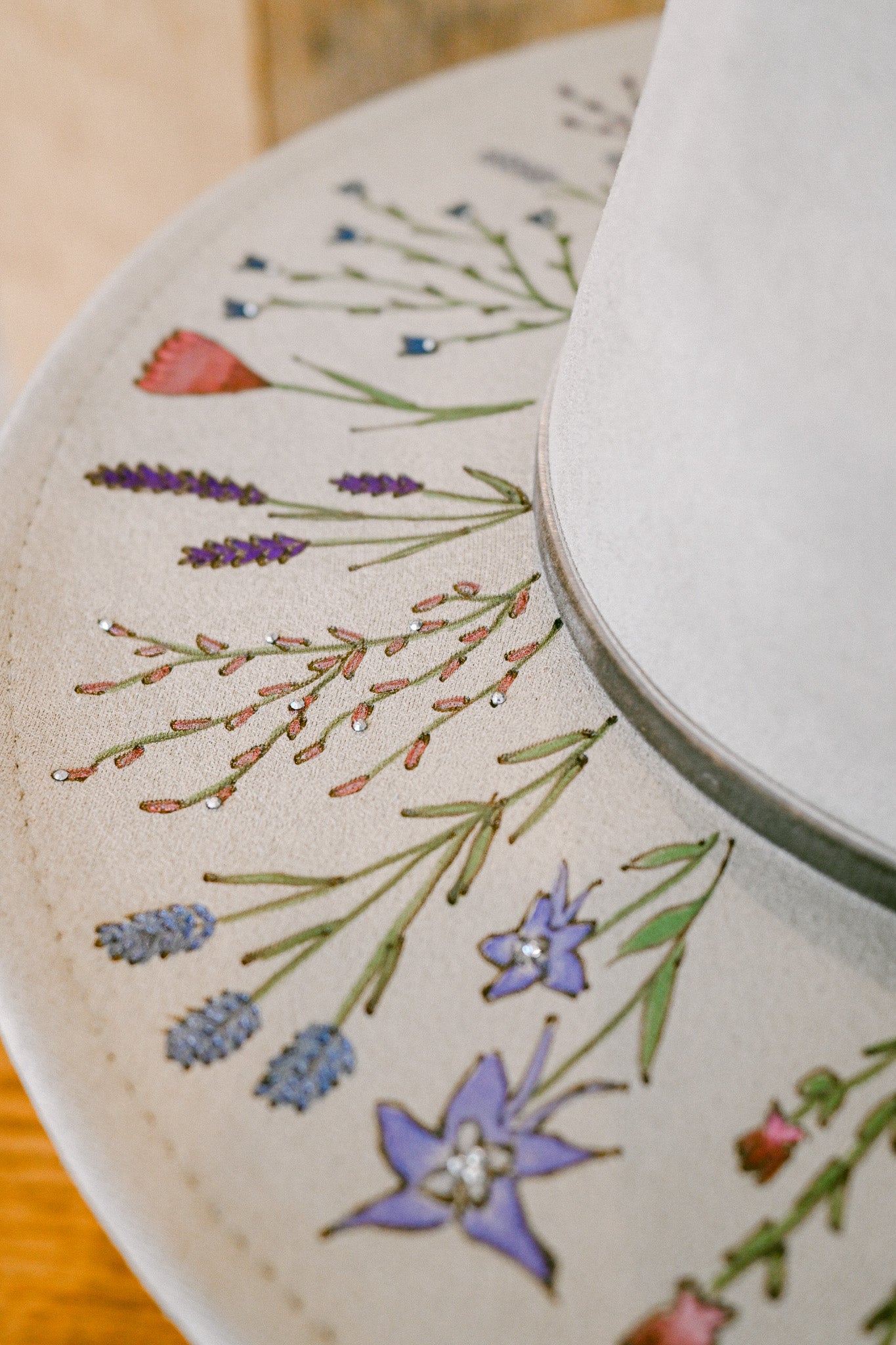 The Gemma is a one-of-a-kind hat featuring hand-burned and hand-painted Colorado wildflowers around the outer brim, on the crown, and on the inside brim. Each wildflower is meticulously burned and painted freehand on the hat by The Mercantile Ouray owner, Kelly Leggett, here in Ouray, Colorado. The Gemma is a light gray colored vegan suede flat-brim rancher hat, with an adjustable tie inside for fit. The Gemma is adorned with hand-placed crystals and a gray velvet detachable tie.