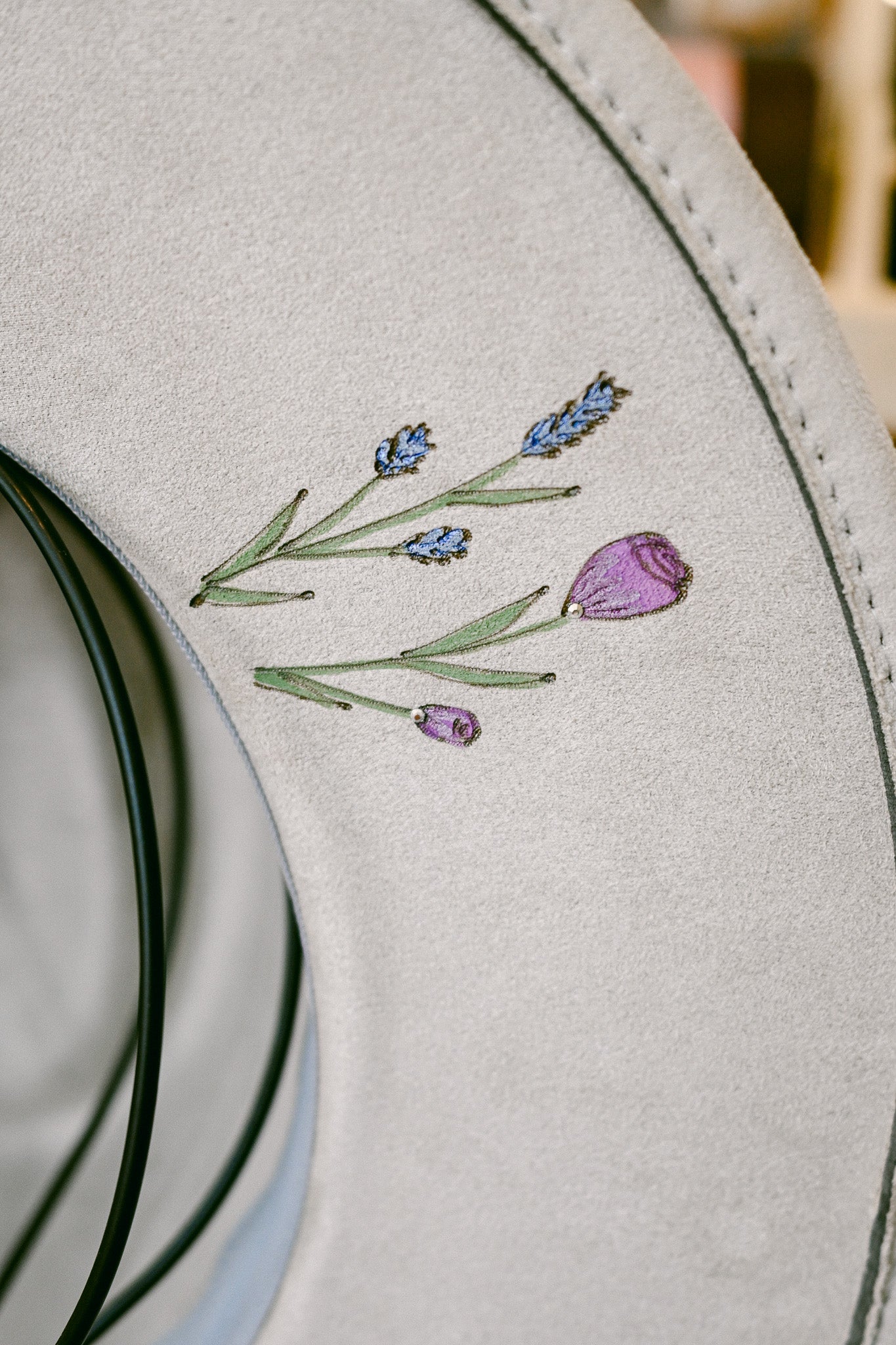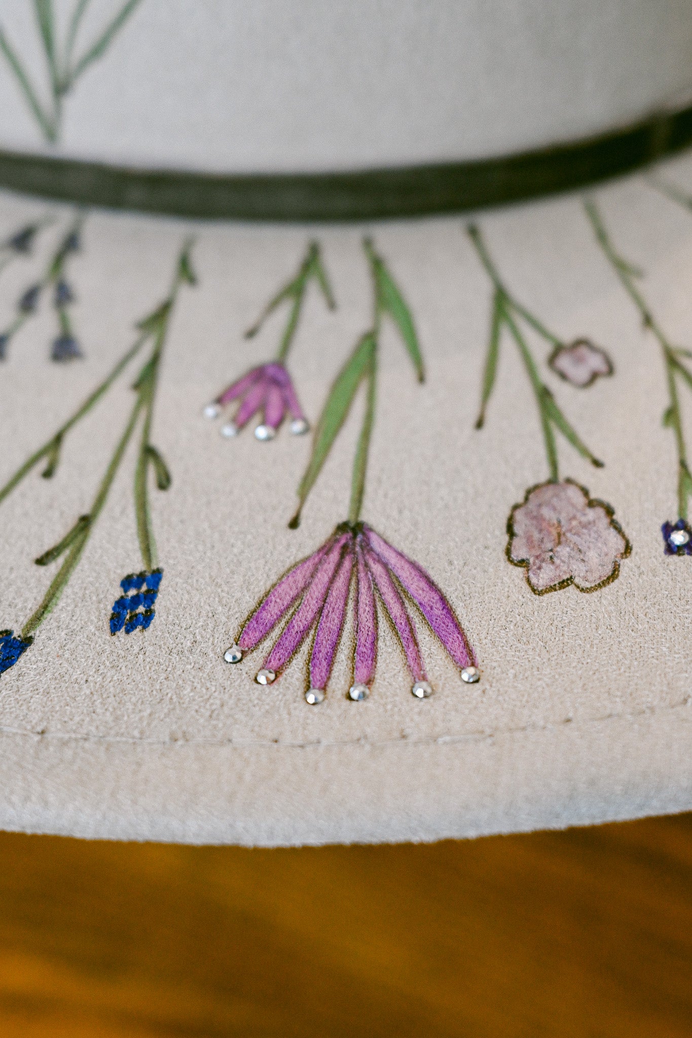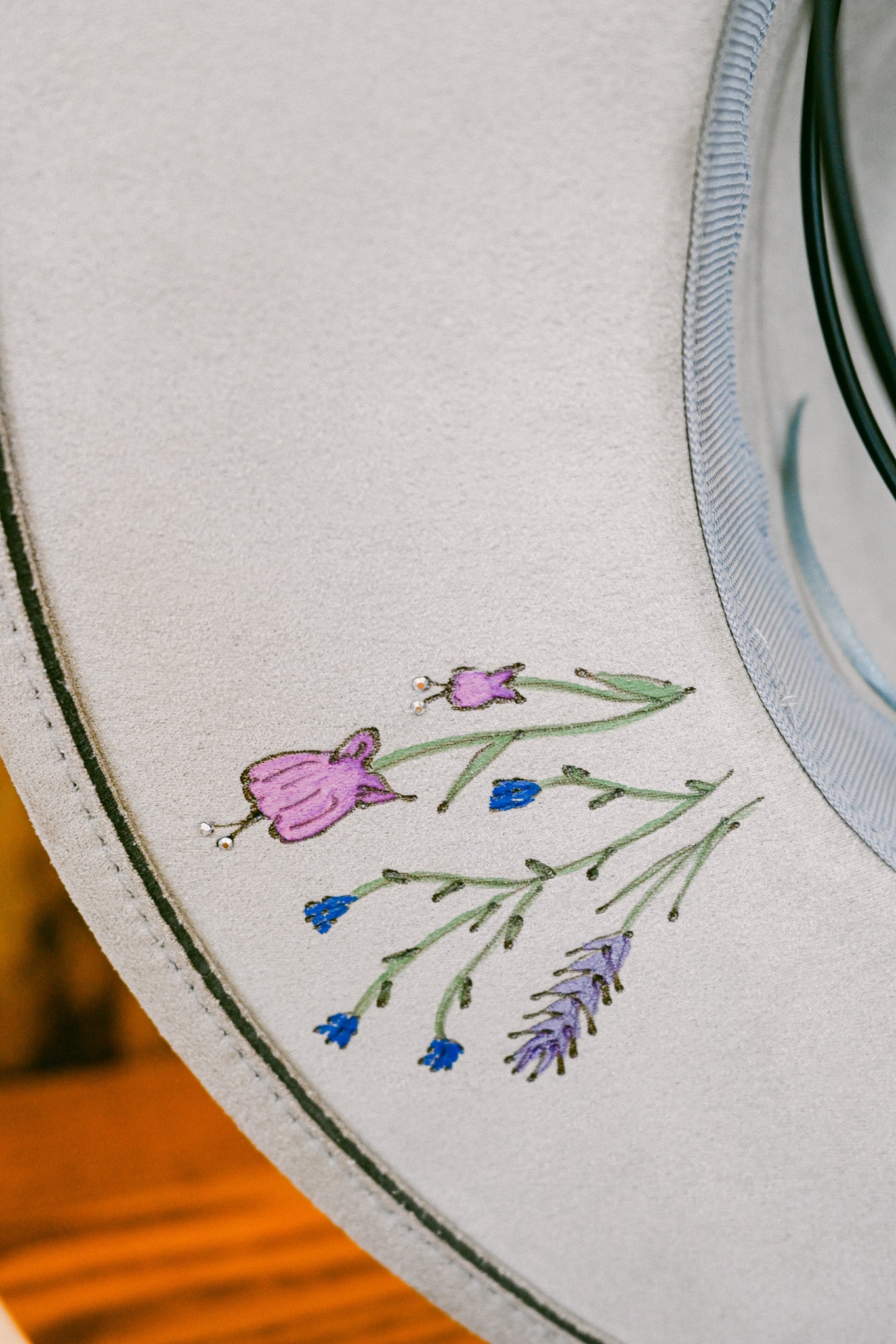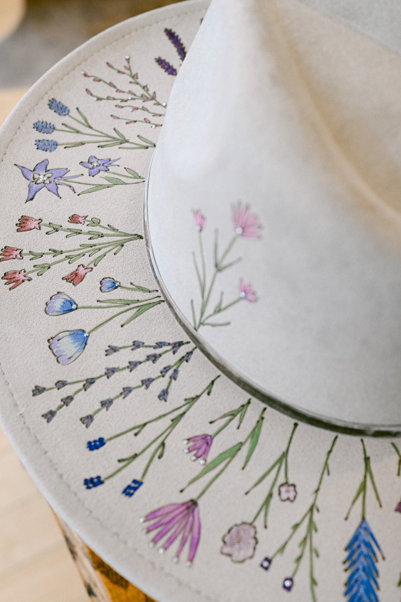 The Gemma is a one-of-a-kind hat featuring hand-burned and hand-painted Colorado wildflowers around the outer brim, on the crown, and on the inside brim. Each wildflower is meticulously burned and painted freehand on the hat by The Mercantile Ouray owner, Kelly Leggett, here in Ouray, Colorado. The Gemma is a light gray colored vegan suede flat-brim rancher hat, with an adjustable tie inside for fit. The Gemma is adorned with hand-placed crystals and a gray velvet detachable tie.
