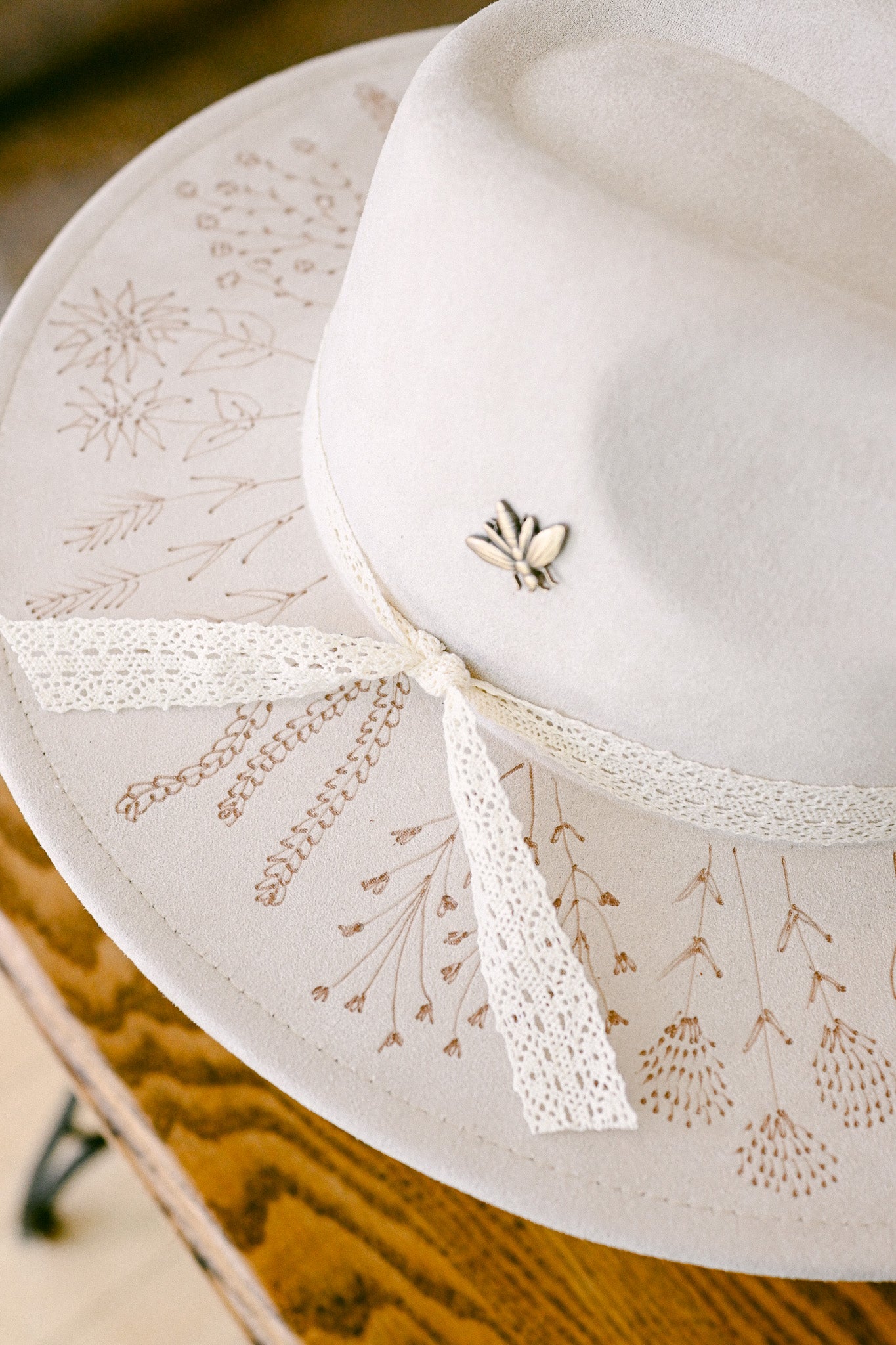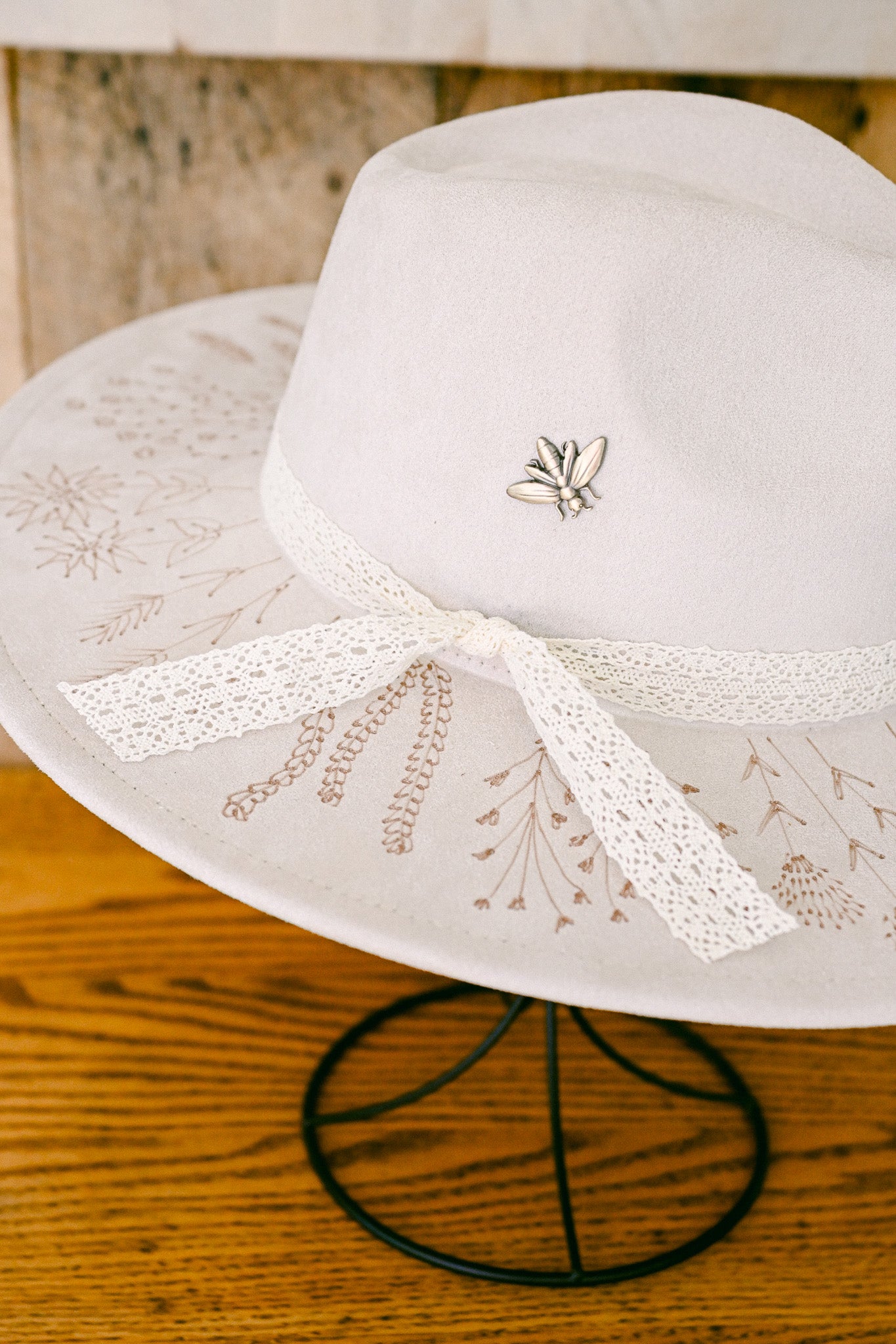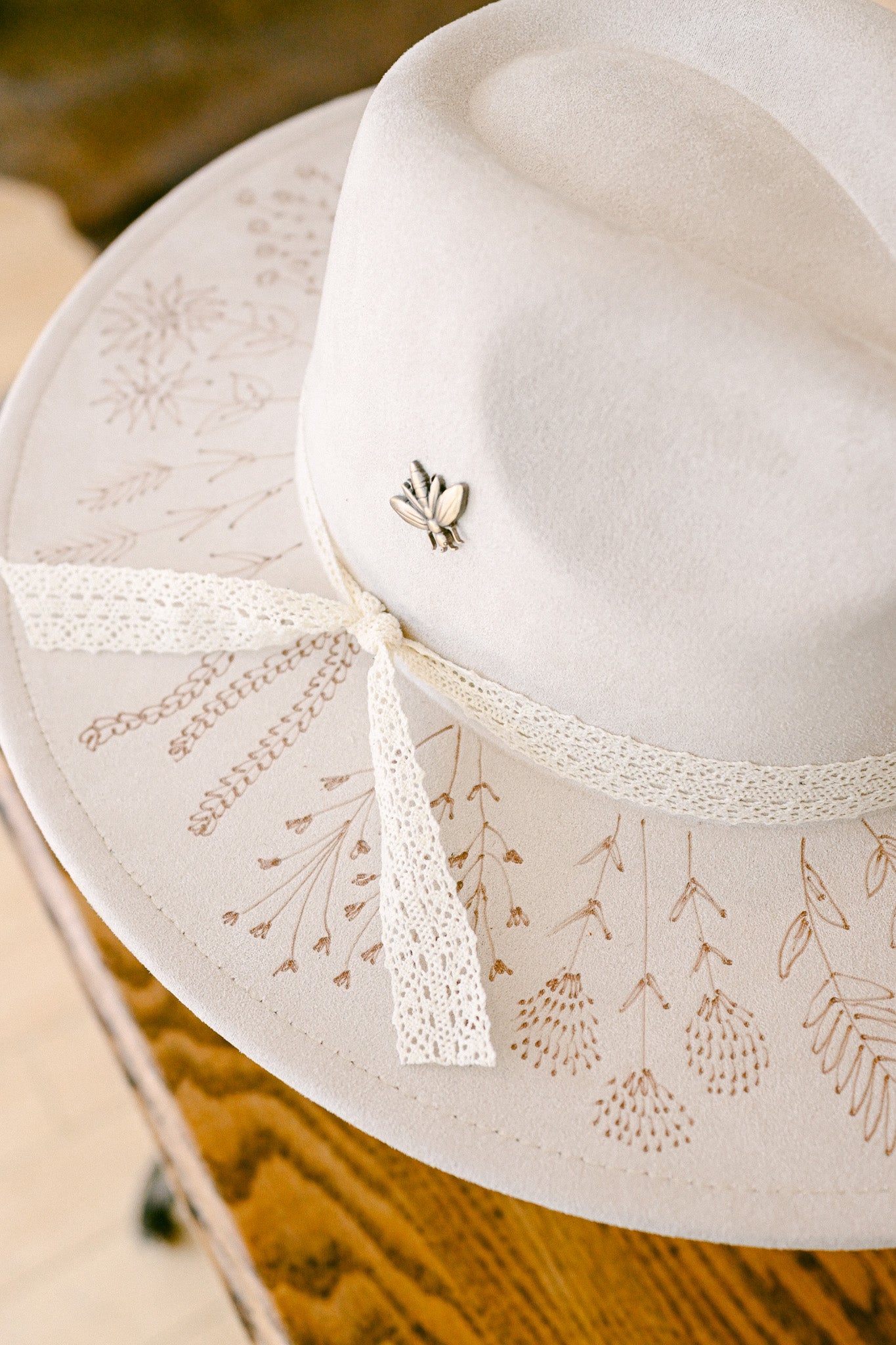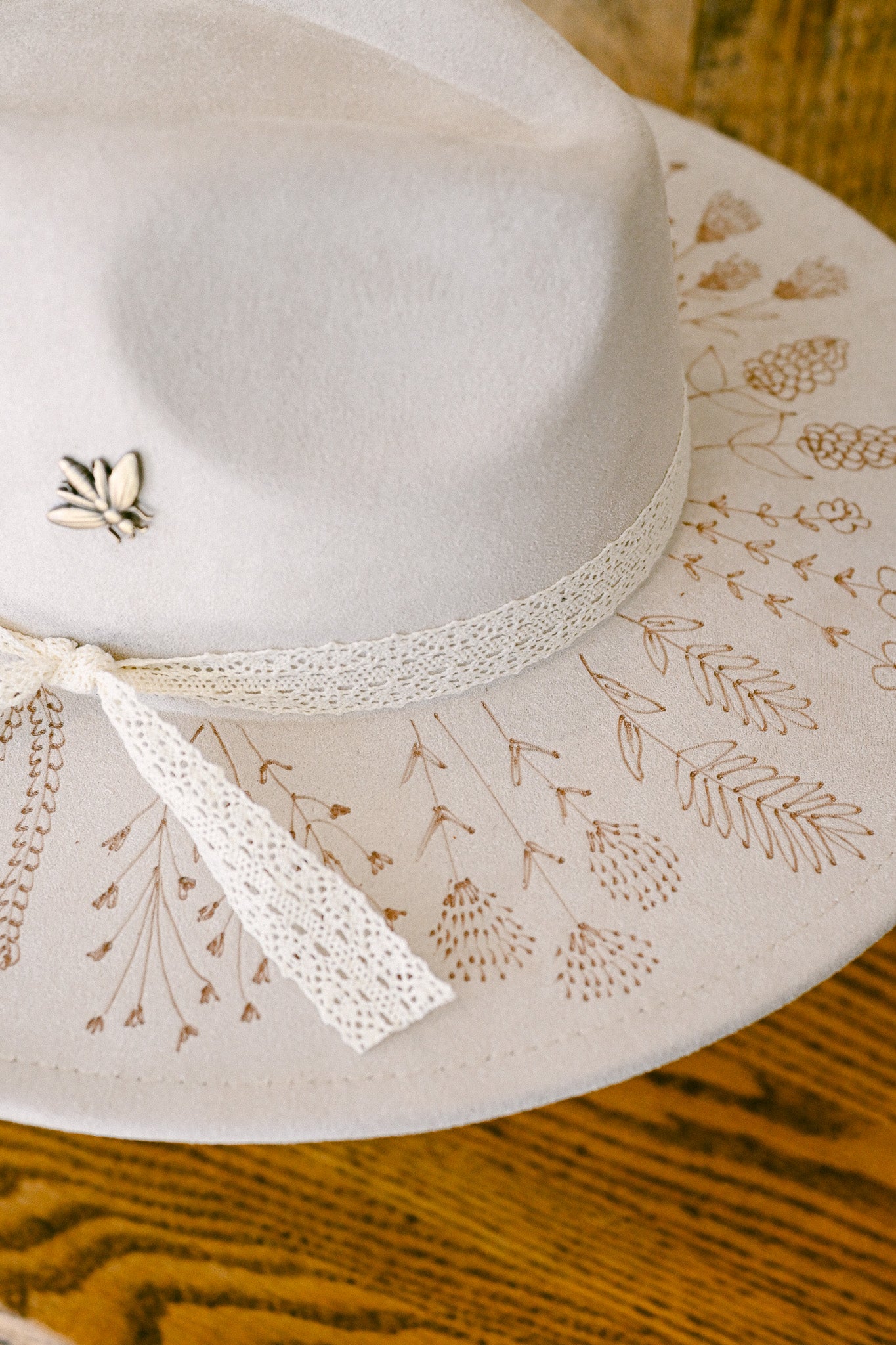 The Georgie is a one-of-a-kind hat featuring hand-burned Colorado wildflowers around the outer brim and on the inside brim. Each wildflower is meticulously burned freehand on the hat by The Mercantile Ouray owner, Kelly Leggett, here in Ouray, Colorado. The Georgie is a ivory colored vegan suede flat-brim rancher hat, with an adjustable tie inside for fit. The Georgie comes with an ivory cotton crochet detachable ribbon tie and a vintage brass bee pin.