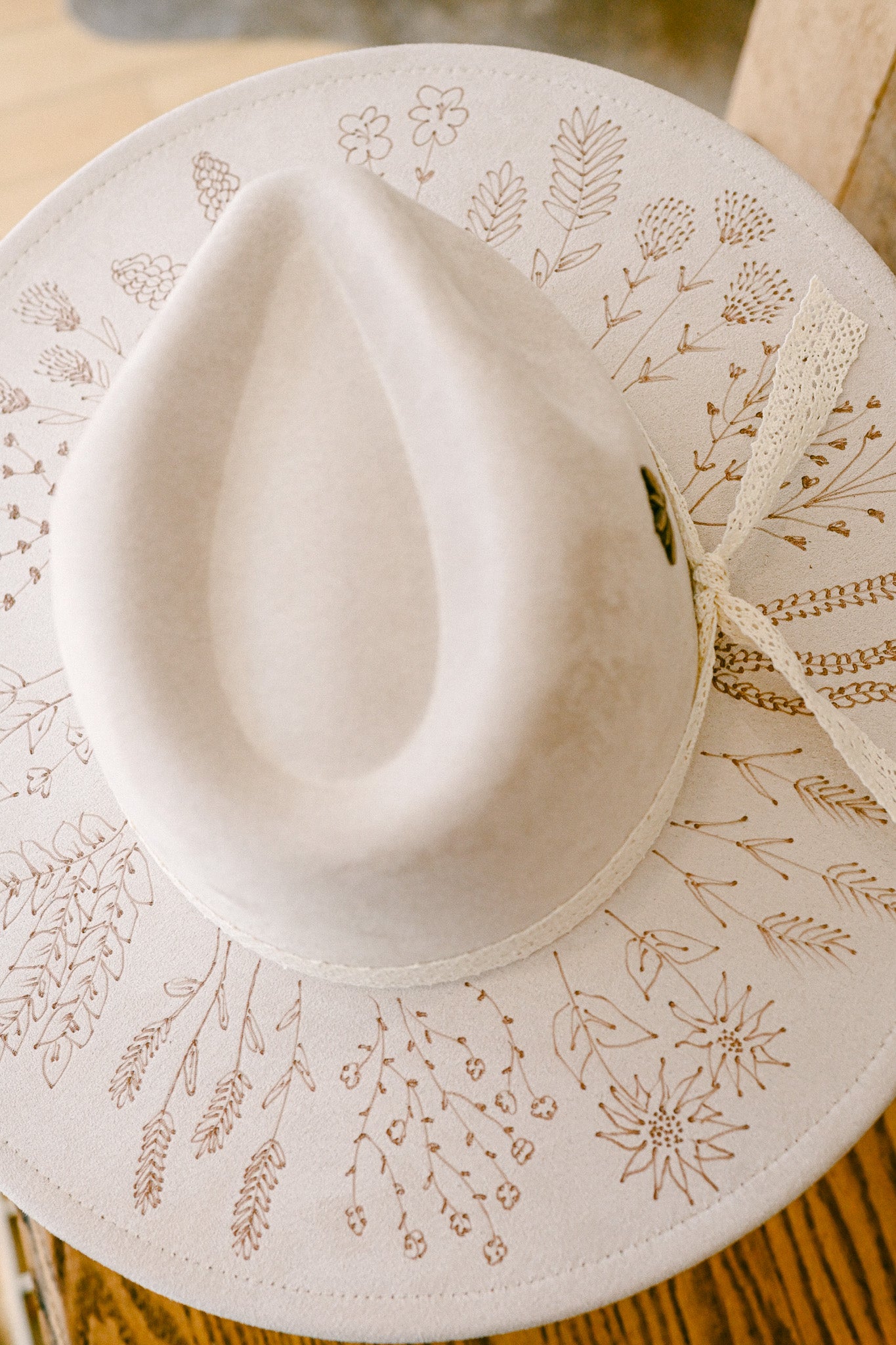 Each hand-burned wildflower hat is completely unique and one-of-a-kind, and therefore not returnable or exchangeable.
