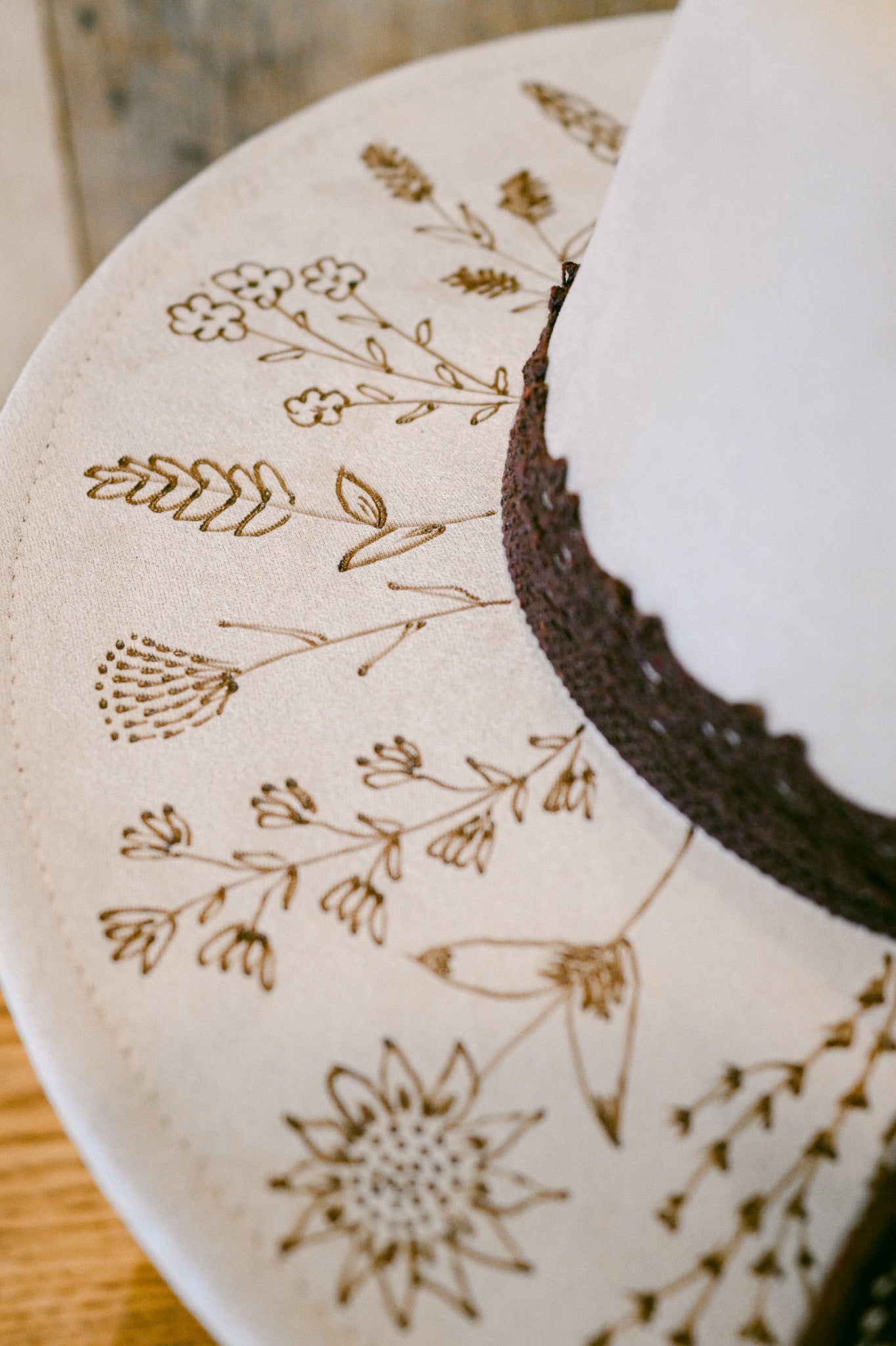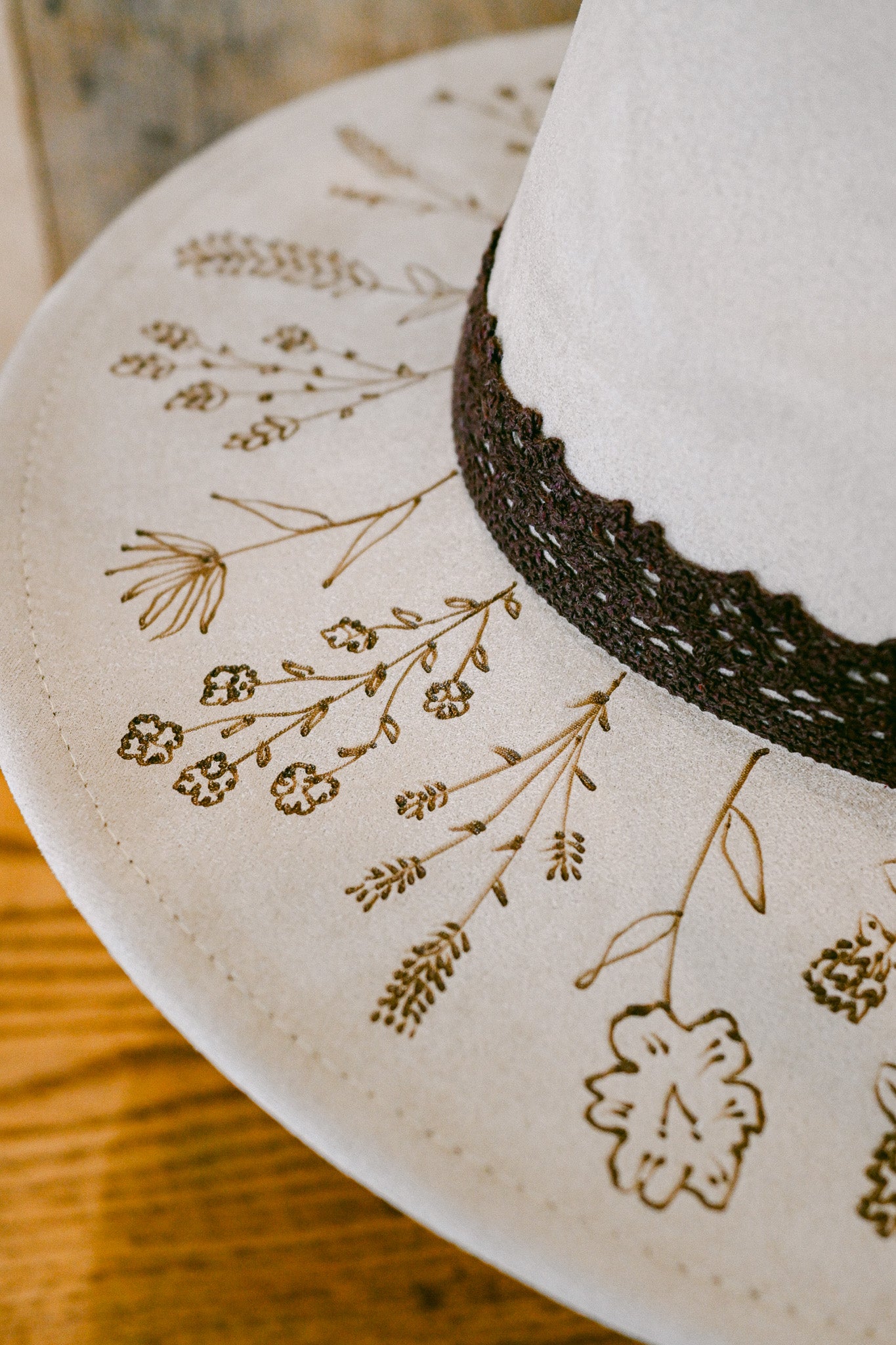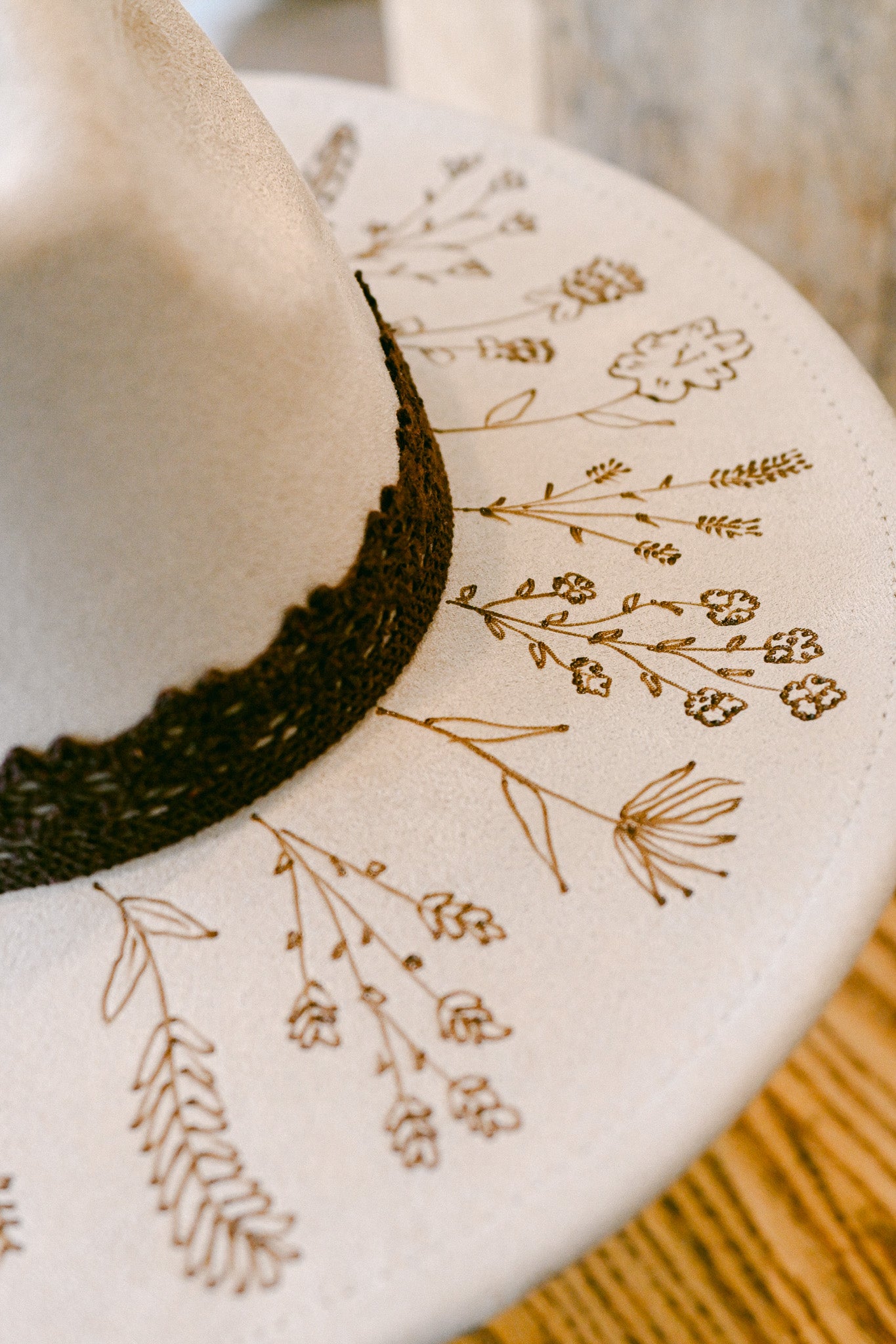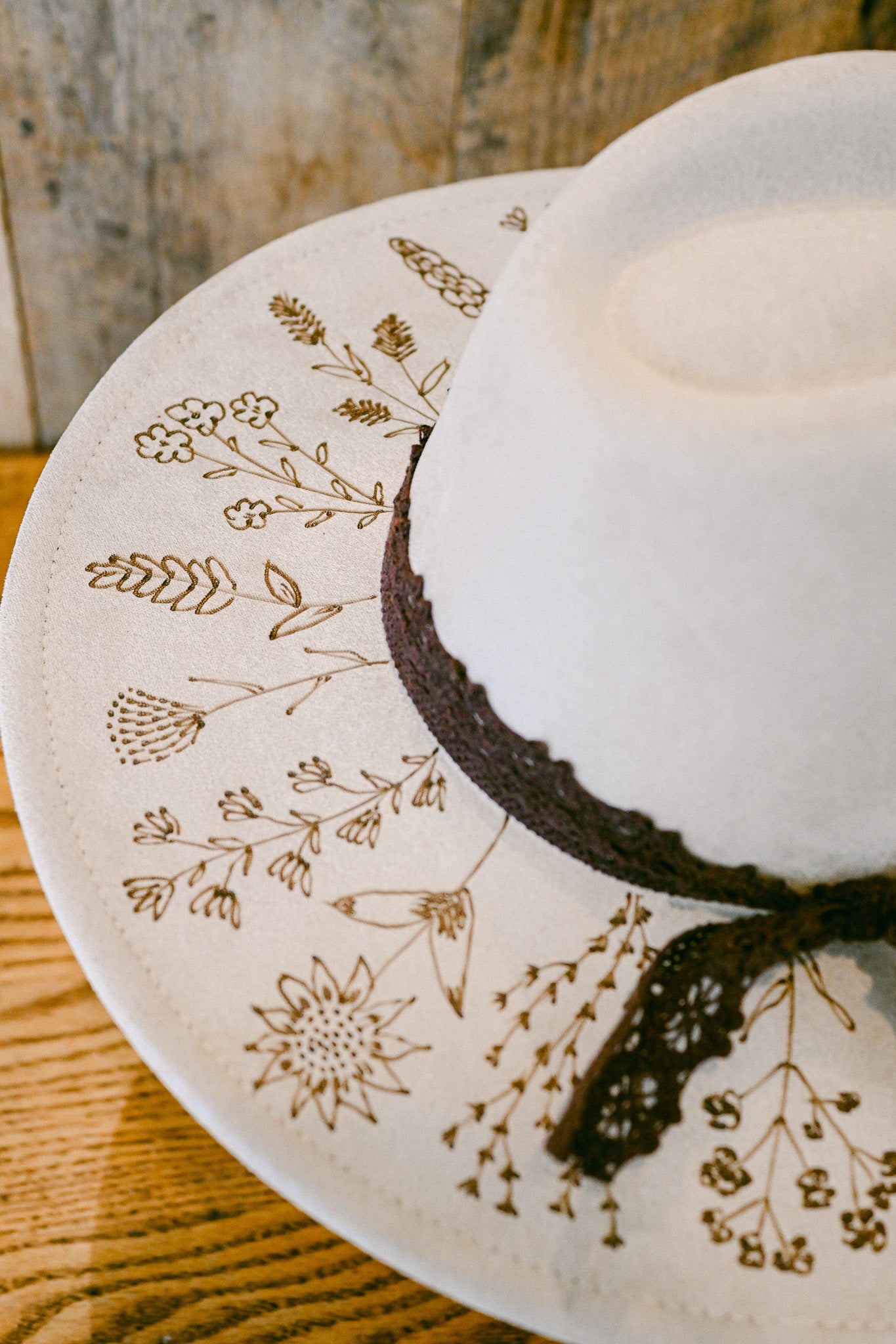 Each hand-burned wildflower hat is completely unique and one-of-a-kind, and therefore not returnable or exchangeable.