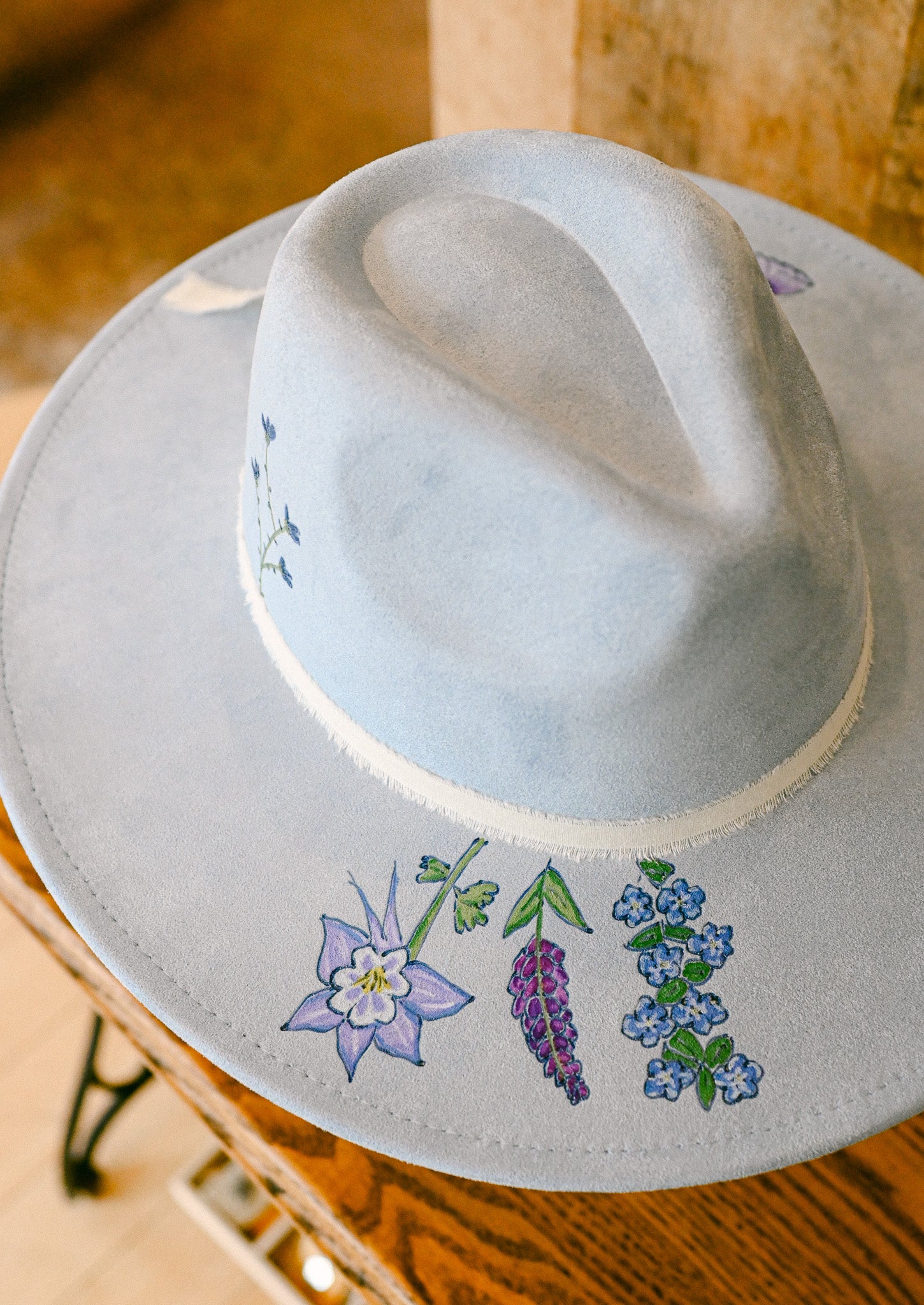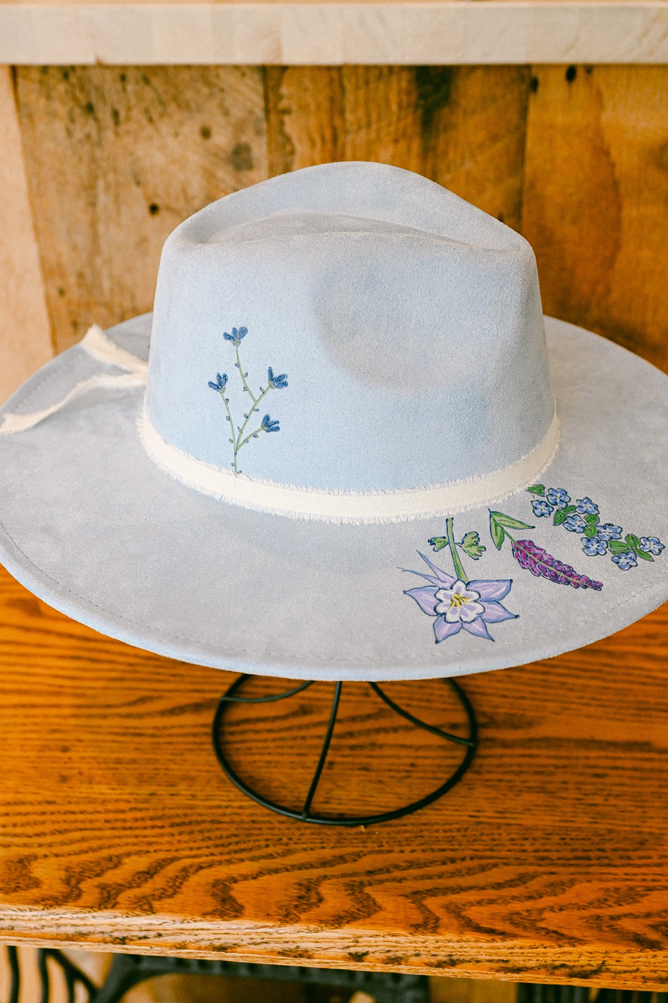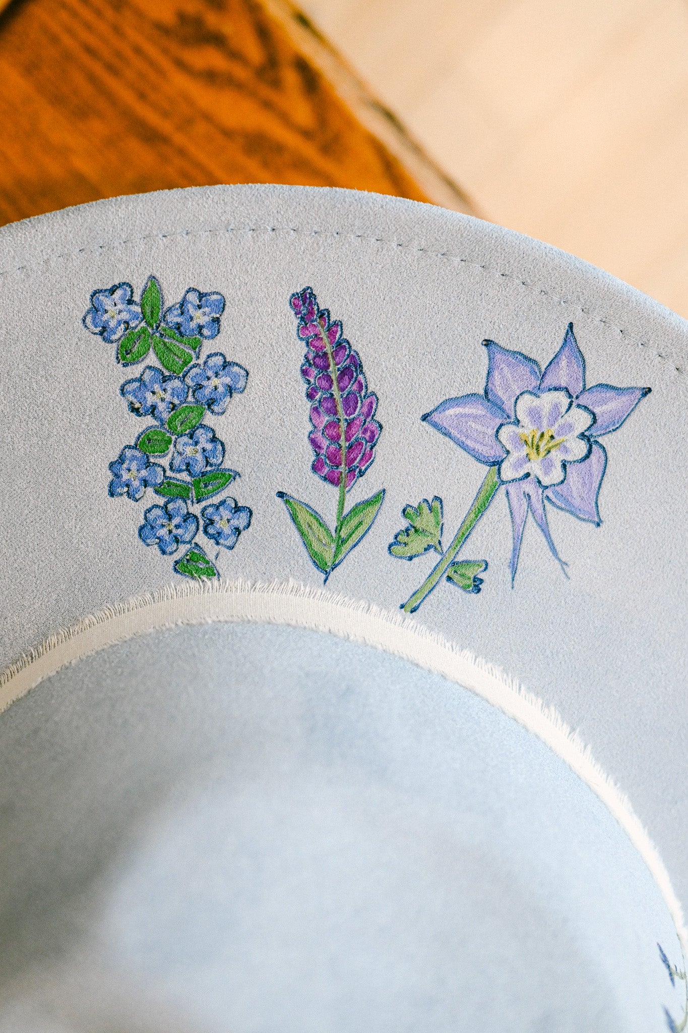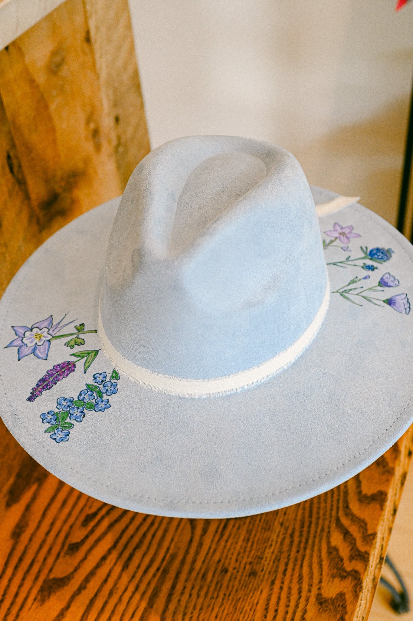 The Mae is a one-of-a-kind hat featuring hand-burned and hand-painted Colorado wildflowers on the brim and crown. Each wildflower is meticulously burned and painted freehand on the hat by The Mercantile Ouray owner, Kelly Leggett, here in Ouray, Colorado. The Mae is a sky blue colored vegan suede flat-brim rancher hat, with an adjustable tie inside for fit. The Mae comes with an ivory frayed cotton detachable ribbon tie.