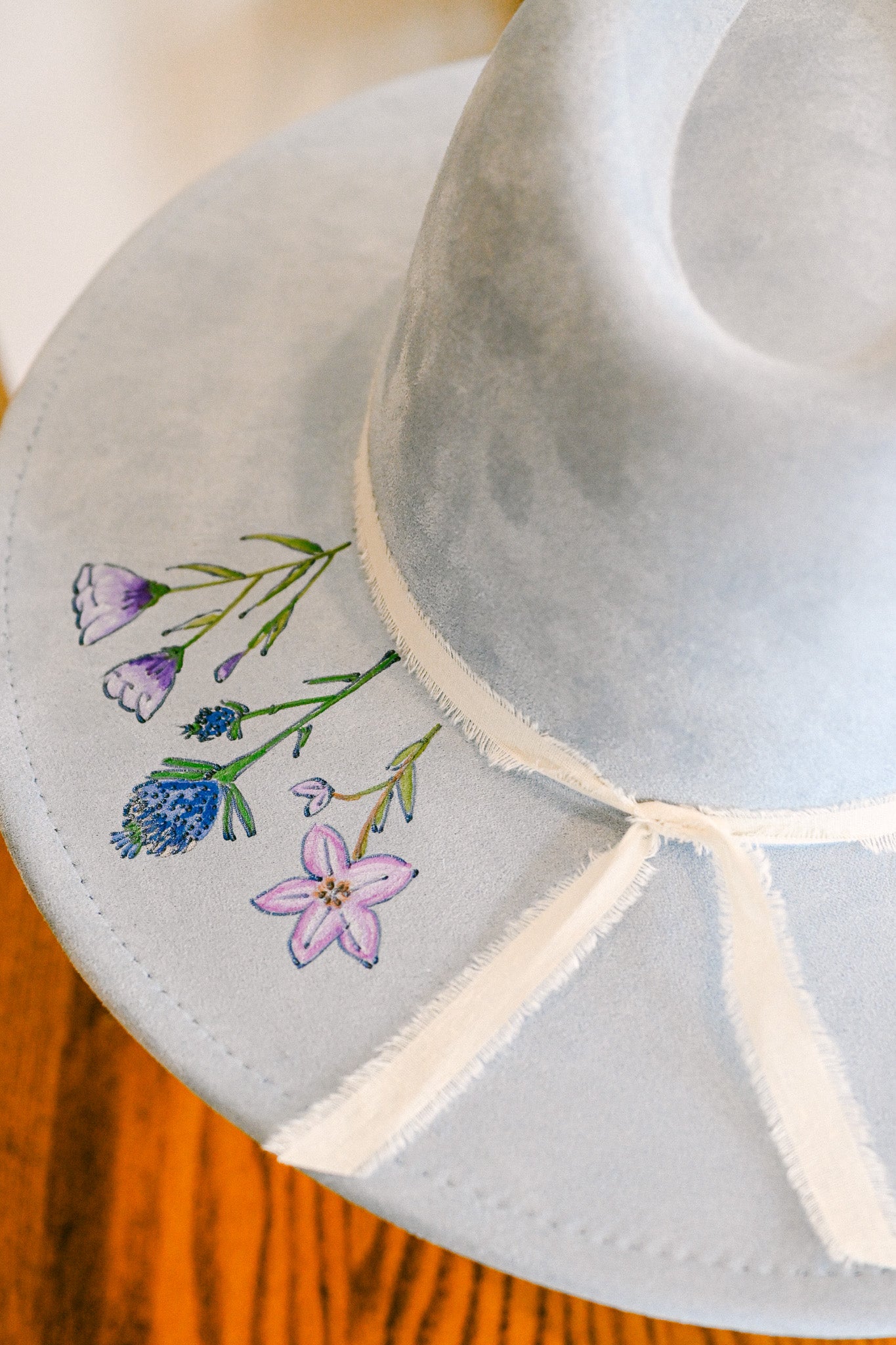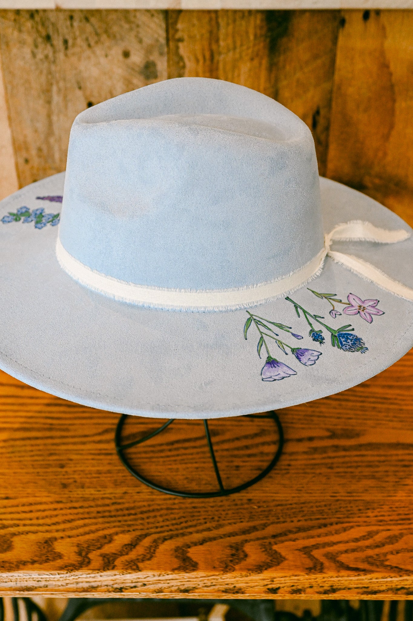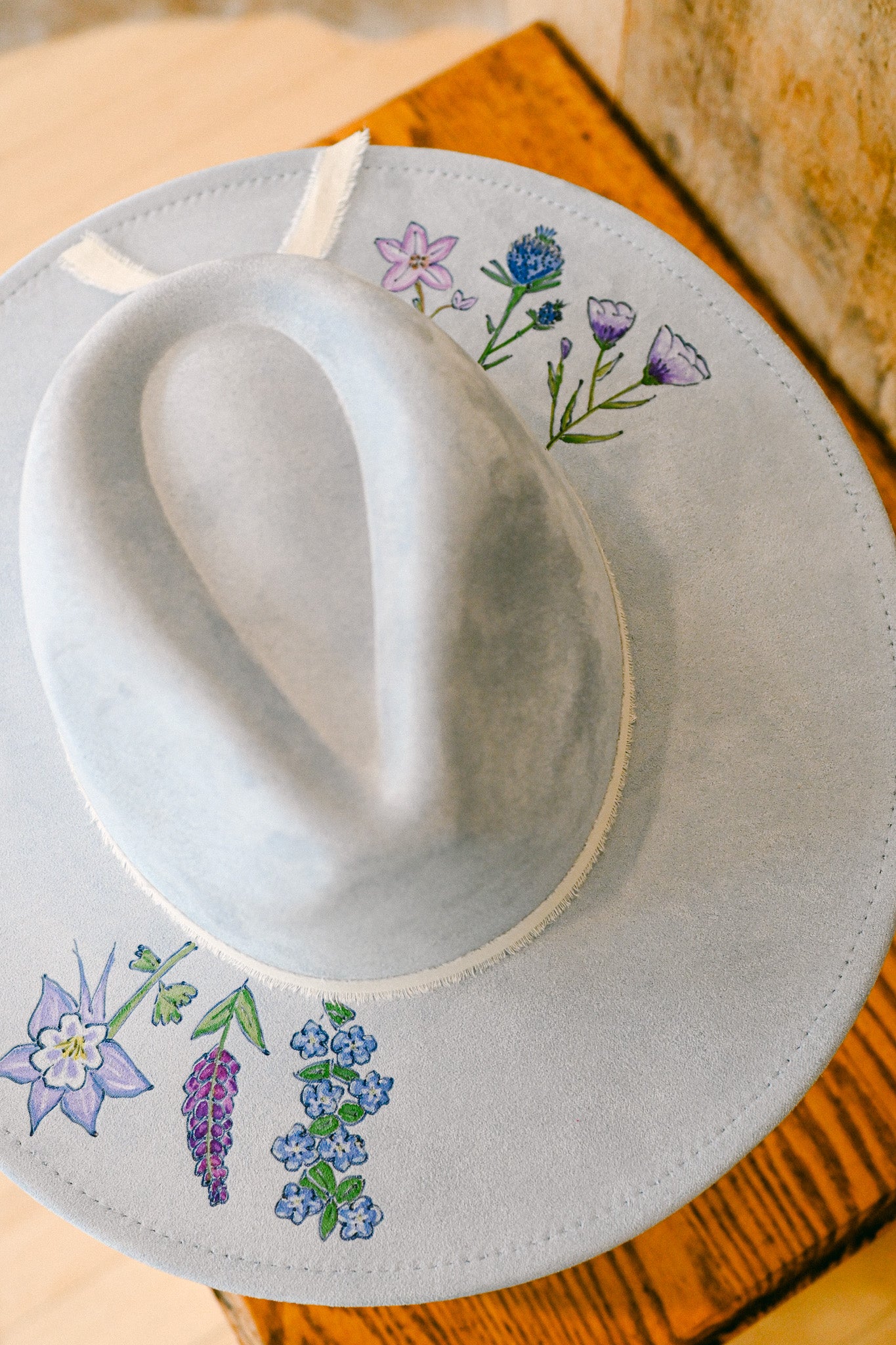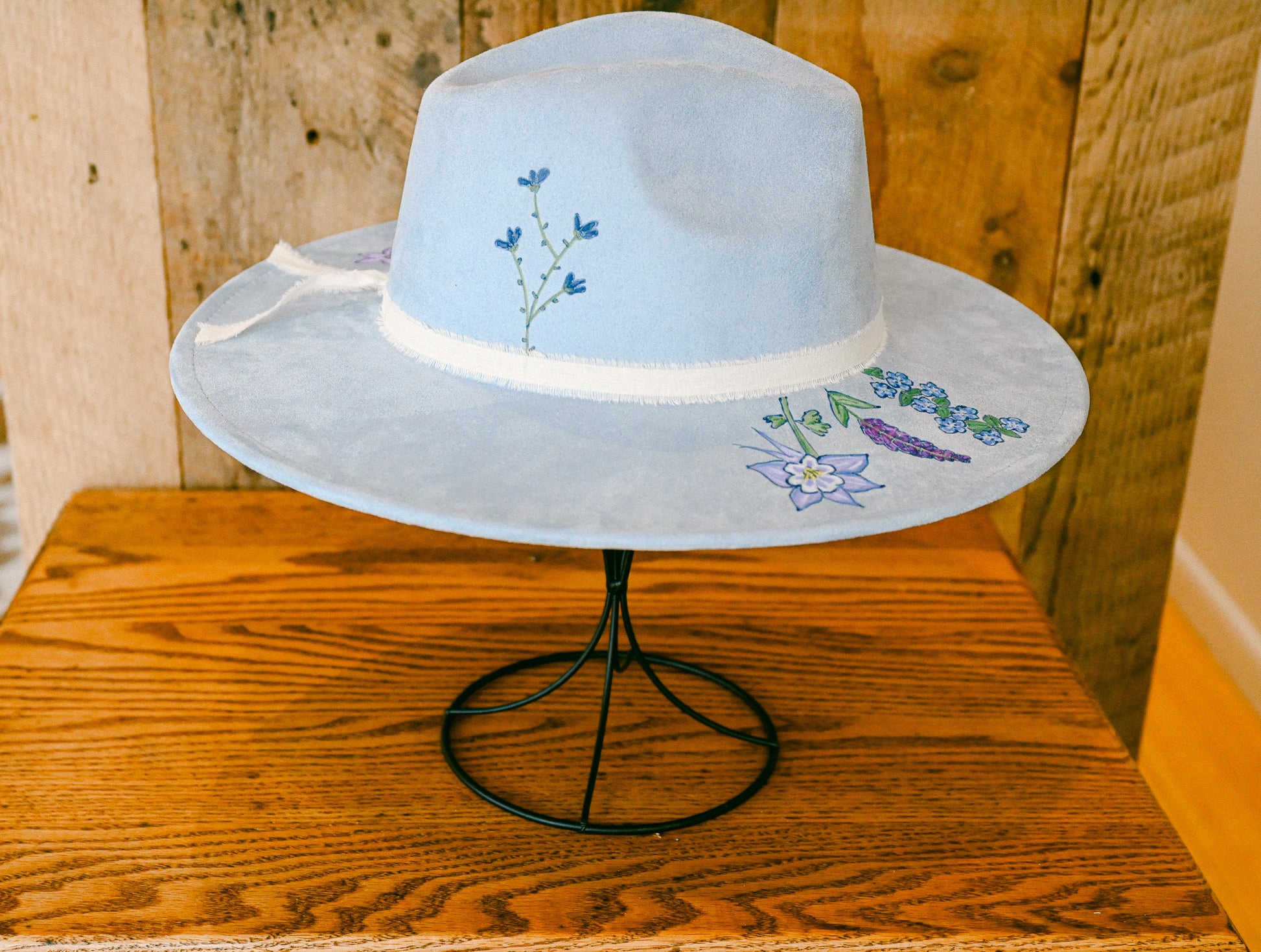 The Mae is a one-of-a-kind hat featuring hand-burned and hand-painted Colorado wildflowers on the brim and crown. Each wildflower is meticulously burned and painted freehand on the hat by The Mercantile Ouray owner, Kelly Leggett, here in Ouray, Colorado. The Mae is a sky blue colored vegan suede flat-brim rancher hat, with an adjustable tie inside for fit. The Mae comes with an ivory frayed cotton detachable ribbon tie.