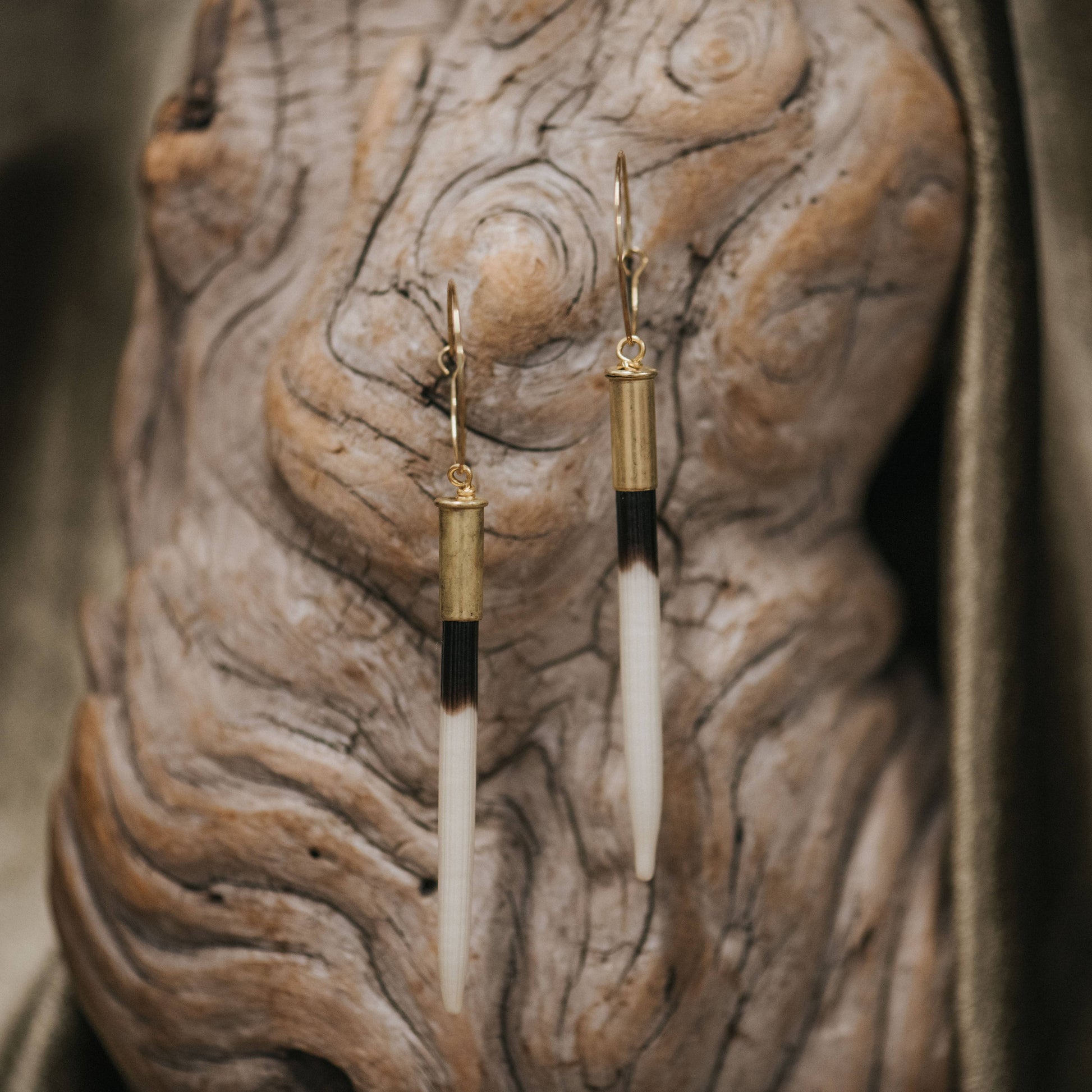 As seen in Yellowstone Season 5 Episode 3, worn by character Beth Dutton (Kelly Reilly), natural porcupine quills are set in recycled .22 bullet casings hung from 1” brass hoops. If you’re looking for the same variation as Beth’s, please select “Short” and “Predominantly White” in the variants. • Length is measured from top of bullet casing to bottom of quill • Quill coloring and length varies (45 - 80mm). • Quills are naturally shed, and have been sanded smooth to avoid injury *Beth Dutton (Kelly Reilly) Image Credit: Paramount Network