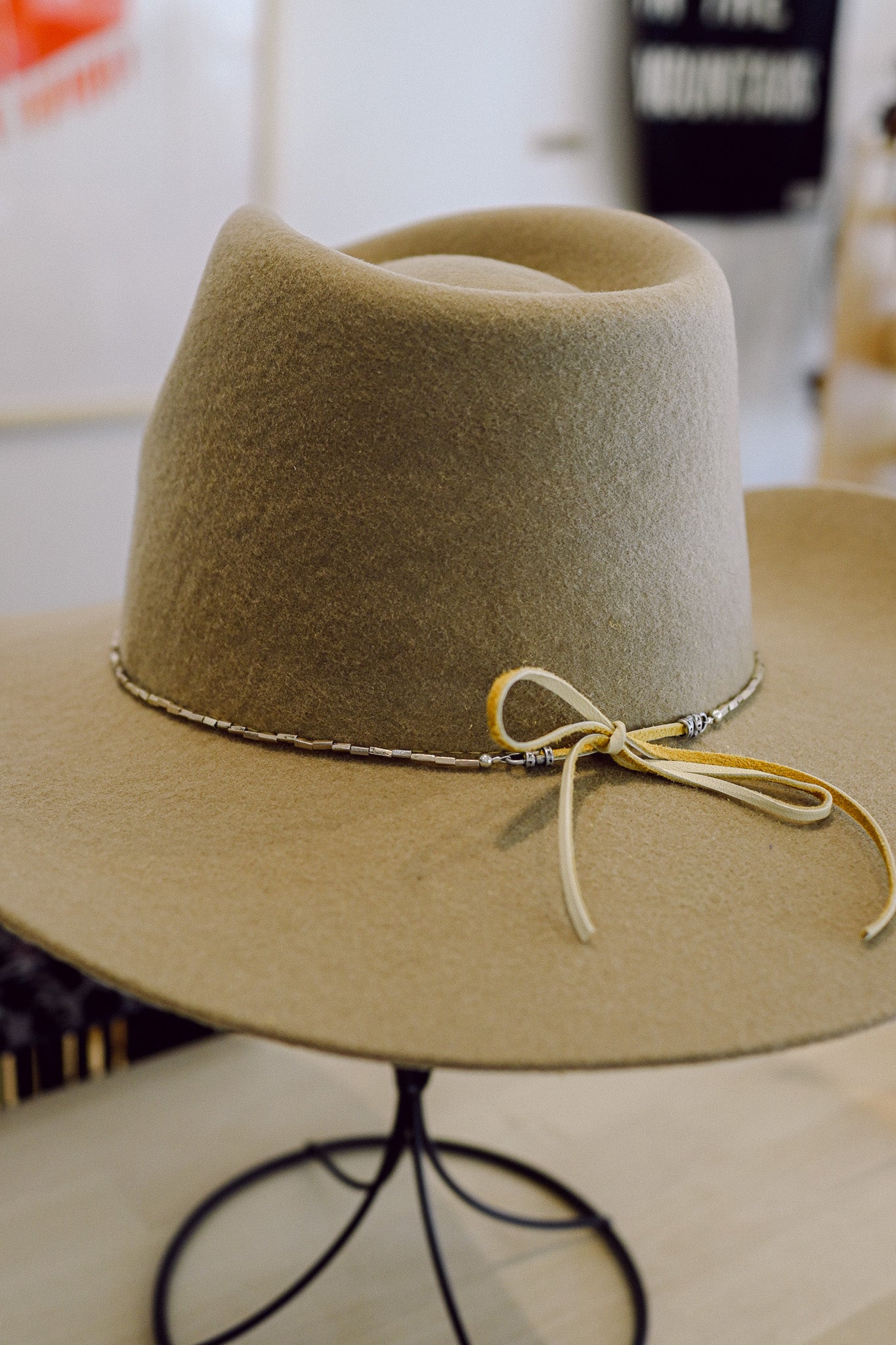 Silver tube beaded hat band with three freshwater pearl silver bezel focal point. Secured on the hat with a deerskin tie. Made at The Mercantile Ouray in Ouray, Colorado.