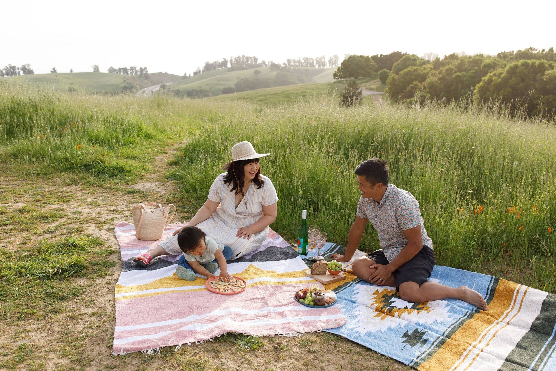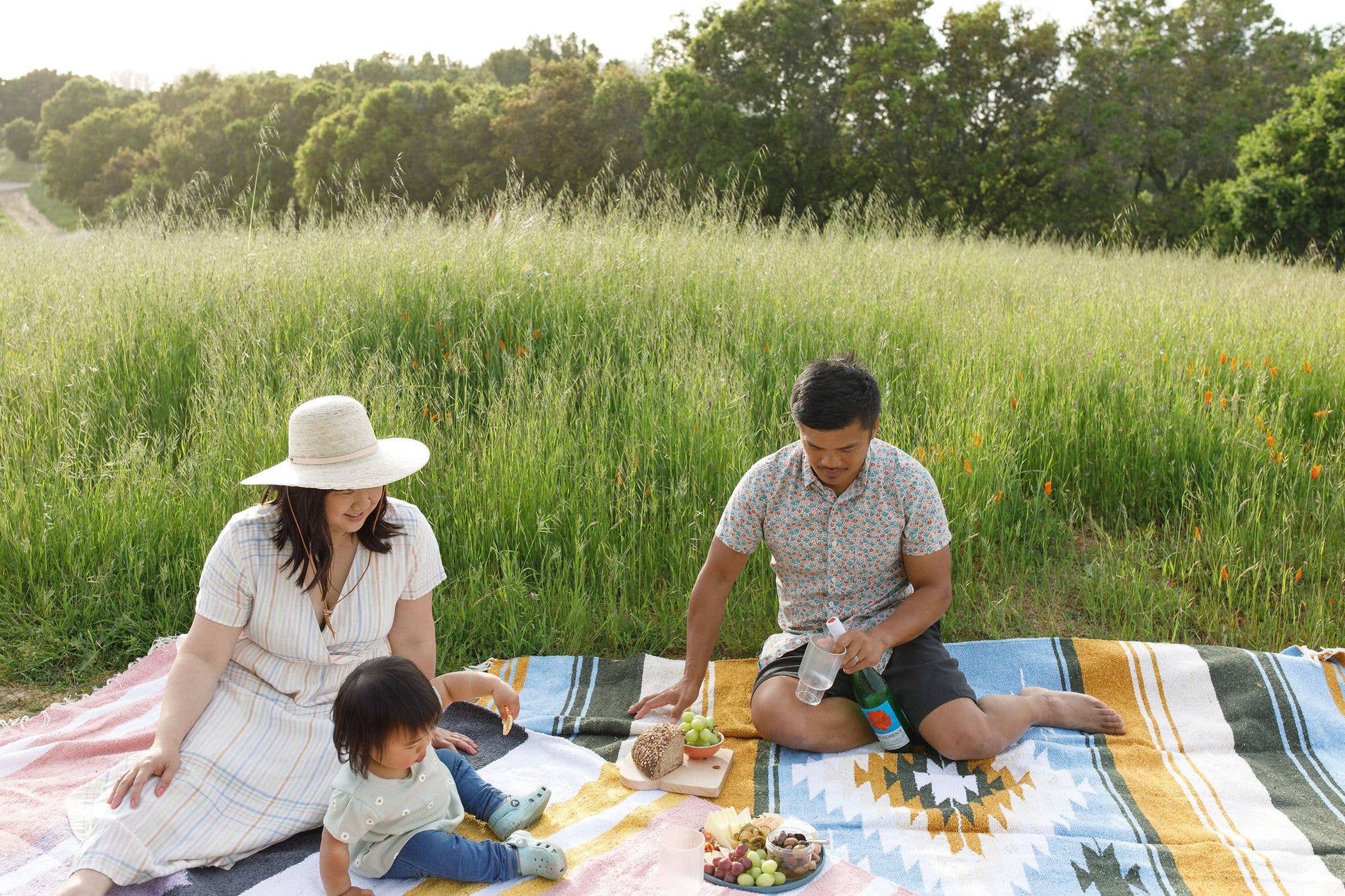 A deep forest green paired with the bright sky blue and golden yellow brings together the classic and comforting colors of nature. Your new blanket comes rolled up with a handmade leather strap, making it ready for any adventure. They are big enough for a 2 - 4 person picnic and roll up in thirds for easy transport. These original blanket designs are created in California and hand woven in Mexico by skilled artisans. The leather straps are hand-made out of vegetable-tanned leather that ages nicely with use. Blankets are machine washable on cold gentle cycle, lay flat to dry. Dimensions: Unfolded: 83" x 51" Rolled: ~ 16.5" x 6.5"