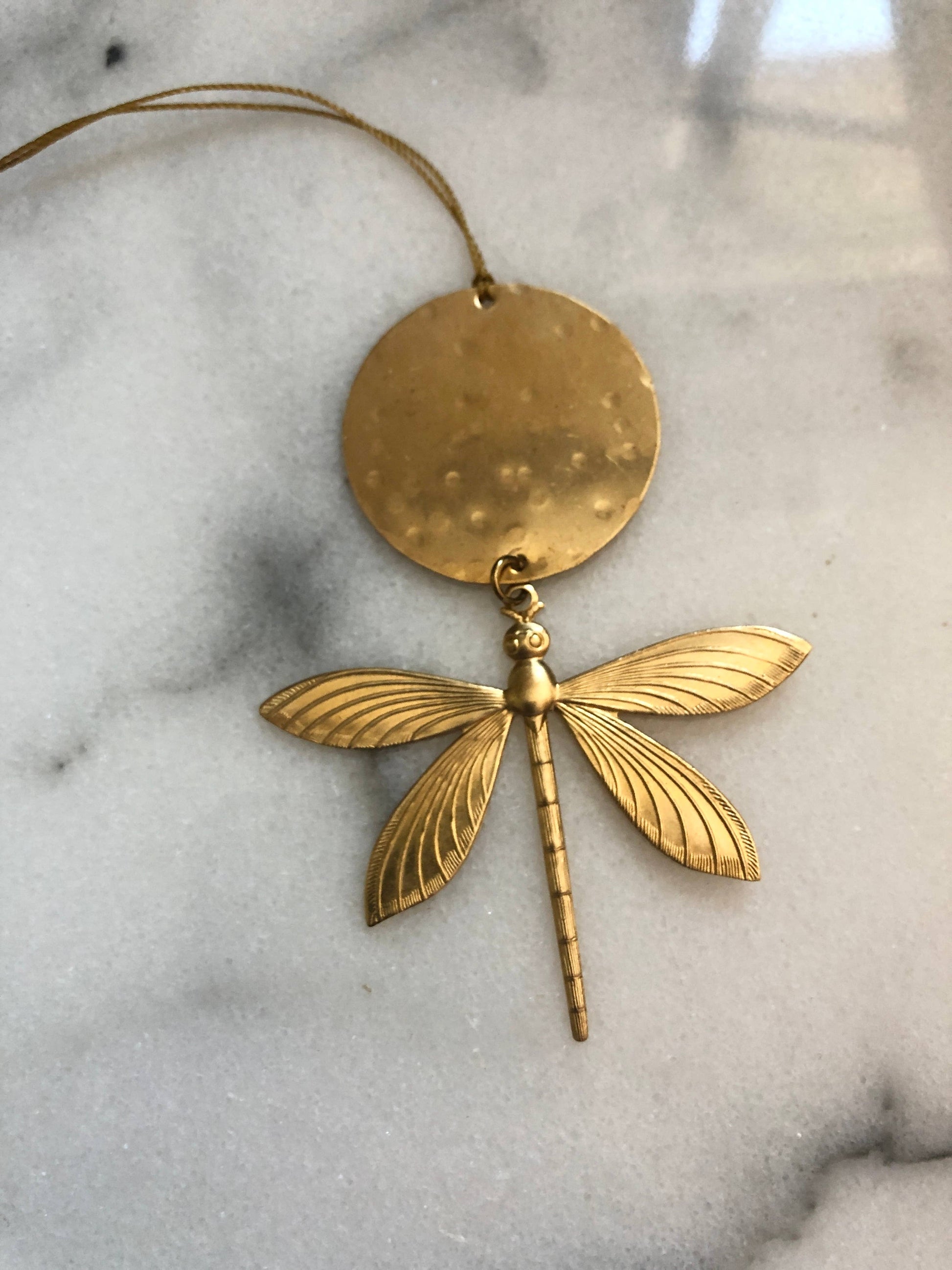 Vida + Luz artisan-crafted dragonfly ornament made from hand-cut and hammered brass sheet and vintage faceted glass crystal. Ready to hang. Dimensions: ornament measures roughly 6” tall x 3” wide with hanging cord. **Please note: our pieces are made by hand by our team of women artisans from hand-cut and hammered brass. Slight inconsistencies, imperfections and the natural beauty of brass and driftwood are what make our pieces unique. Product Notes: Please be aware that raw brass naturally tarnishes over time; a paste of baking soda and lemon juice applied with a cloth will shine it back up in no time.