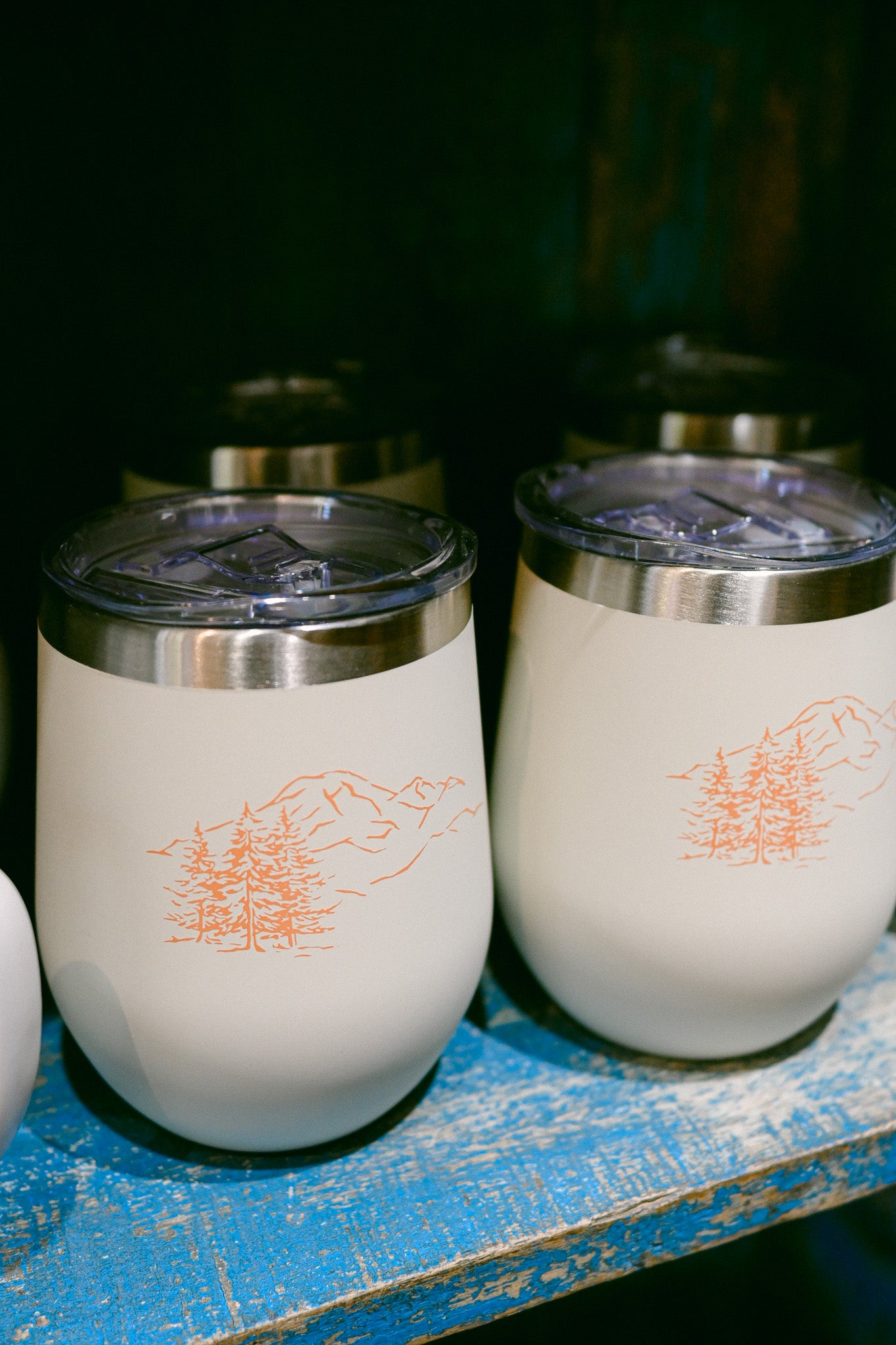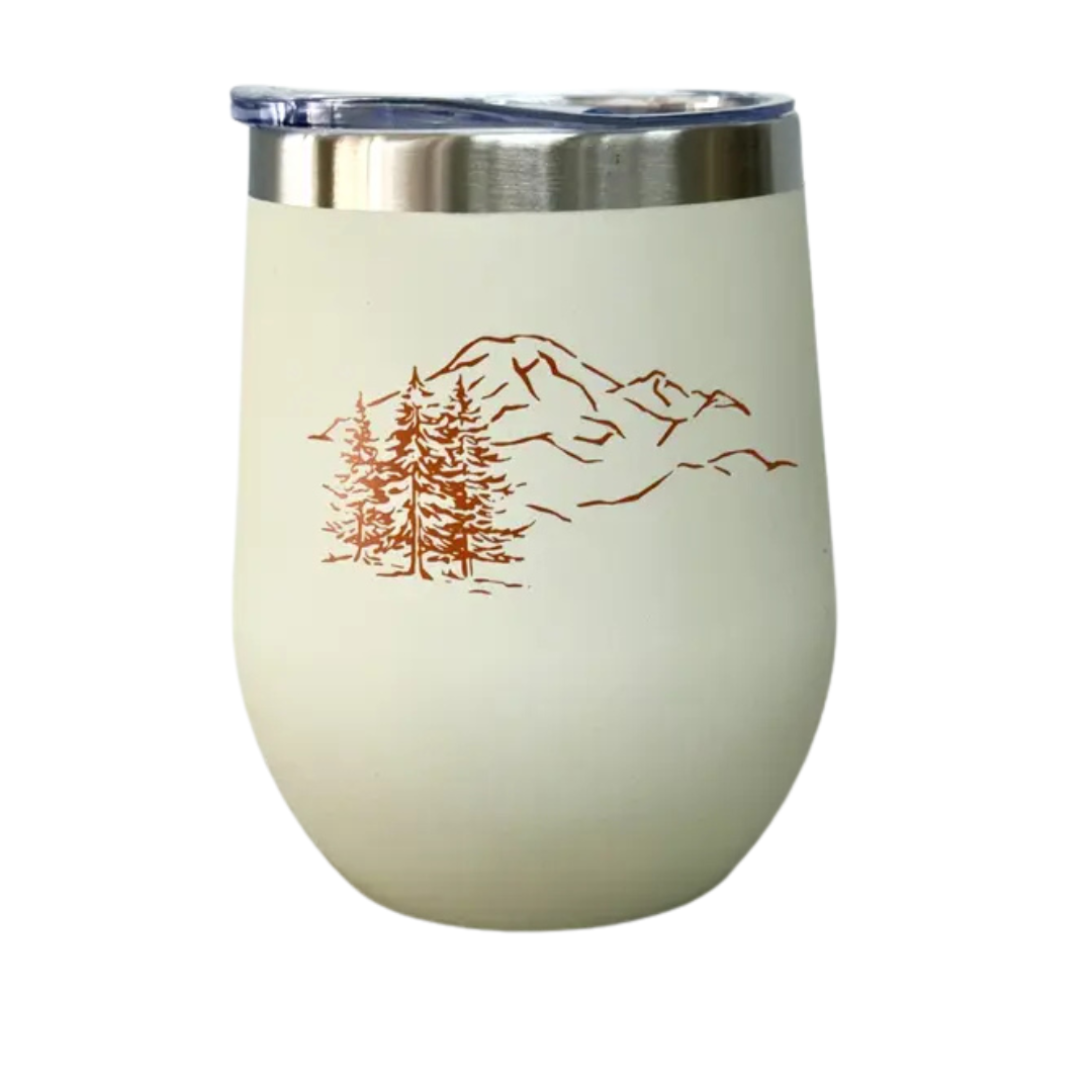 Enjoy the great outdoors with this wilderness inspired 12-ounce stainless steel wine tumbler. Our beverage container is rubber coated for a luxurious hand feel and no-slip grip. It features a removable plastic lid and is insulated to keep beverages hot or cold. Off-white with terracotta rust-colored tree and mountain graphic.