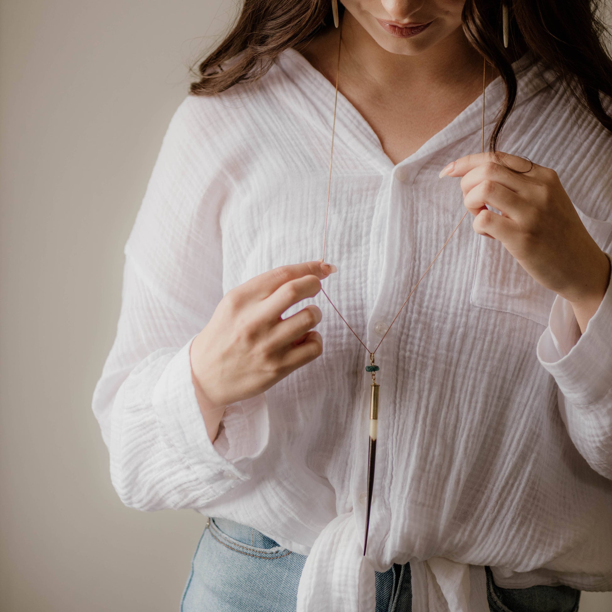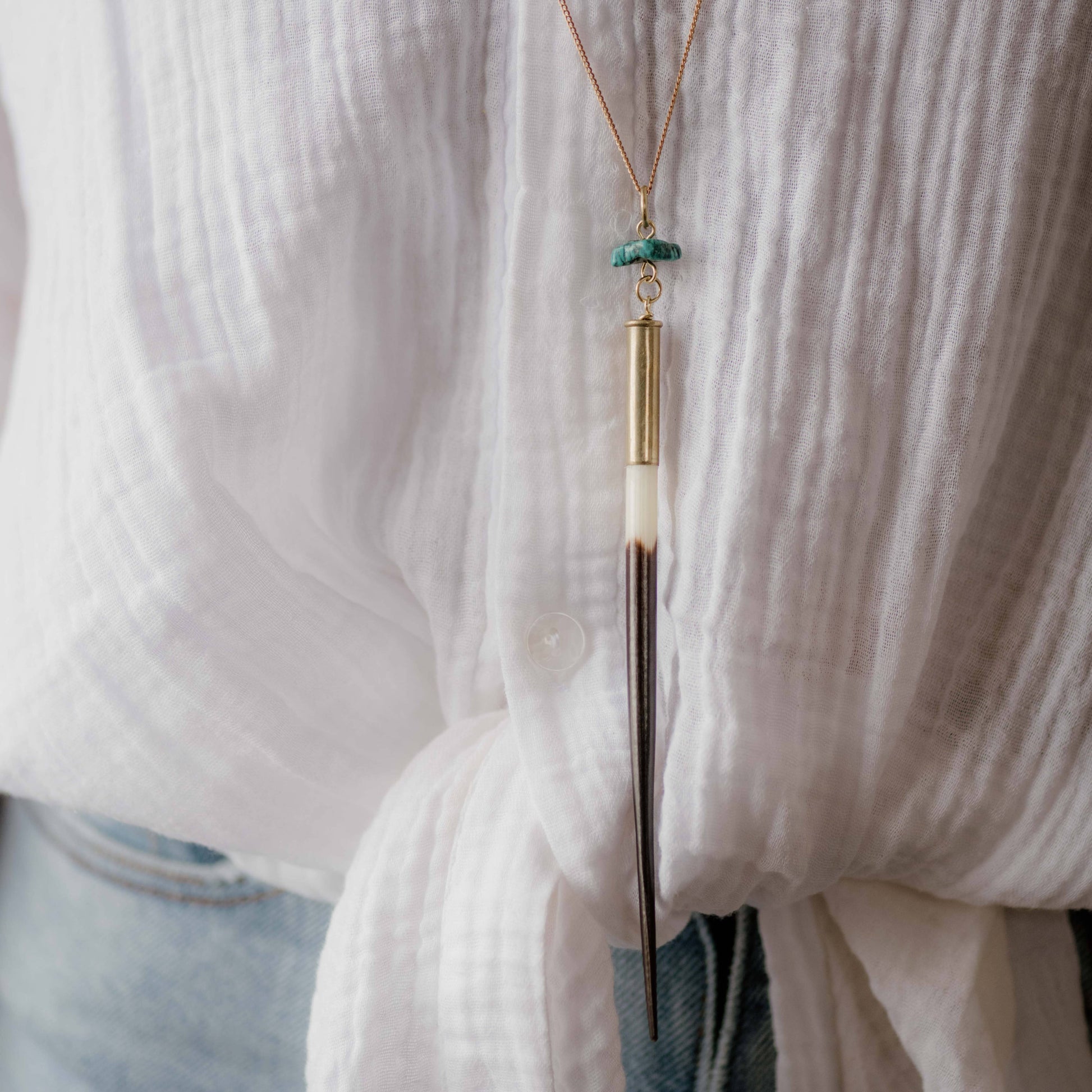 A natural porcupine quill set in a recycled .22 magnum bullet casing with American turquoise. 32" solid brass chain. Quill length varies (4 in - 6 in) and is measured from the top of the bullet casing to bottom of the quill. Quills have been sanded smooth to avoid injury. By Commonform and made in Montana.